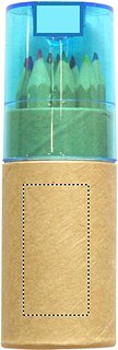 12 Buntstifte in einer Schachtel. Transparenter Deckel mit Bleistiftspitzer.