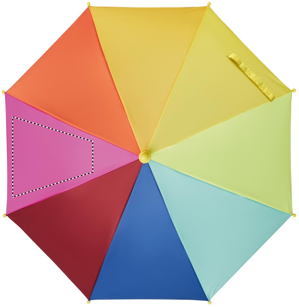 18'''' Regenschirm für Kinder aus 190T Pongee mit Regenbogenmuster. 8 Segmente. Stock und Stangen aus Fiberglas. Spitzen und Griff aus Kunststoff. Gebogener Griff. Manuelle Öffnung und Schliessung.