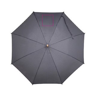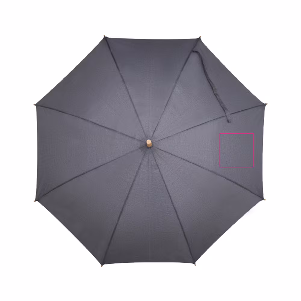 Stockschirm aus R-PET-Material mit einem eleganten Holzgriff. Durch den stabilen Fiberglasrahmen ist der Schirm sturmsicher. Die Spitzen sind aus Bambus und der Schaft aus Metall, somit können alle Elemente recycelt werden. Das melierte Material verleiht dem Modell einen luxuriösen Look.