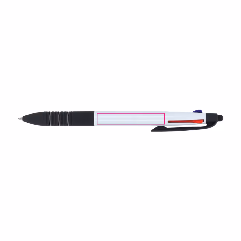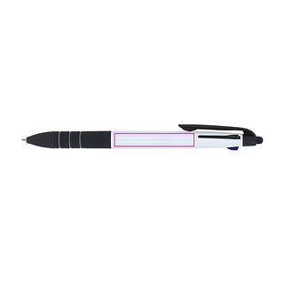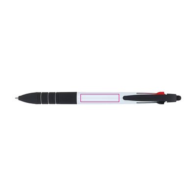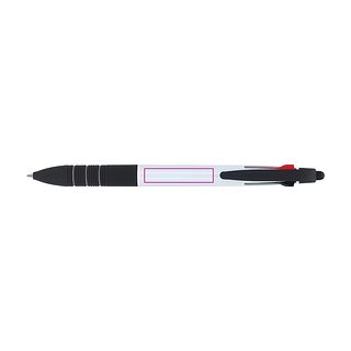 3-farbiger Kugelschreiber mit Stylus und weichem Ergogriff. Die Schreibfarben sind Schwarz, Blau und Rot.
