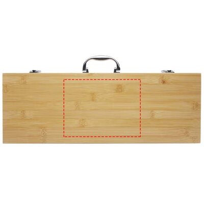3-teiliges BBQ-Set aus Bambus mit Wender (42 x 9,5 cm), Zange (46 x 2,2 cm) und Gabel (43 x 3,2 cm). Das Set wird in einer Geschenkbox aus Bambus (51,5 x 18,2 x 7,2 cm) geliefert. Die Griffe und die Geschenkbox sind aus Bambus gefertigt, der nach nachhaltigen Normen beschafft und produziert wird.