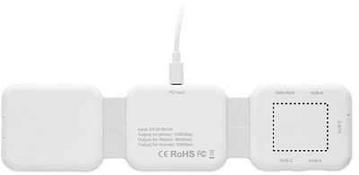 Magnetische Ladestation 3in1. ABS. Inkl. kabellose Ladestation 15W, Smartwatch-Ladegerät 3W (nur Apple®) und TWS-Ladegerät. 2 Typ-C- / 2 USB-A-Anschlüsse.