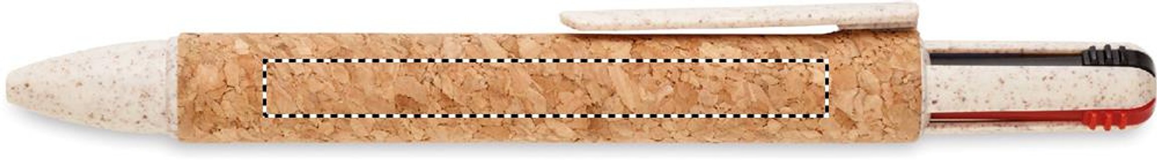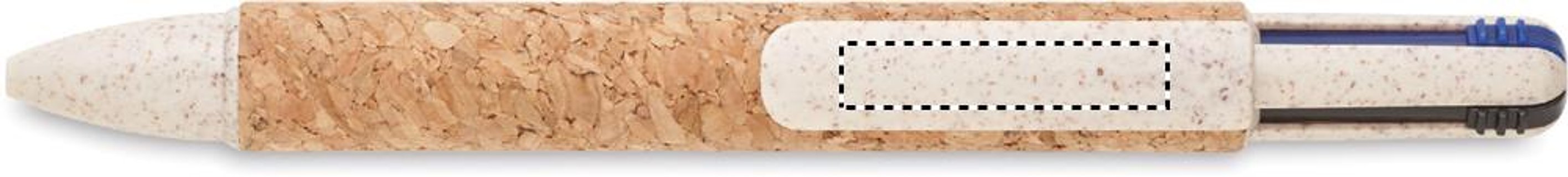 4-Farb-Kugelschreiber. Schaft aus Kork und Details aus Weizenstroh (50%) und ABS-Kunststoff (50%). Tinte: blau, schwarz, rot, grün.