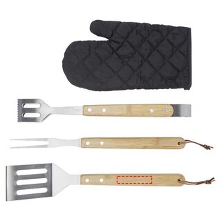 5-teiliges BBQ-Set mit Wender (36,5 x 7 cm), Gabel (36,5 x 2 cm), Zange (36,5 x 5 cm), Handschuh (25 x 16 cm) und einer Schürze mit Tasche (42 x 60 cm). Die Handgriffe sind aus Bambus, der nach nachhaltigen Standards bezogen und produziert wird.