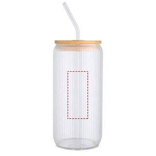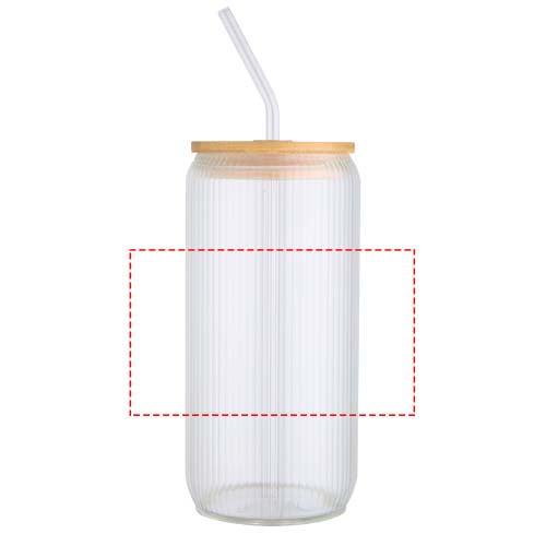 Glasgefäss aus Borosilikatglas mit Glasstrohhalm und Bambusdeckel. Das Glas hat ein einzigartiges Rillen-Design im Inneren und eine glatte Aussenseite – ideal zur Anbringung eines Logos. Der verwendete Bambus stammt aus nachhaltiger Quelle und wird unter Berücksichtigung ökologischer und sozialer Verantwortung gewonnen. Geliefert in einer Geschenkbox aus Recyclingkarton. Fassungsvermögen: 650 ml.