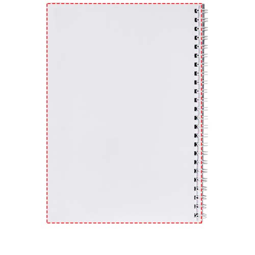 Dieses A4 Notizbuch enthält einen weissen oder schwarzen Draht, 80 g/m2 Blankopapier und eine glänzende Vorder- und Rückseite aus Karton (250 g/m2). Das Standardmodell wird mit 50 Blatt geliefert, aber das Notizbuch ist auch mit 80 Blatt erhältlich. Bedruckung ist sowohl auf den Blättern als auch auf der Vorder- und Rückseite möglich.