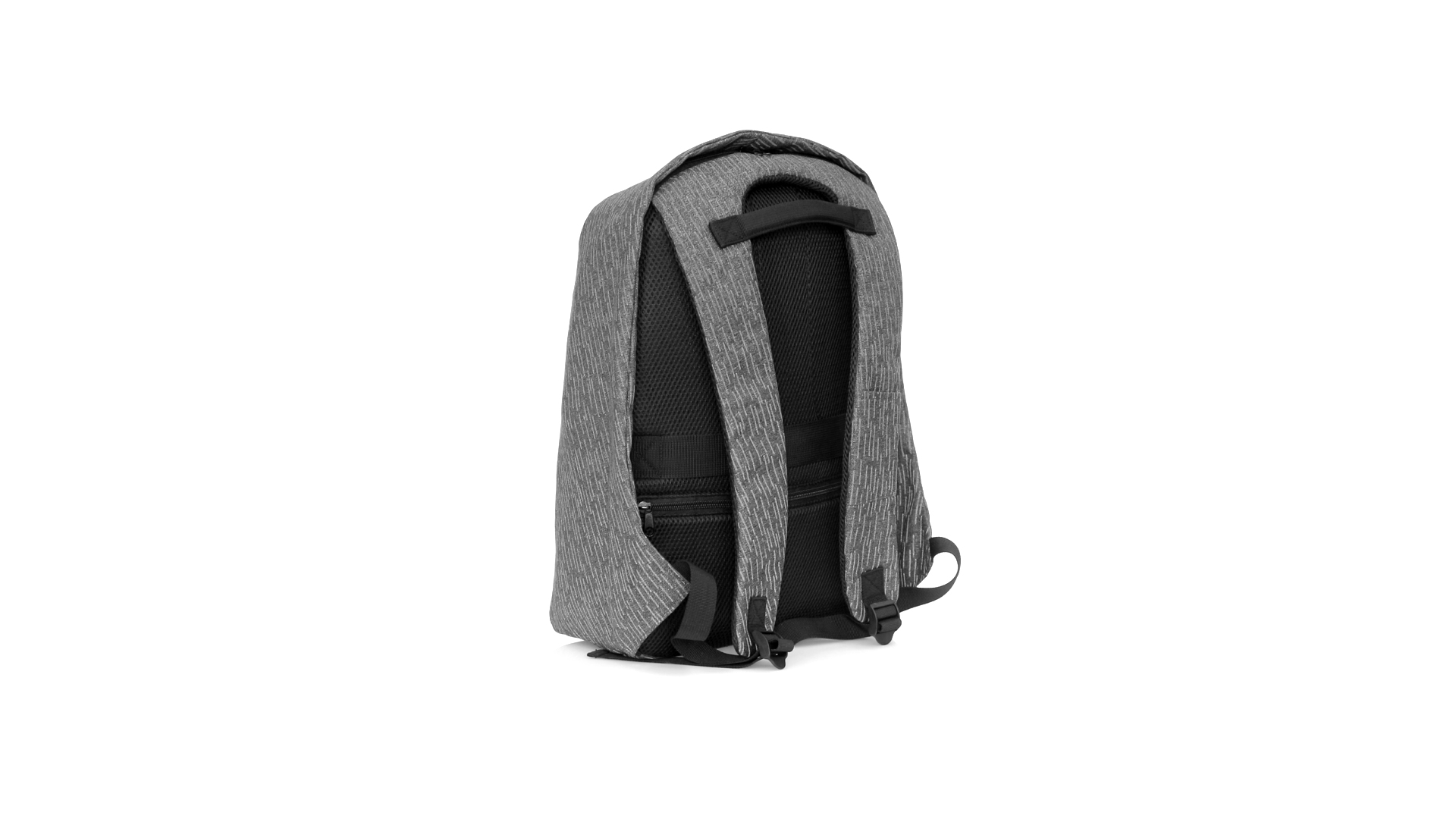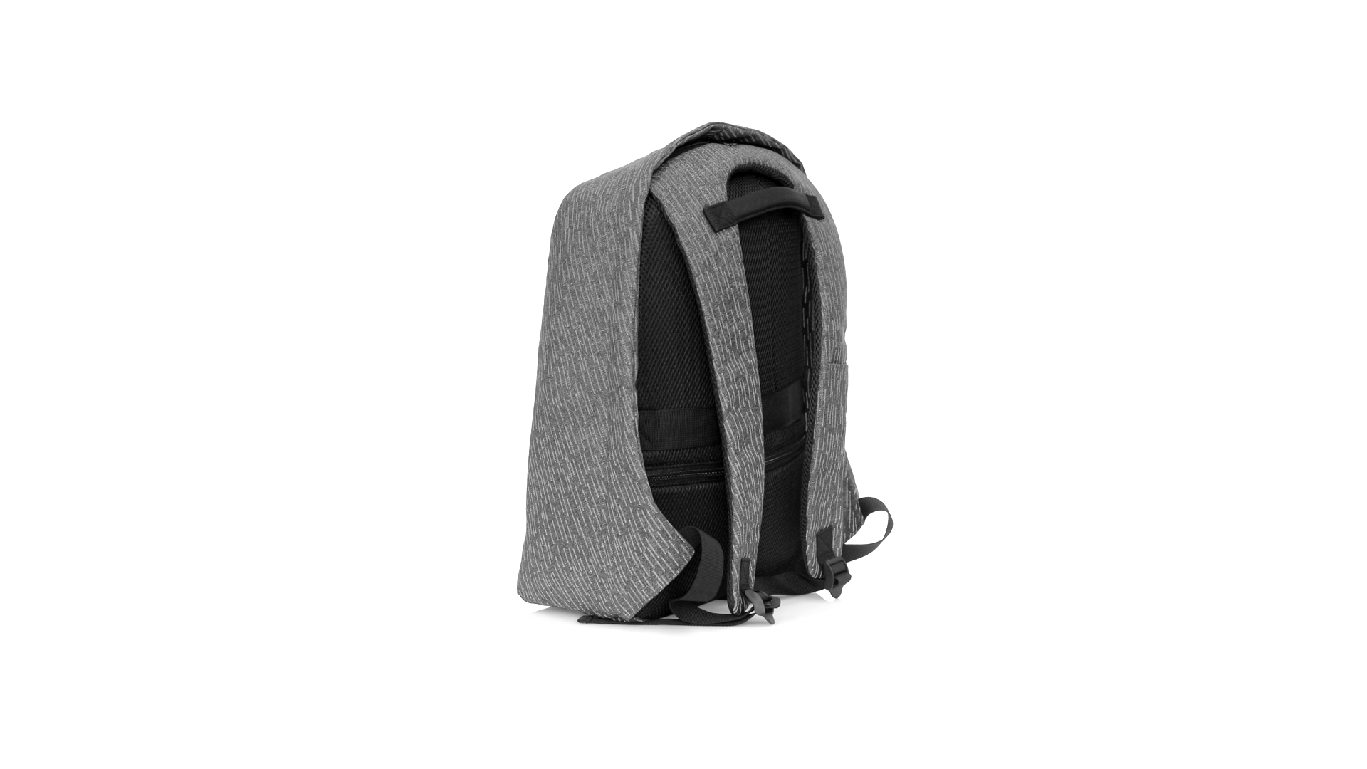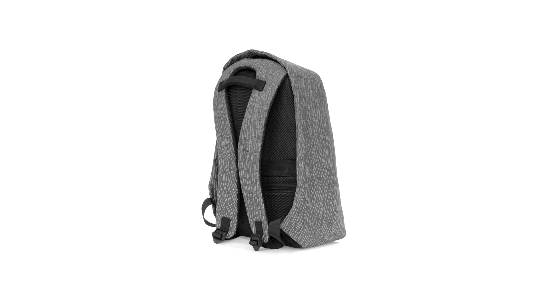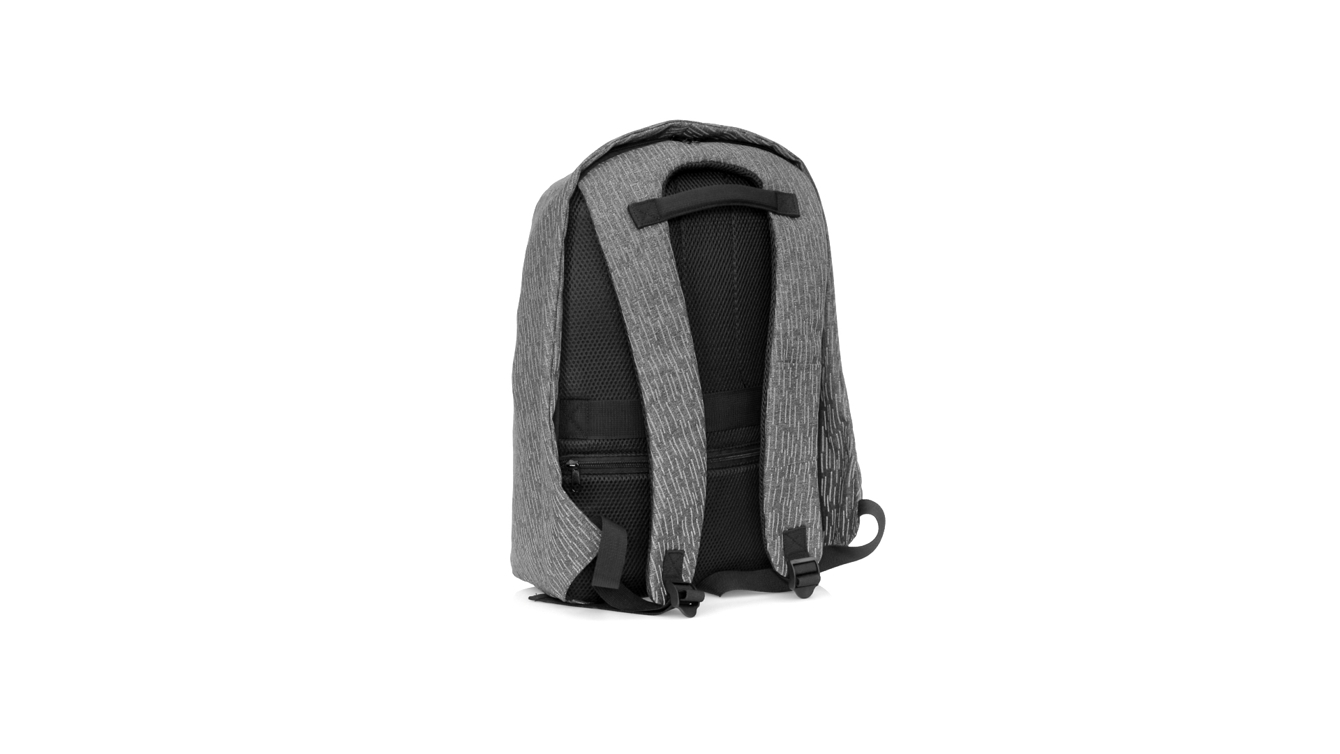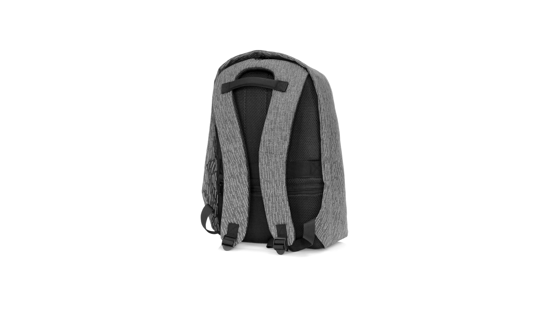 Gut sichtbarer, reflektierender Anti-Diebstahl-Rucksack aus strapazierfähigem, hochwertigem 600D-Polyester mit grauem Finish. Hergestellt unter Verwendung von Glühfäden mit hoher Lichtreflexionsfähigkeit dank Millionen reflektierender Pigmente und basierend auf dem Prinzip der Retroreflexion von Licht, einer Eigenschaft der Nachtsichtbarkeit, die in der Brechung des Lichts in Richtung der Lichtquelle besteht. Spritzwassergeschützt, mit Anti-Diebstahl-Tasche und Trolley-Befestigung. Gepolsterte Innenfächer für Laptops bis zu 15" und Tablets bis zu 12". Gepolsterte Schulter- und Rückengurte.