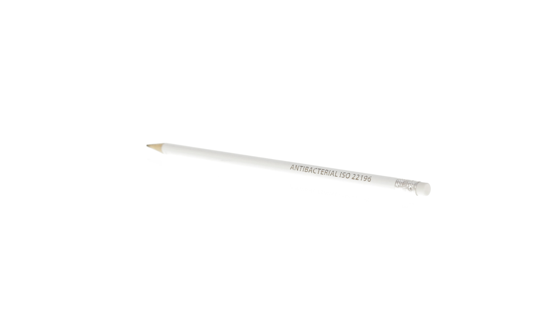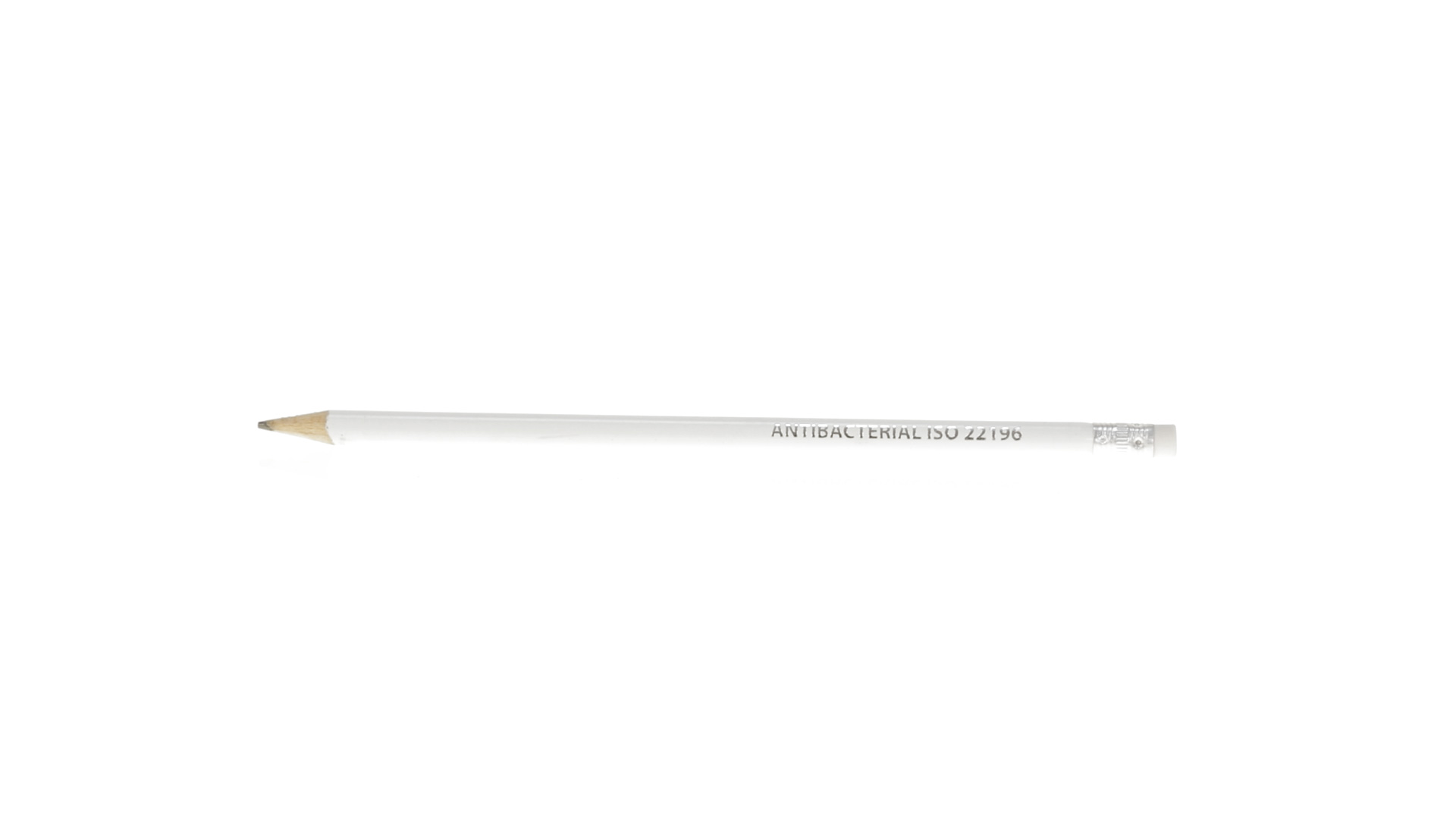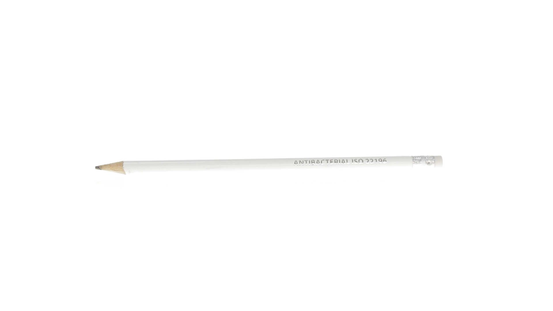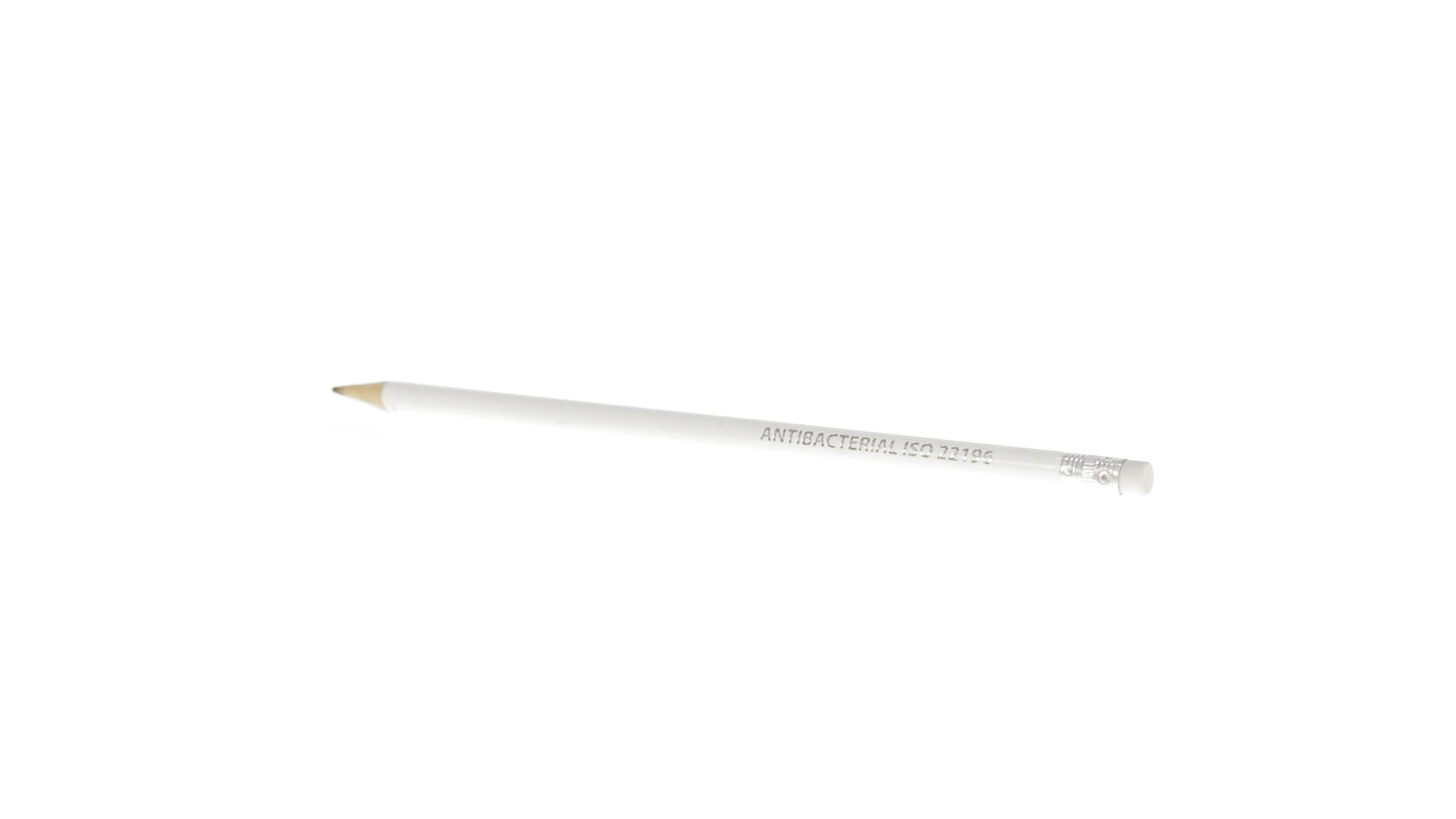 Holzbleistift mit rundem Schaft und antibakterieller Beschichtung. Erhältlich in weiss, mit Radiergummi. Ungespitzte Spitze.Produkte mit antibakteriellen Behandlungen sind in der Lage, die bakterielle Belastung der Materialoberflächen drastisch zu reduzieren, da sie statische, permanente mikrobielle Wirkstoffe enthalten, die eine bakterielle Kontamination mit hoher Wirksamkeit hemmen und verhindern.Der Artikel entspricht der Norm ISO 22196, die die antibakterielle Aktivität von Kunststoffen und nicht porösen Oberflächen bestimmt. Dies ermöglicht die Wirksamkeit der mikrobiellen Hemmung, die die Zusatzstoffe auf den behandelten Objekten haben, durch eine quantitative Bewertung zu kennen.