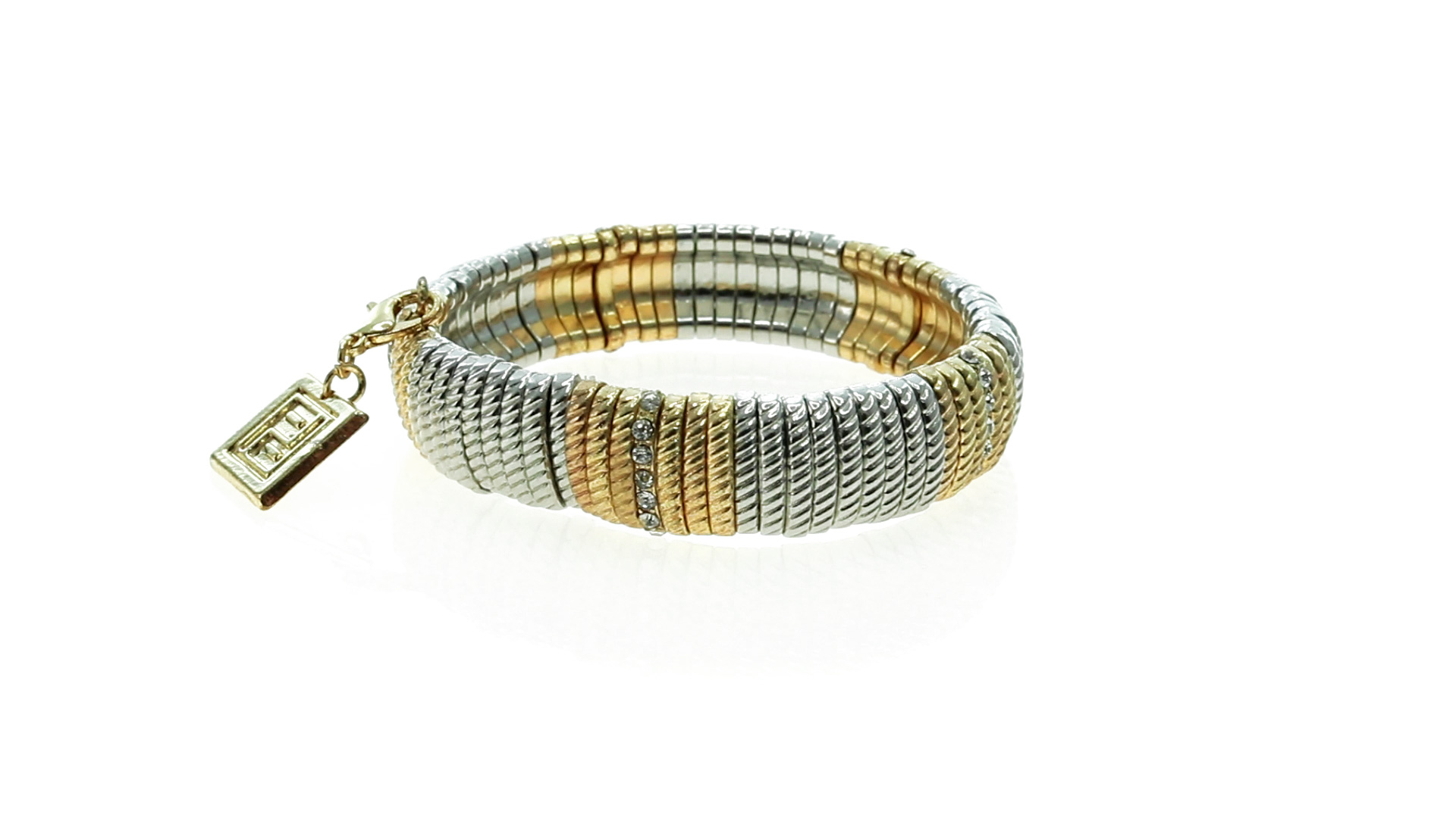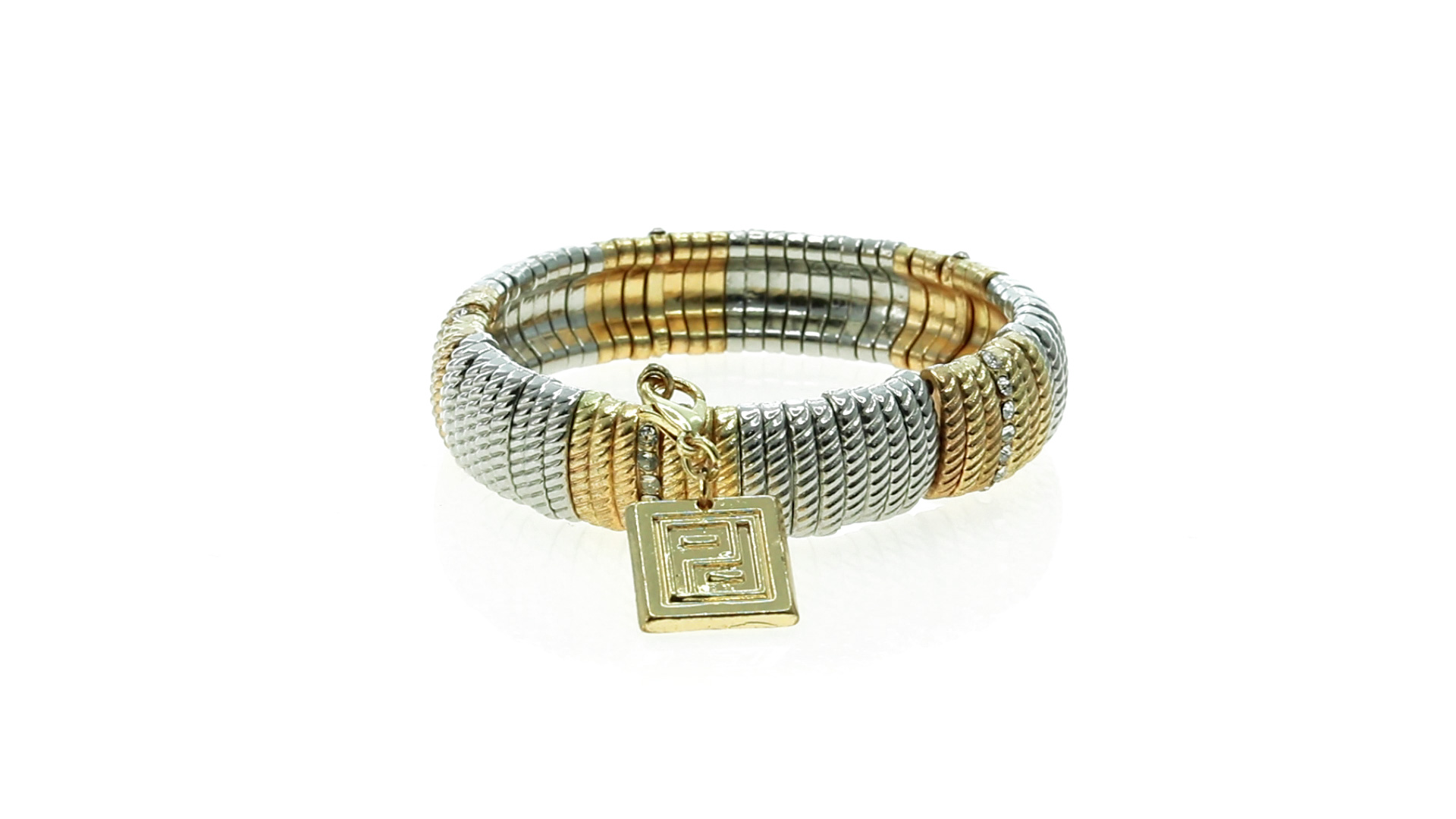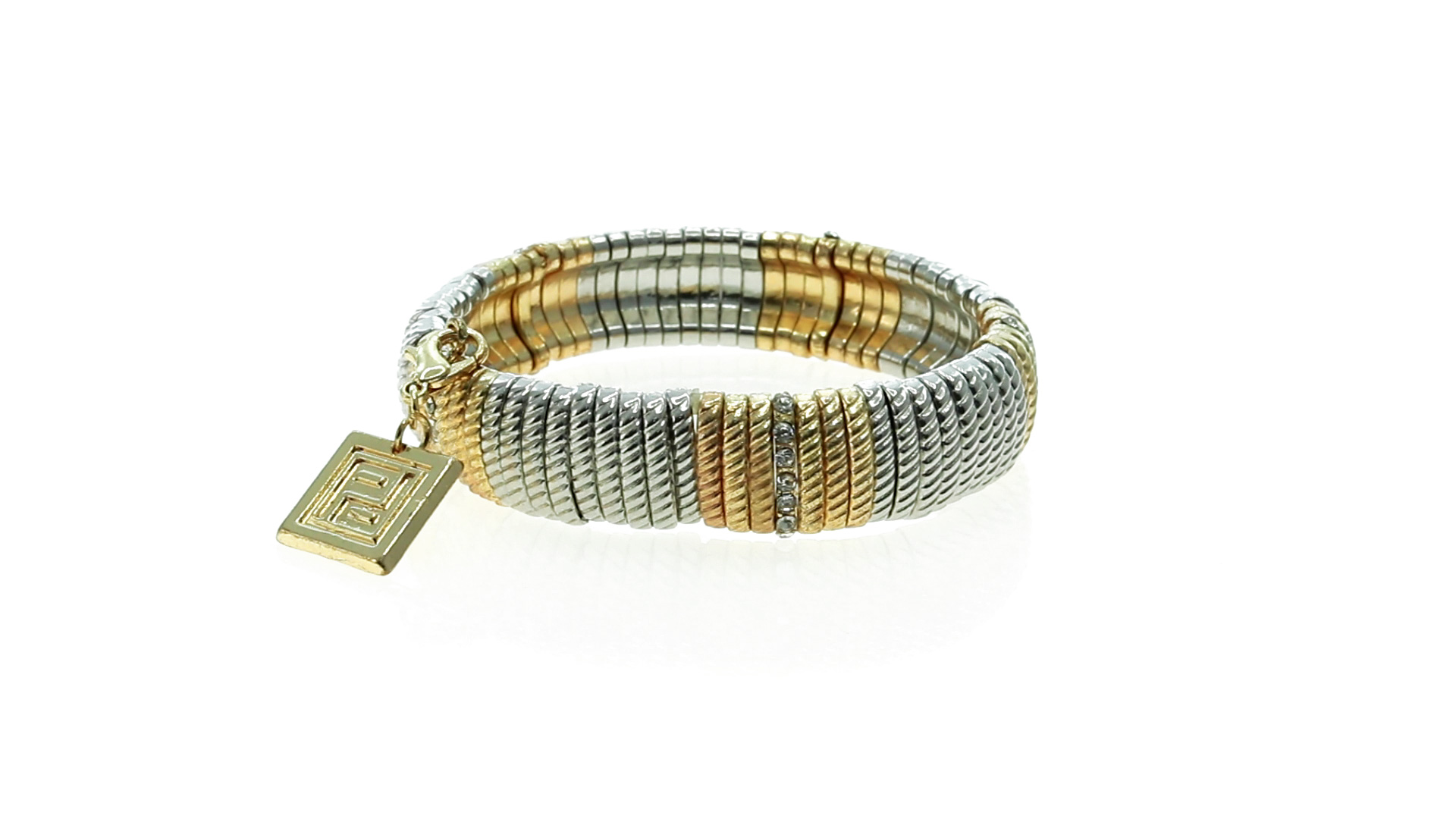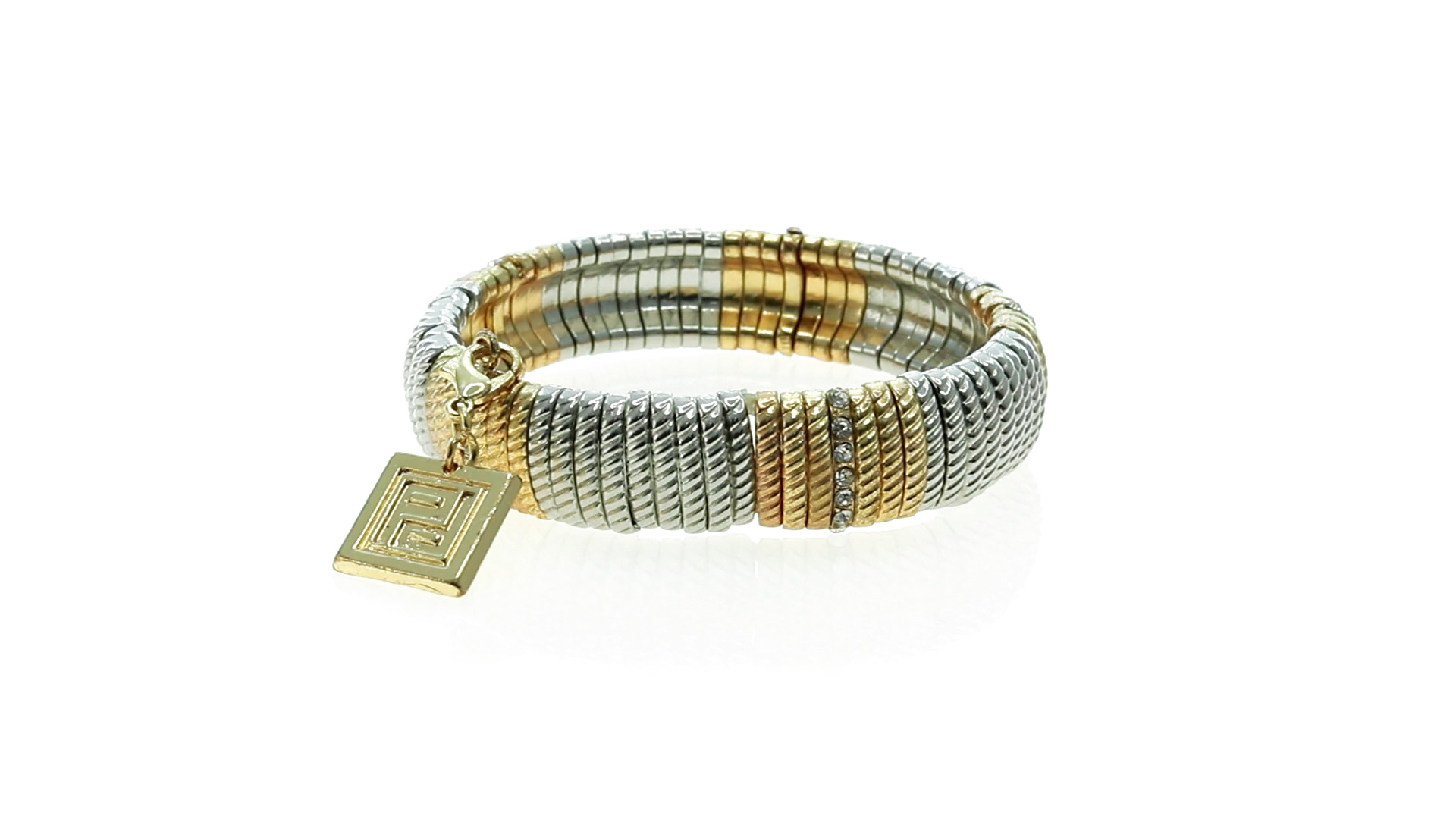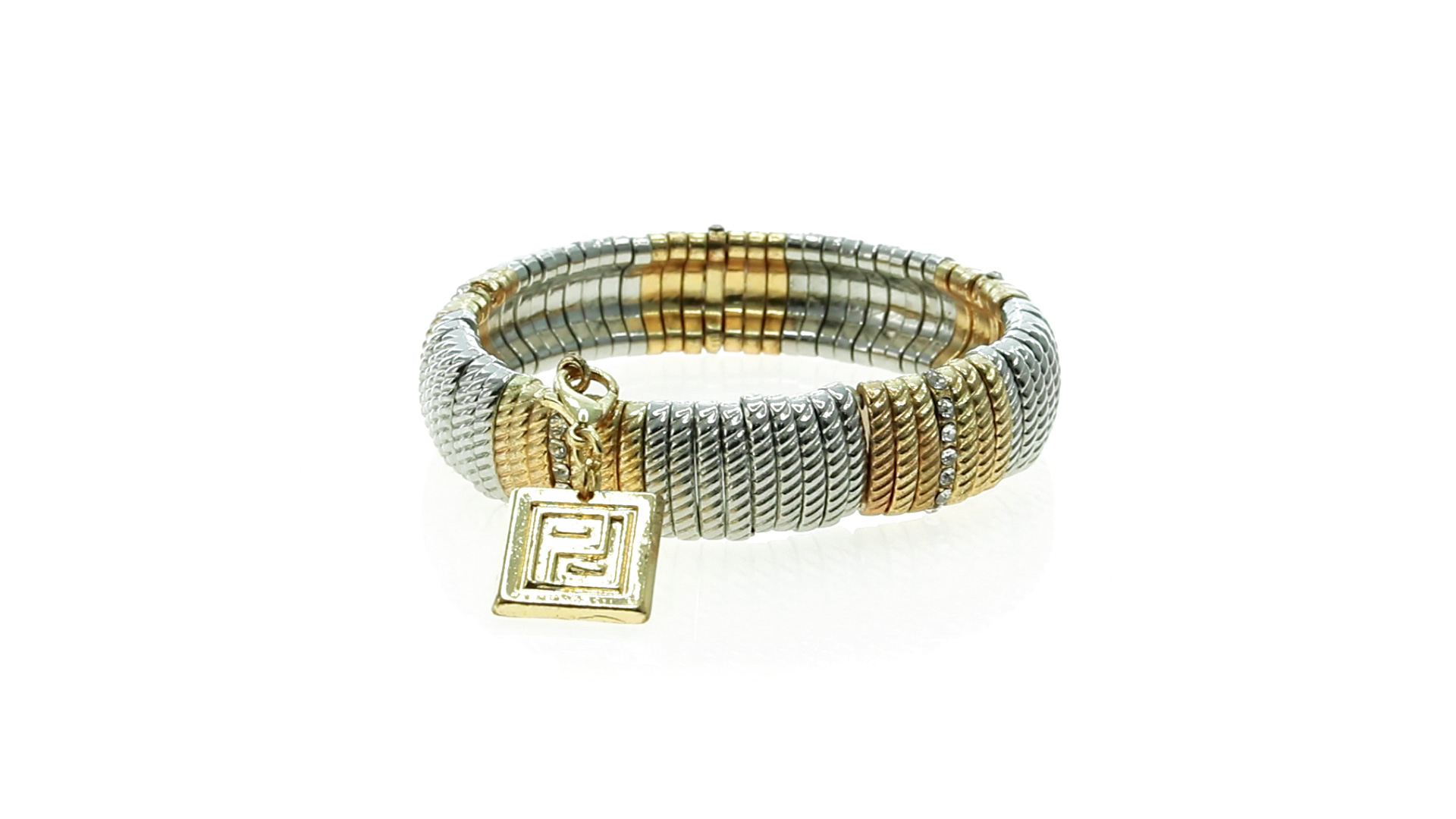 Verstellbares Armband von Pertegaz aus lackiertem Metall mit originellem Design in glänzendem Gold und Silber. Mit quadratischem Anhänger mit dem Markenlogo. Präsentiert in einem Kunstlederbeutel.