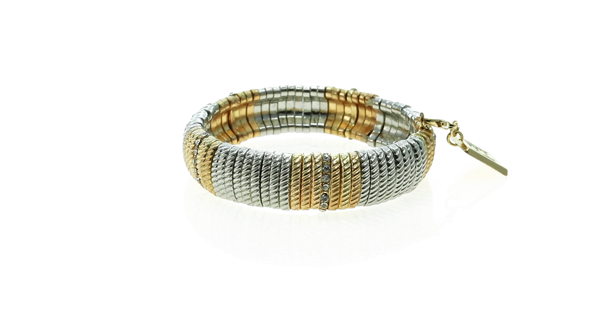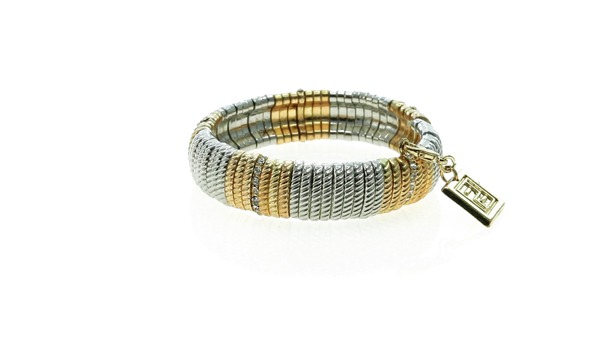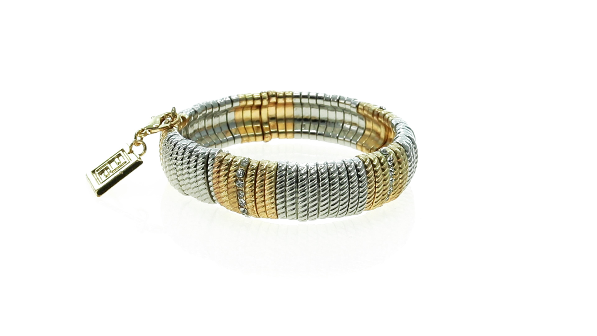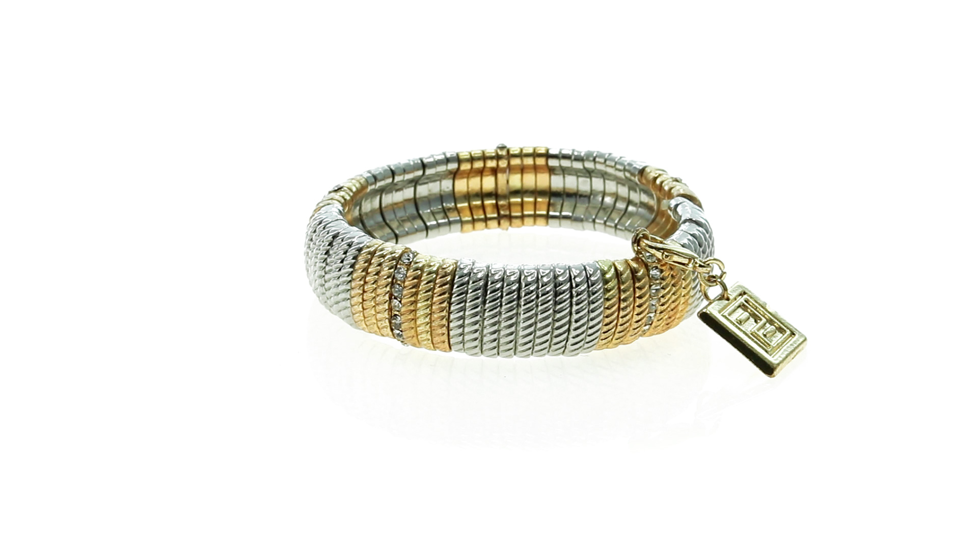 Verstellbares Armband von Pertegaz aus lackiertem Metall mit originellem Design in glänzendem Gold und Silber. Mit quadratischem Anhänger mit dem Markenlogo. Präsentiert in einem Kunstlederbeutel.