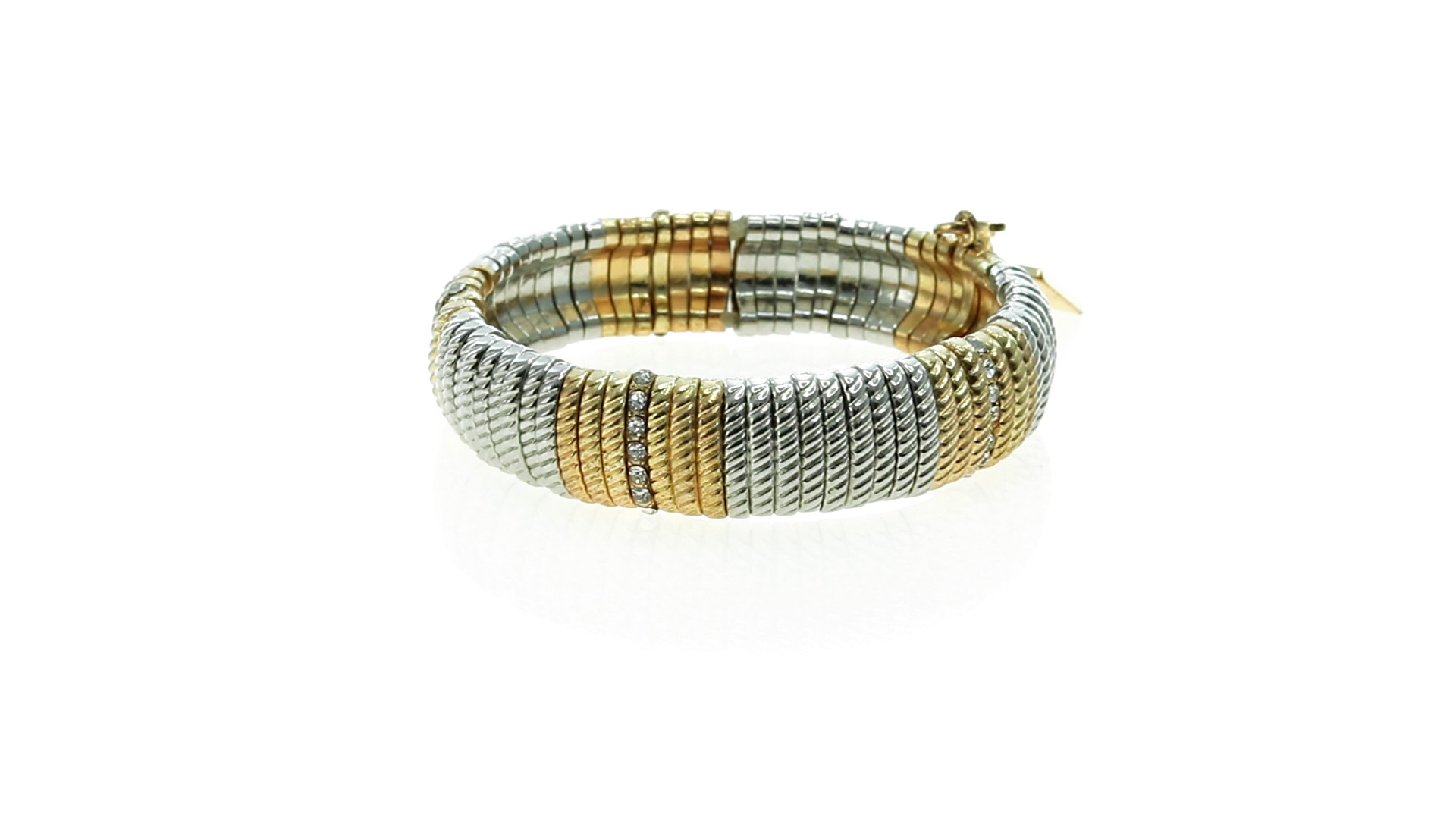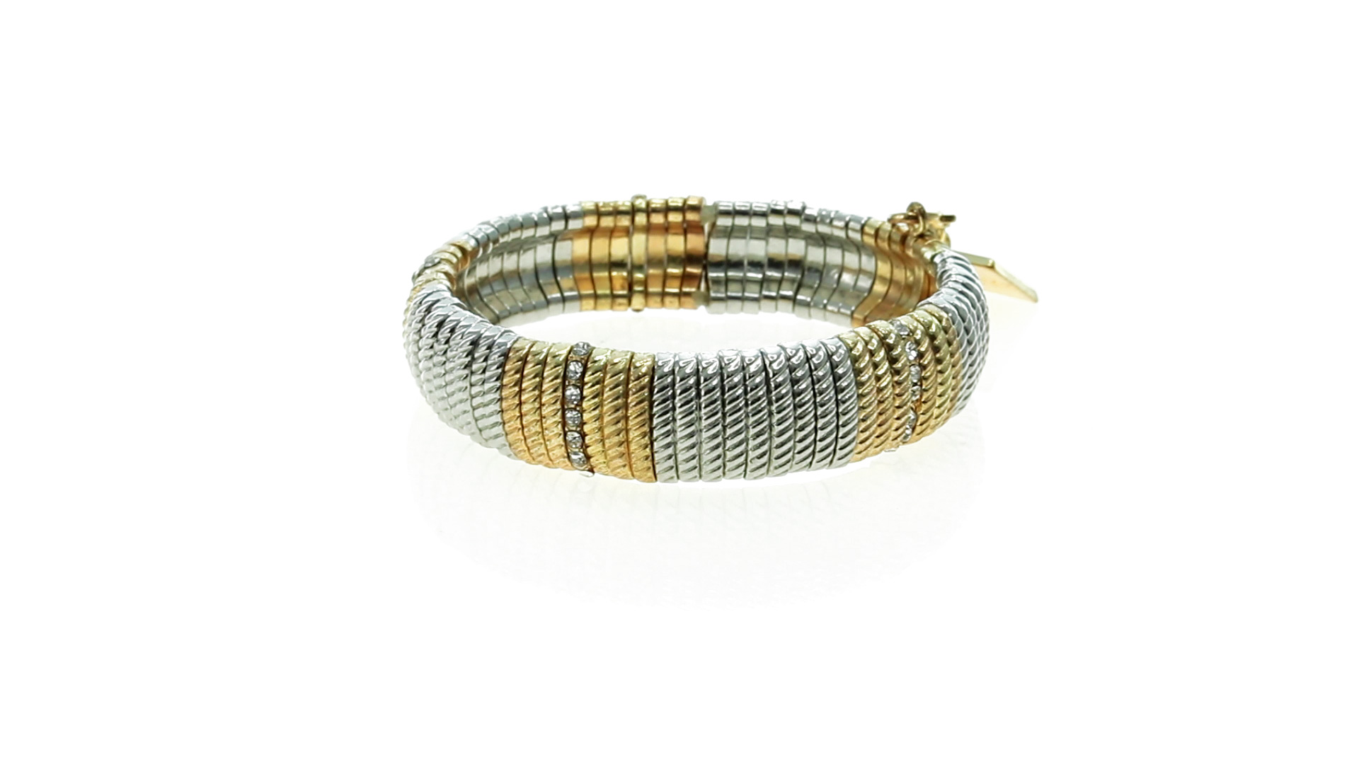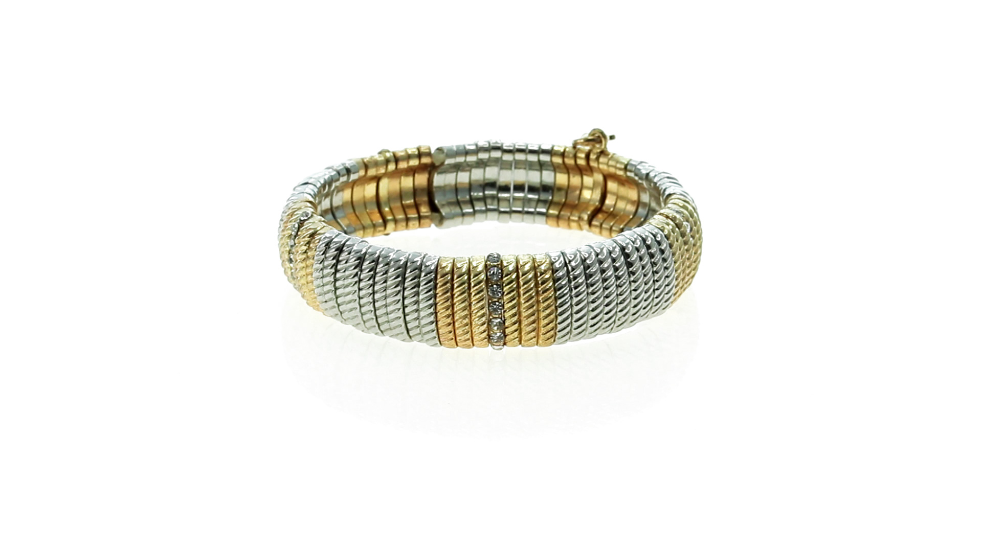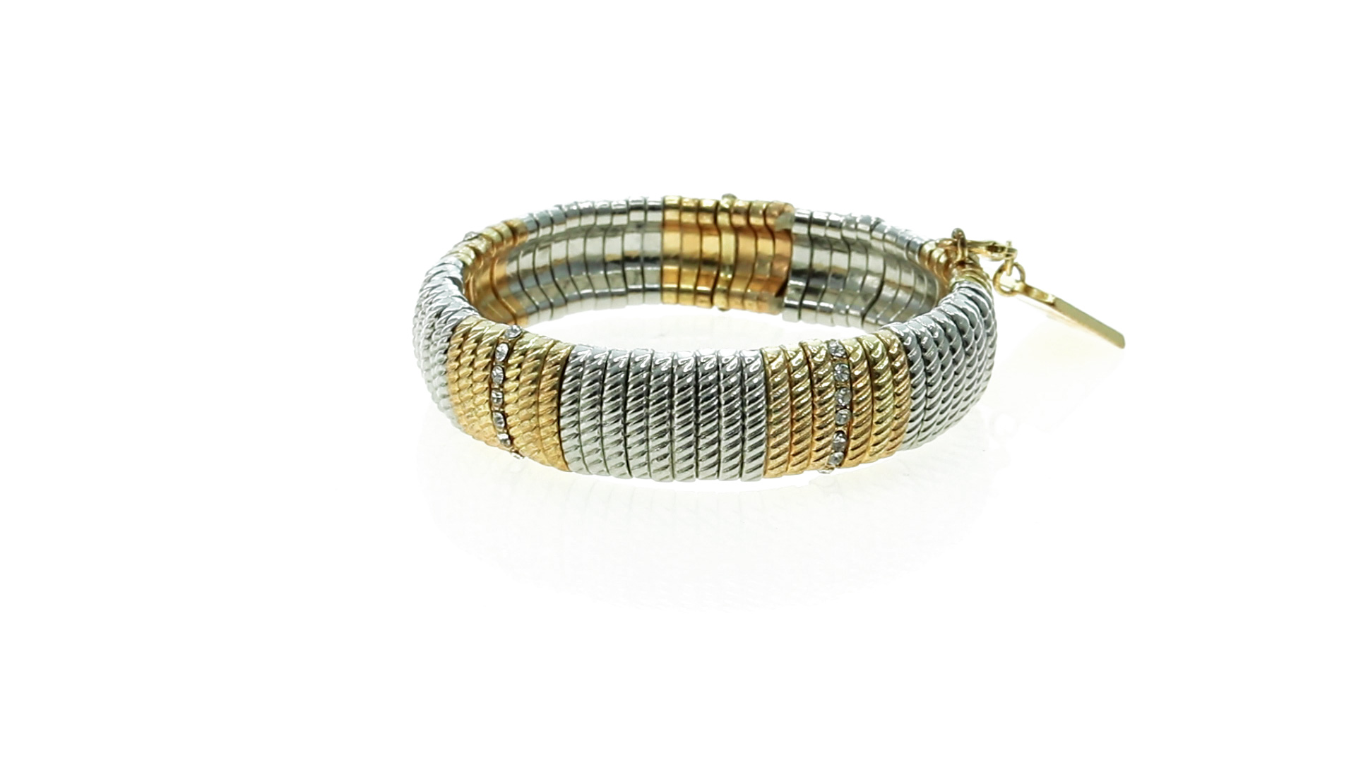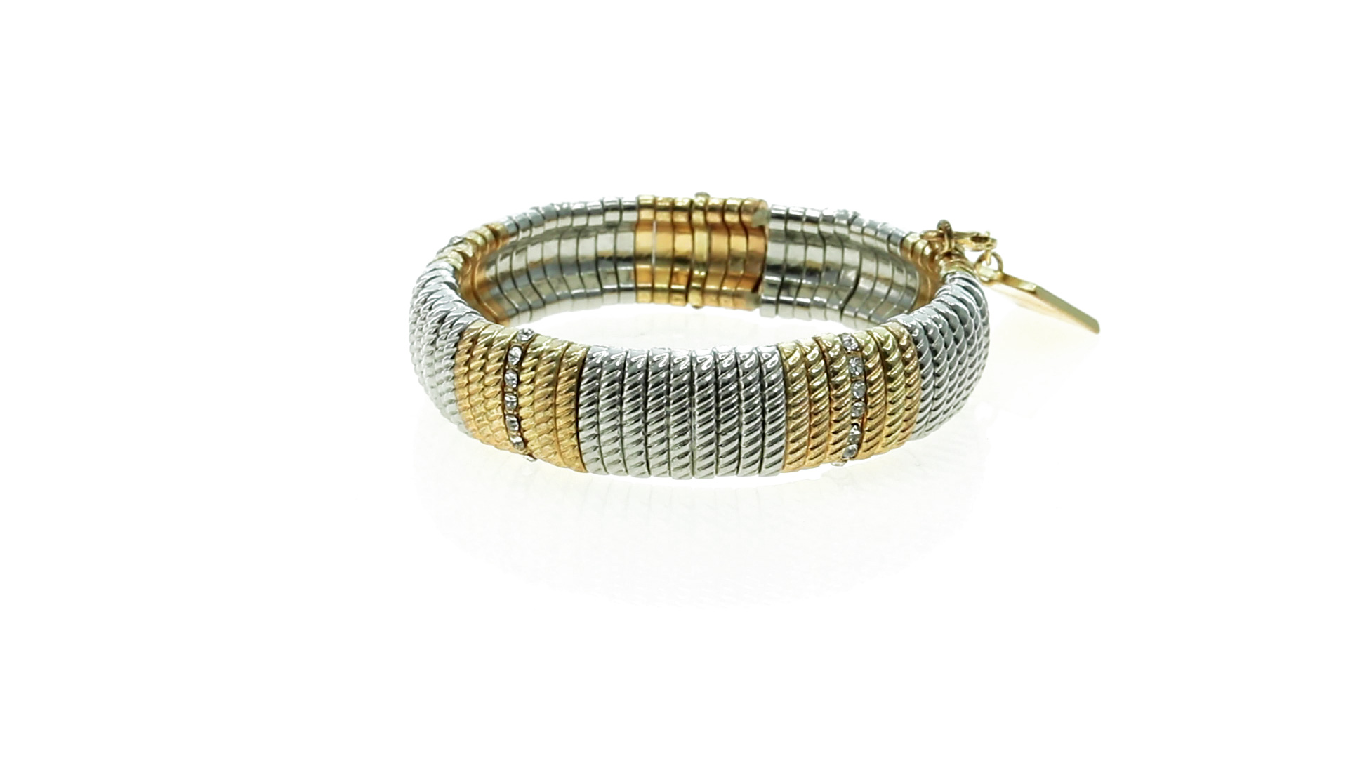 Verstellbares Armband von Pertegaz aus lackiertem Metall mit originellem Design in glänzendem Gold und Silber. Mit quadratischem Anhänger mit dem Markenlogo. Präsentiert in einem Kunstlederbeutel.