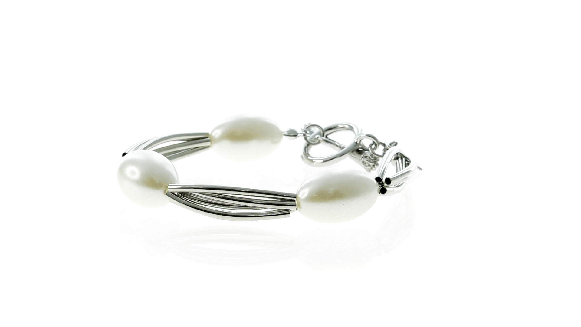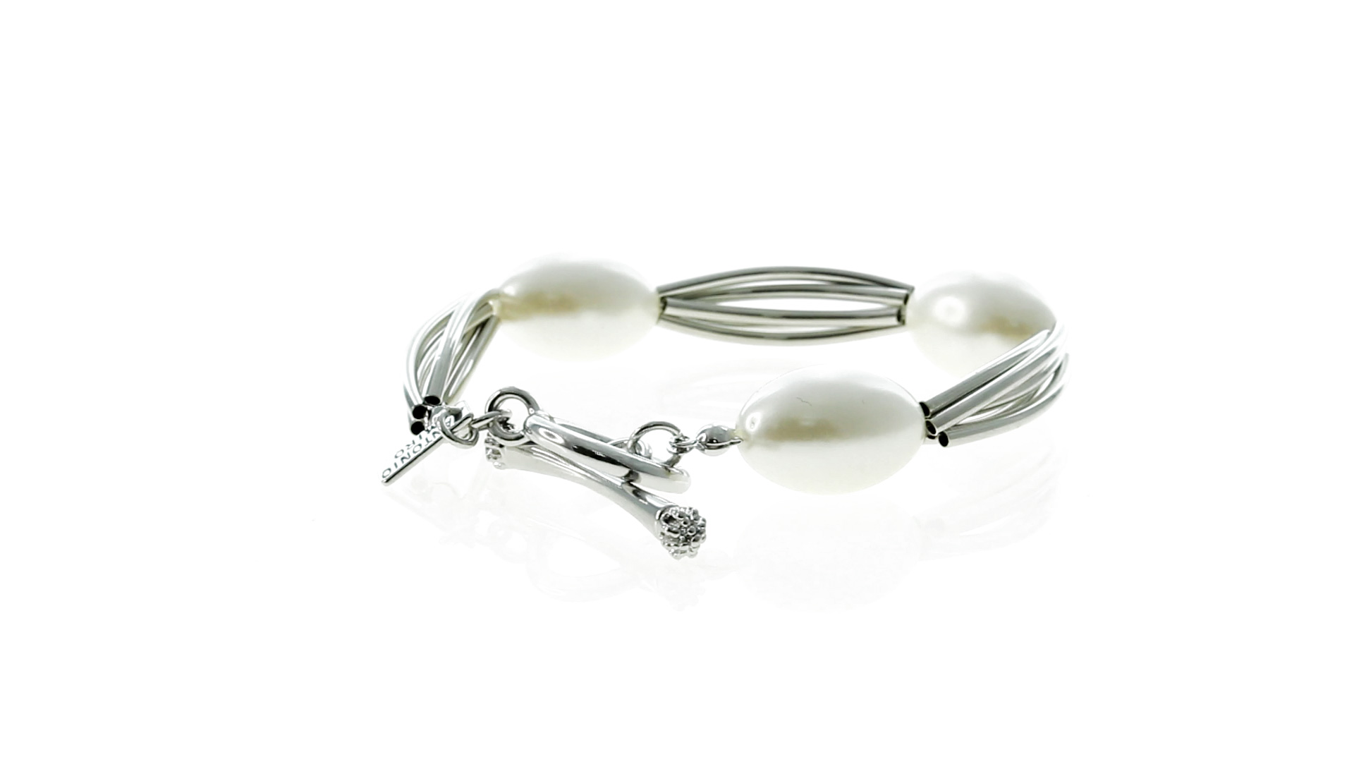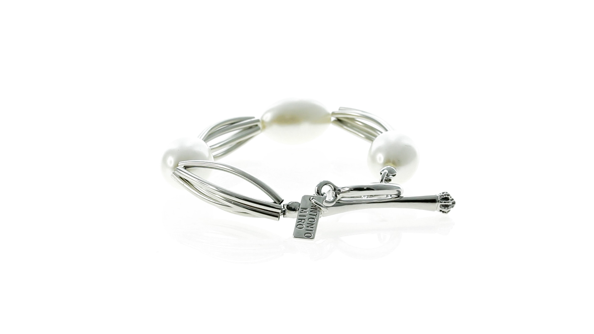 Armband von Antonio Miró aus lackiertem Metall mit Kunstperlen in Weiss und originellem Verschluss. Präsentiert in einem Kunstlederbeutel mit dem Markenlogo.