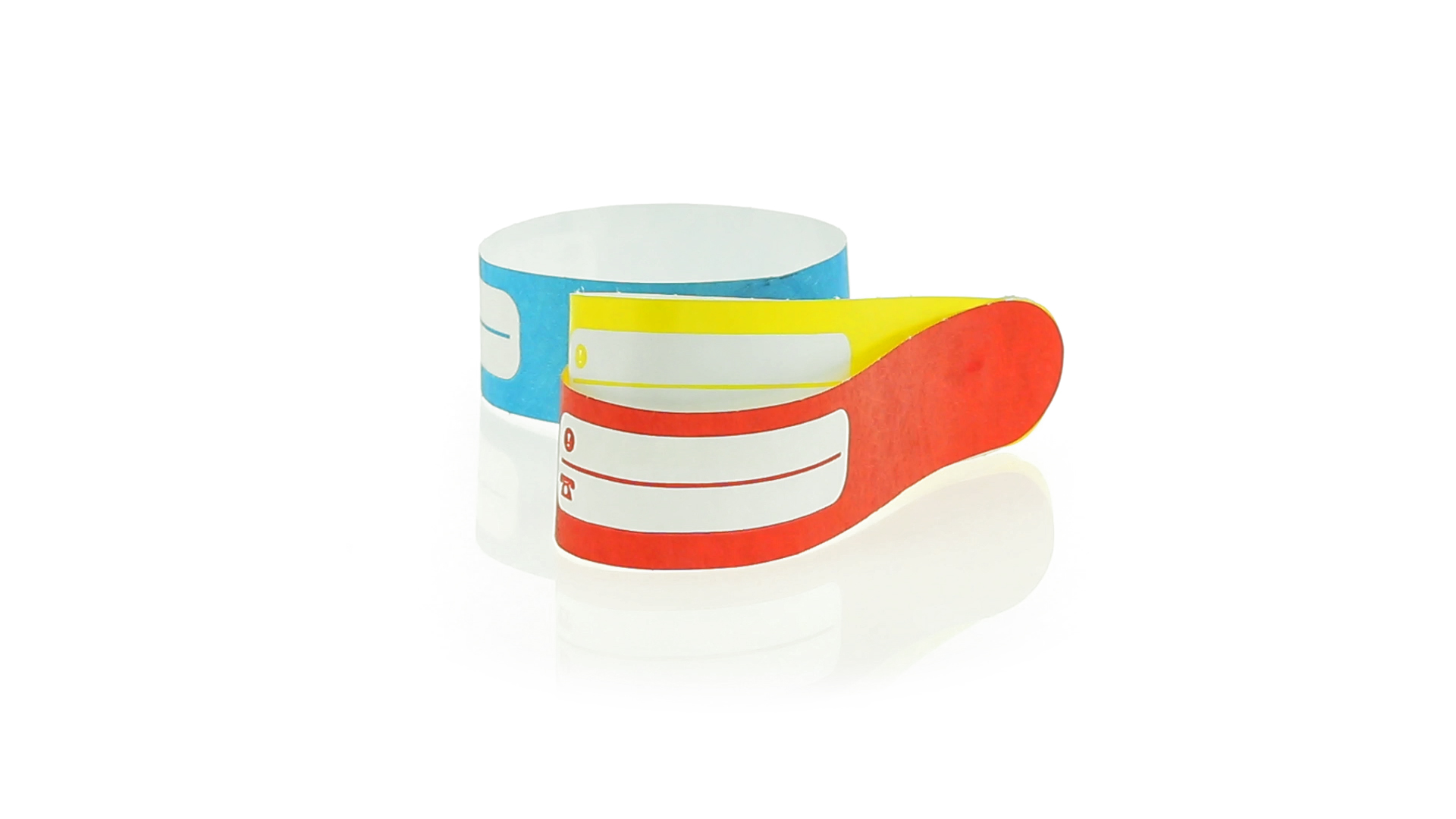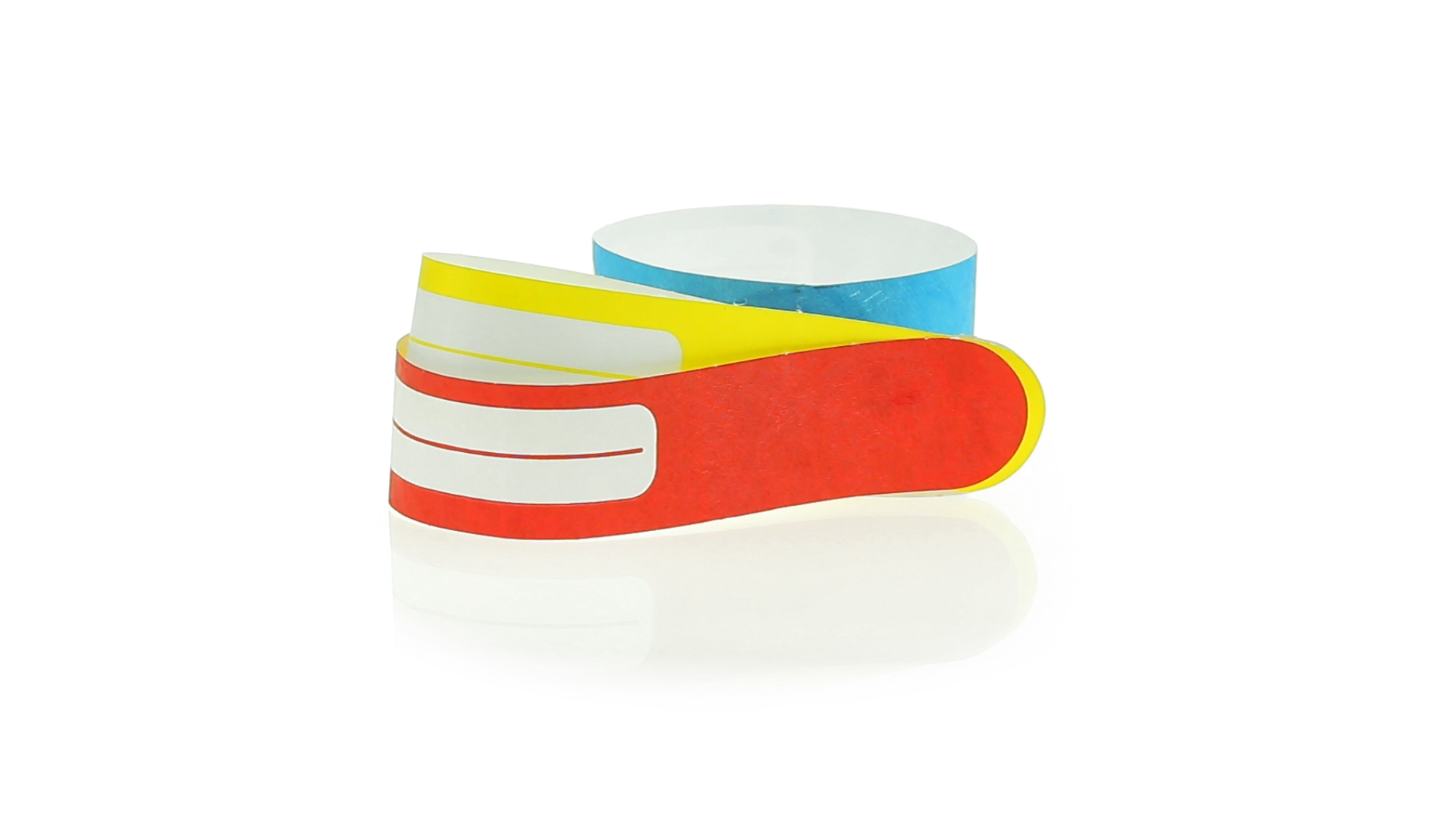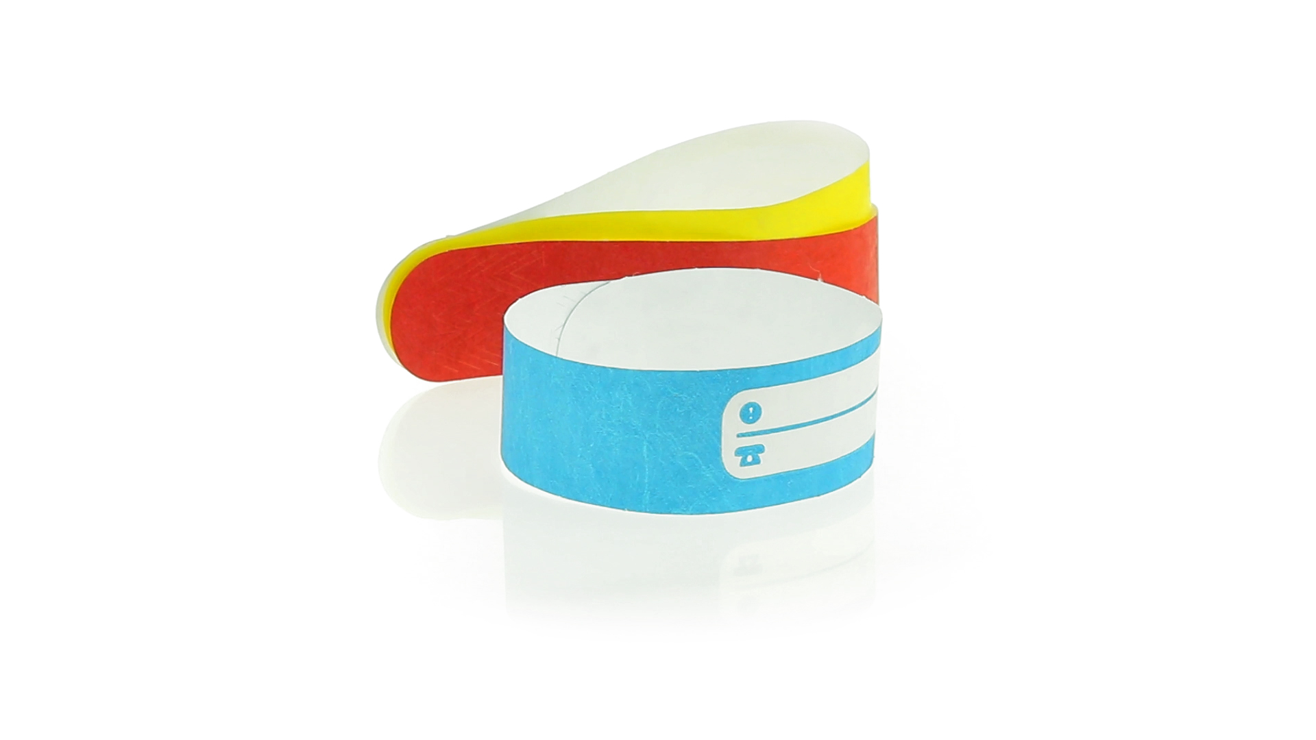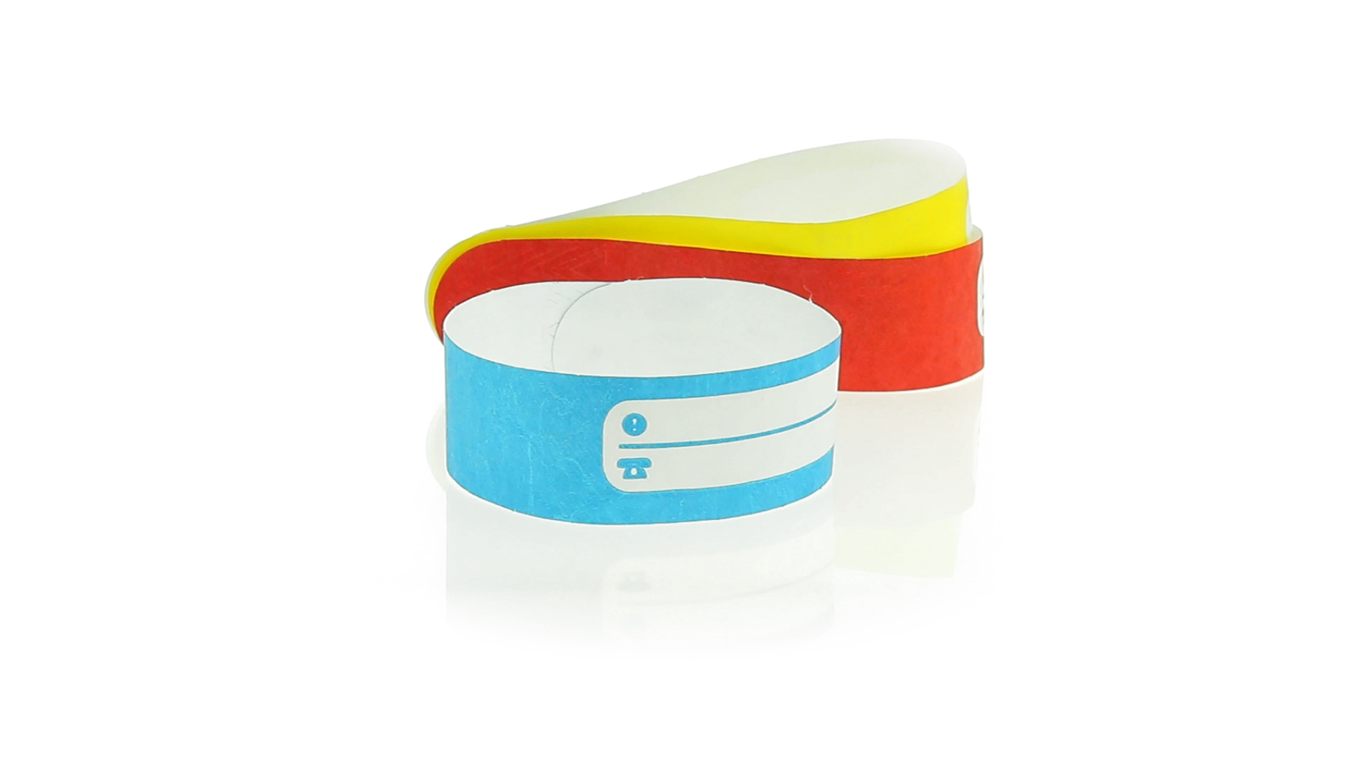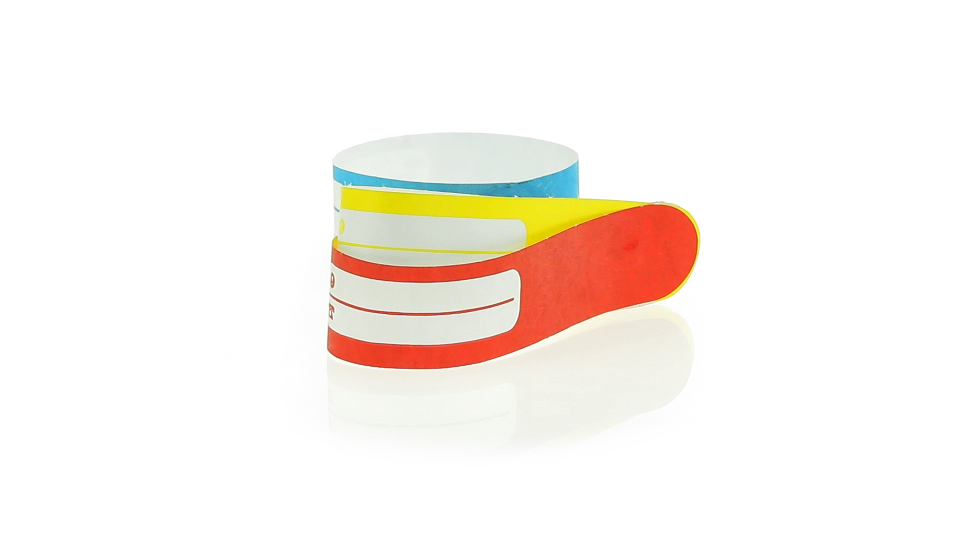 Armband für Kinder aus synthetischer Faser in einer Vielzahl von kräftigen Farben. Mit Identifikationsfeld und Klebeverschluss. Wasserfest und in gestanzten Bögen á 10 Stück für einfaches Bedrucken.