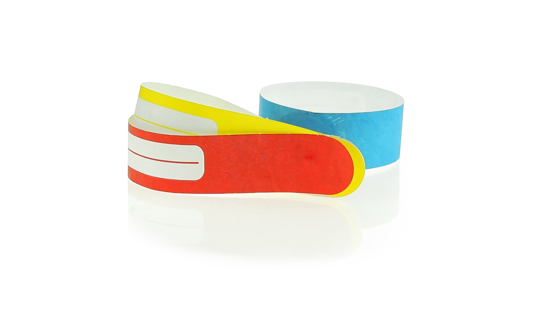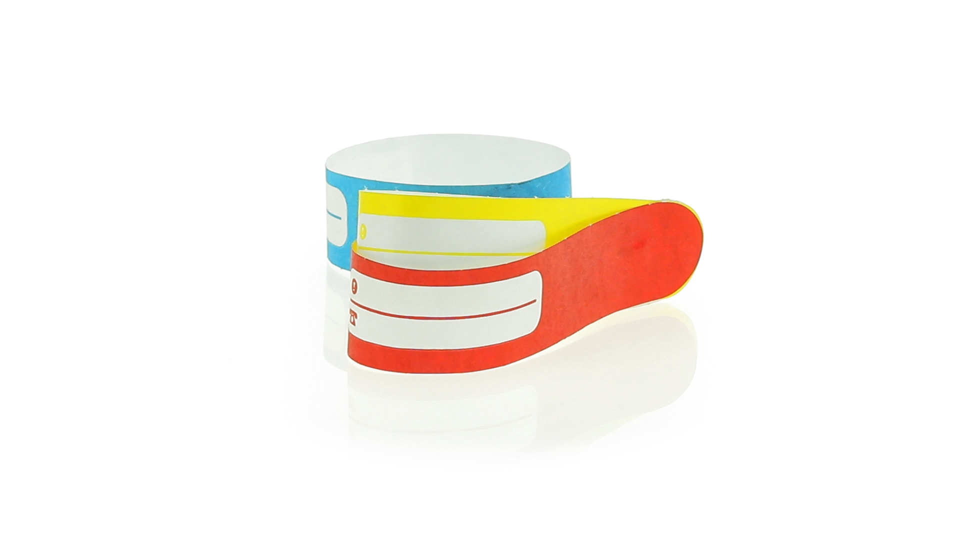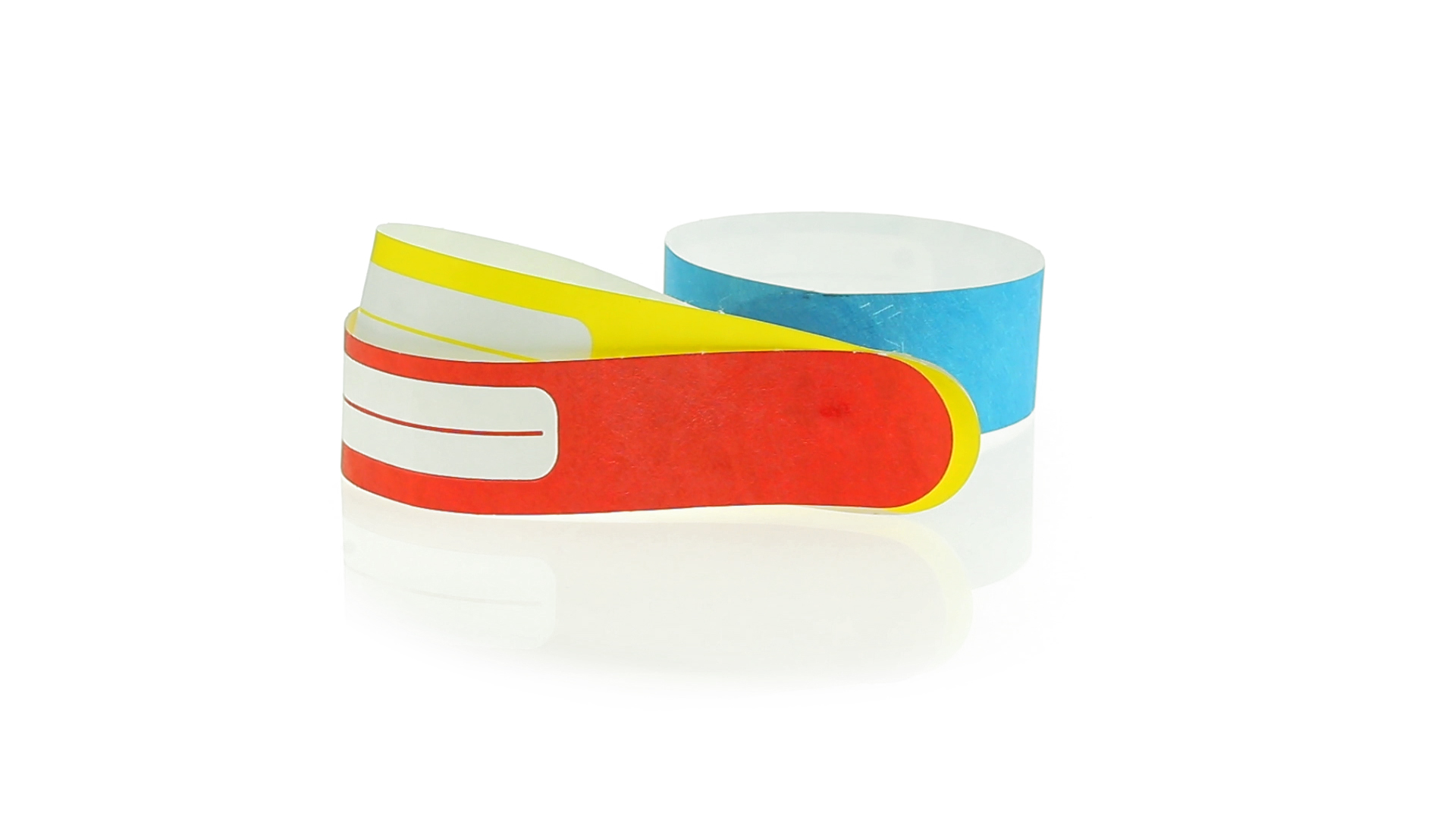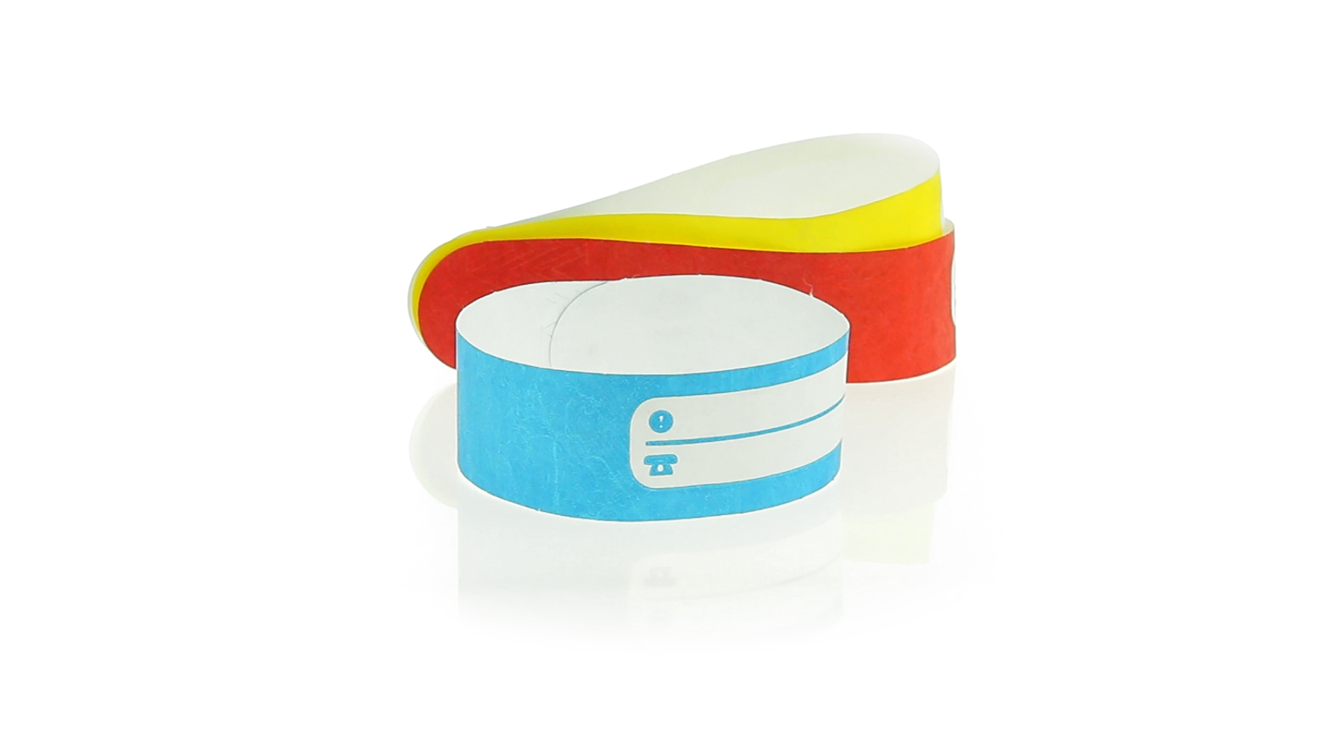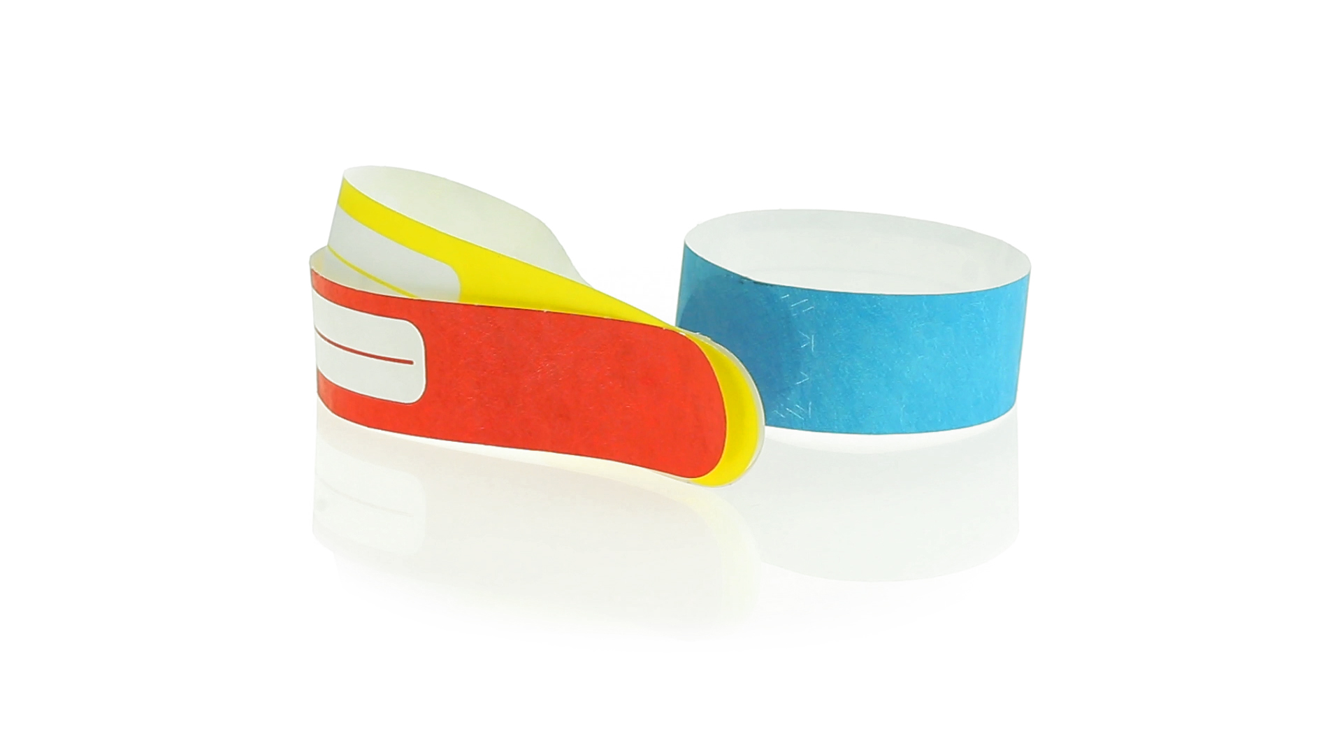 Armband für Kinder aus synthetischer Faser in einer Vielzahl von kräftigen Farben. Mit Identifikationsfeld und Klebeverschluss. Wasserfest und in gestanzten Bögen á 10 Stück für einfaches Bedrucken.