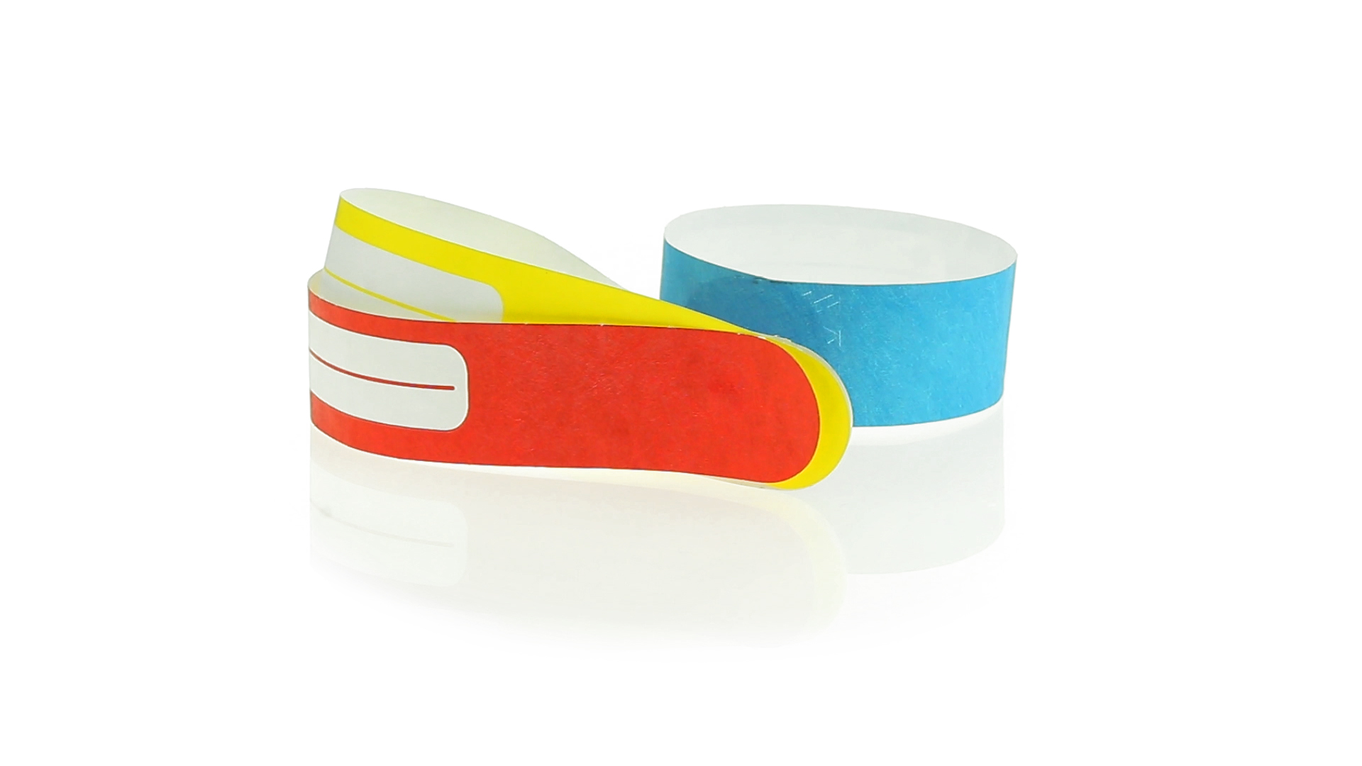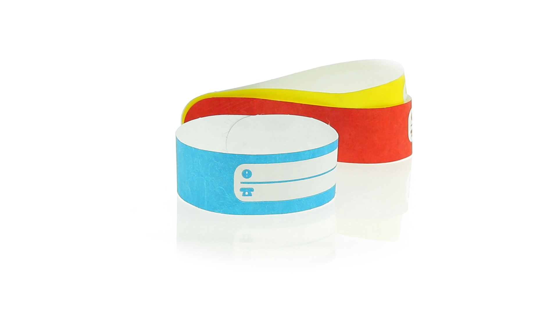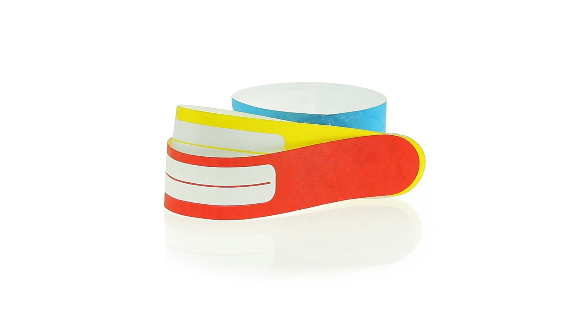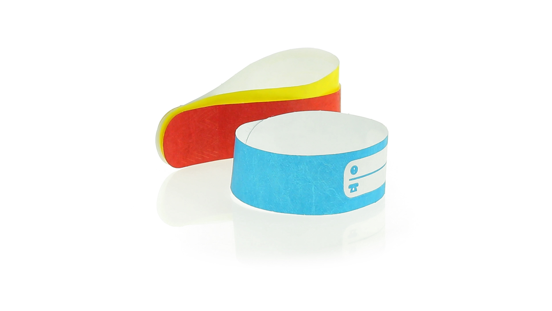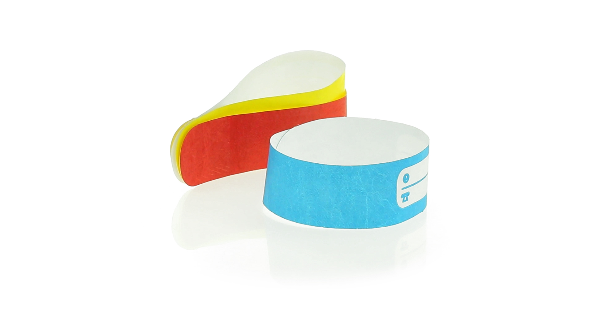 Armband für Kinder aus synthetischer Faser in einer Vielzahl von kräftigen Farben. Mit Identifikationsfeld und Klebeverschluss. Wasserfest und in gestanzten Bögen á 10 Stück für einfaches Bedrucken.