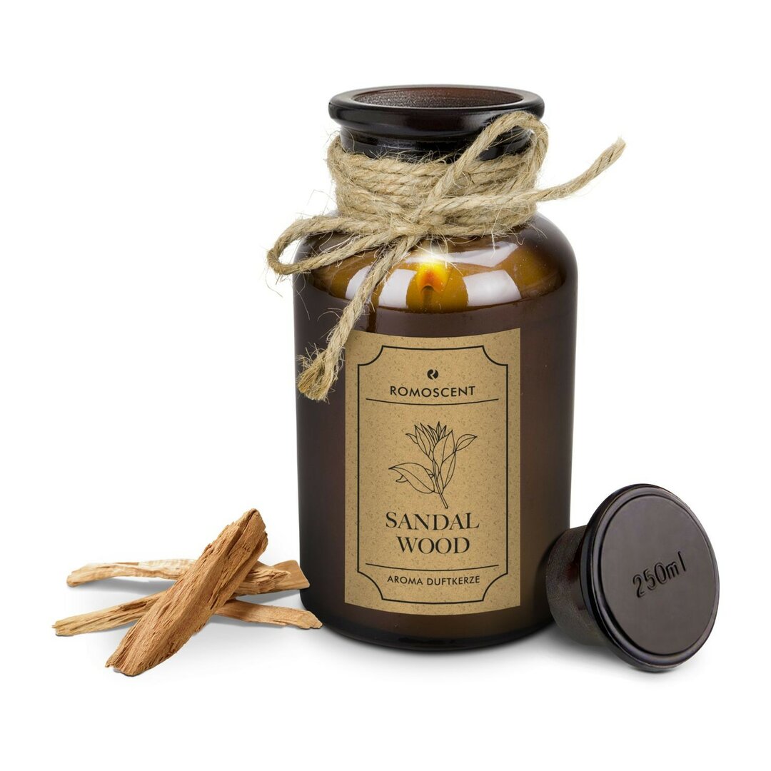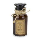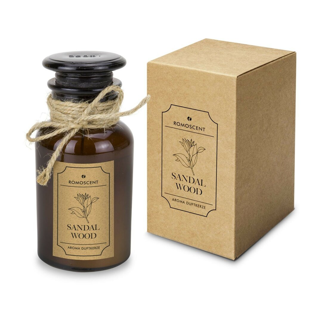 Originelle Aromakerze in einer Apothekerflasche mit passendem Glaskorken, Etikett und Jutedekoration. Der authentische Duft von Sandelholz enthält süssliche Noten in Kombination mit erdig-holzigen Gerüchen, und wirkt zugleich anregend und beruhigend auf Körper, Geist und Seele.