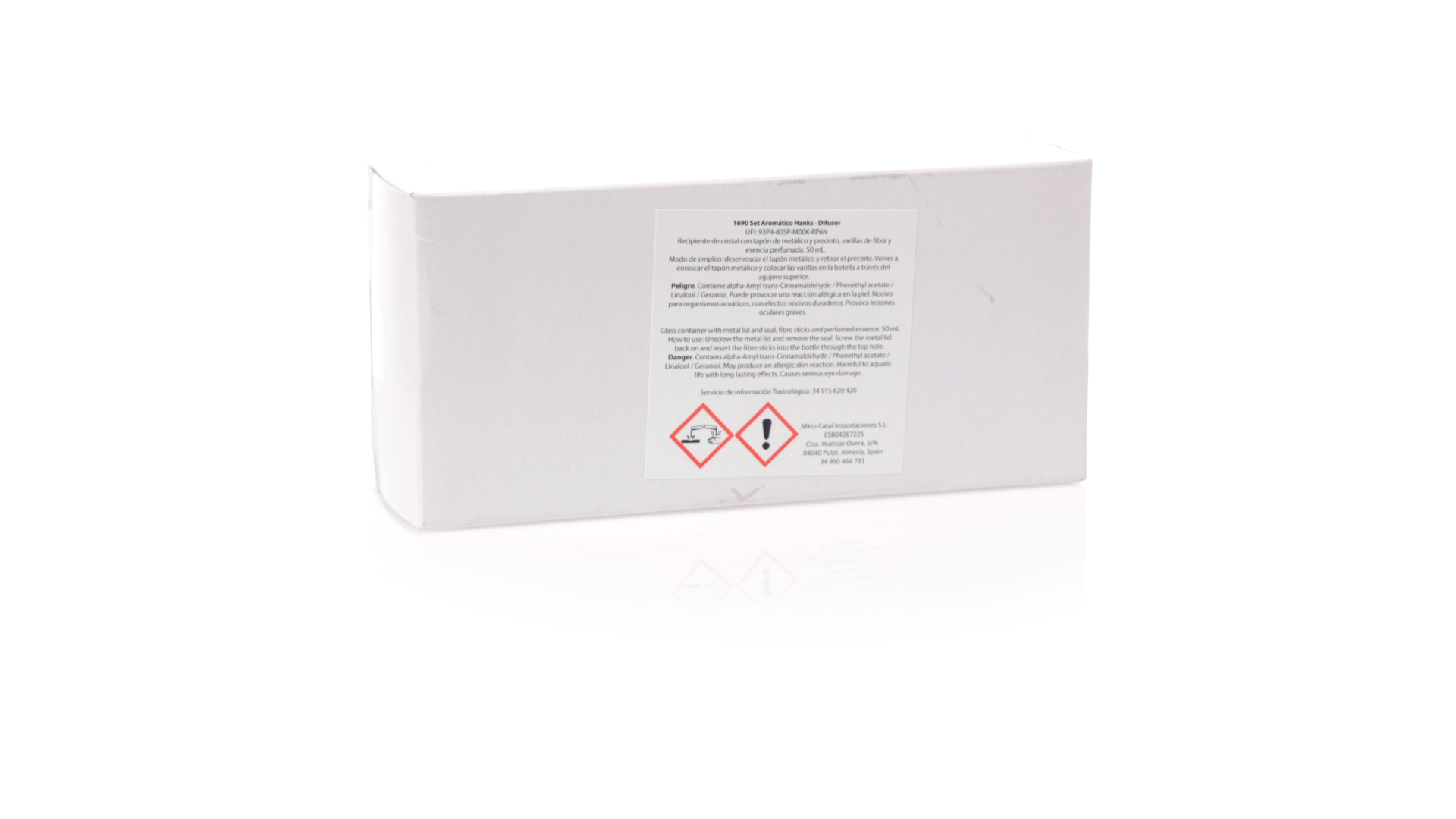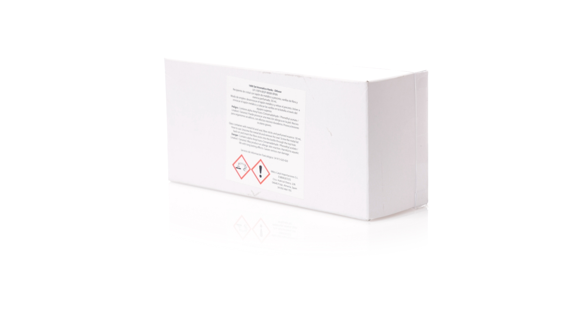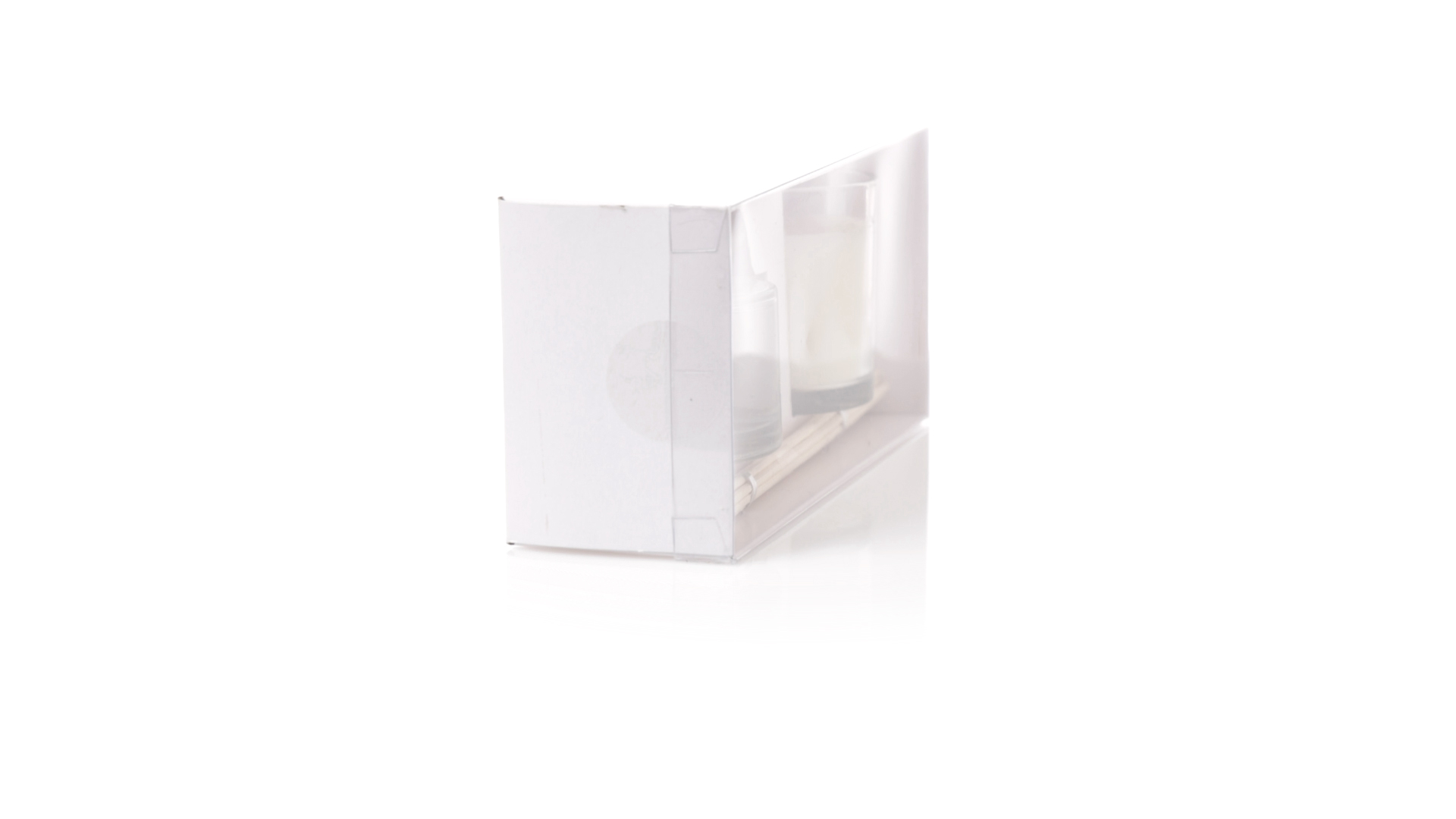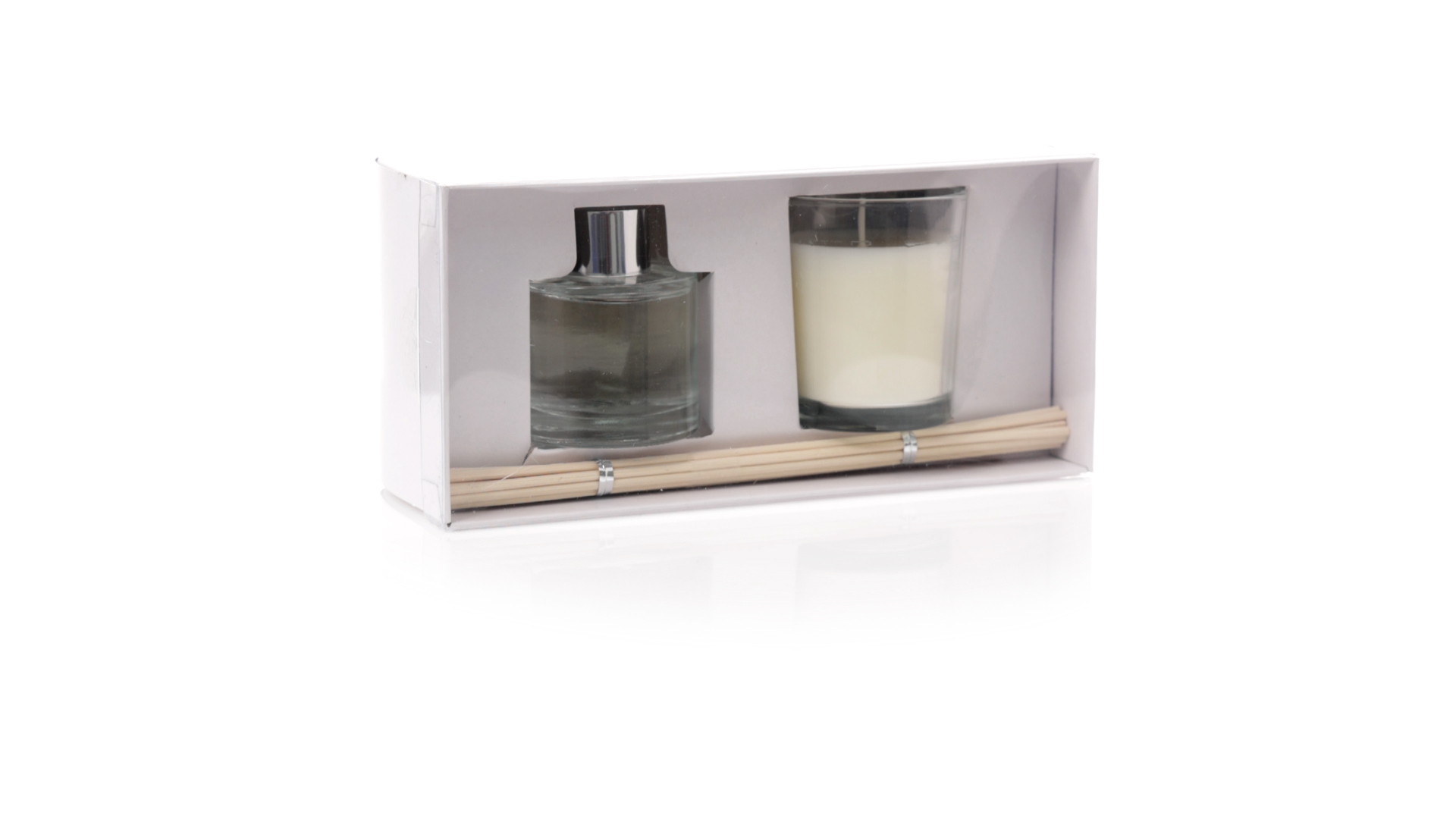 Aromaset mit Diffusor und Kerze. Enthält:Aromadiffusor mit Jasminduft im 50-ml-Glasgefäss, mit 10 Rattanstäbchen und Aluminiumkappe.Vanille-Duftkerze im Glasgefäss.Präsentation im Displaykarton mit Sichtfenster und in einer weissen Schachtel.