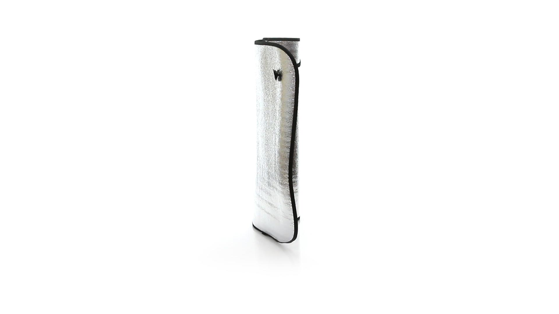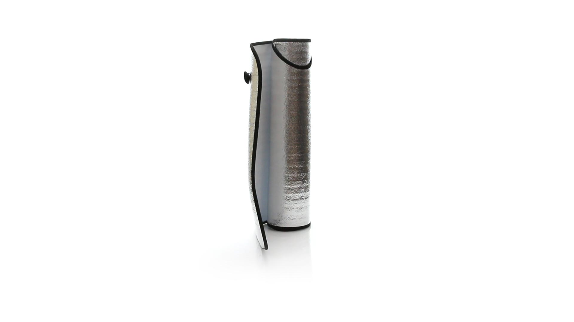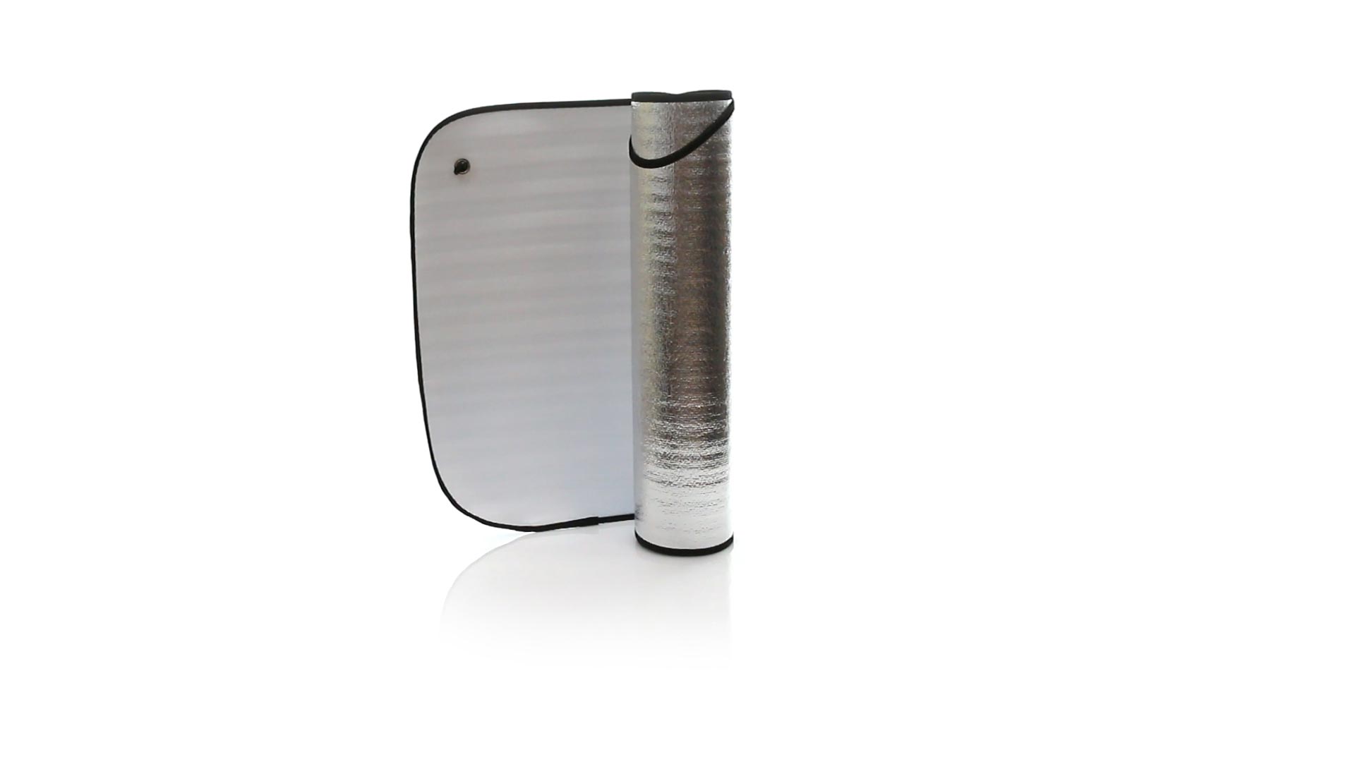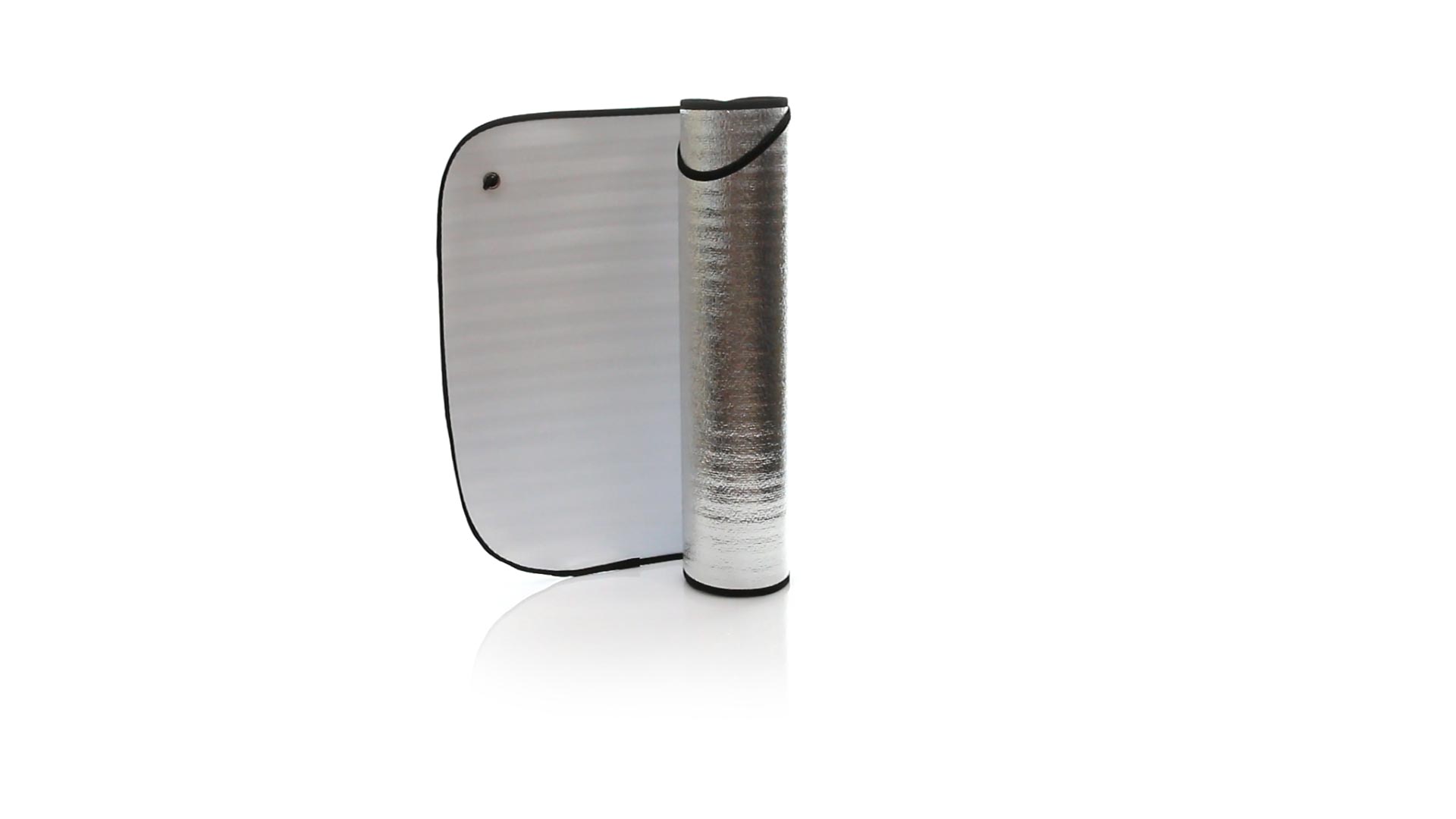 Sonnenschutz mit Vorderseite aus Aluminium und Rückseite aus Schaumstoff. Grösse 130 x 60 cm, mit Non-Woven-Rändern und schwarzen Faltgummis. Inklusive 2 Metallringe und zwei Saugnäpfe zur Befestigung an der Windschutzscheibe. Präsentation in ausgebreiteter Form zur einfachen Bedruckung.