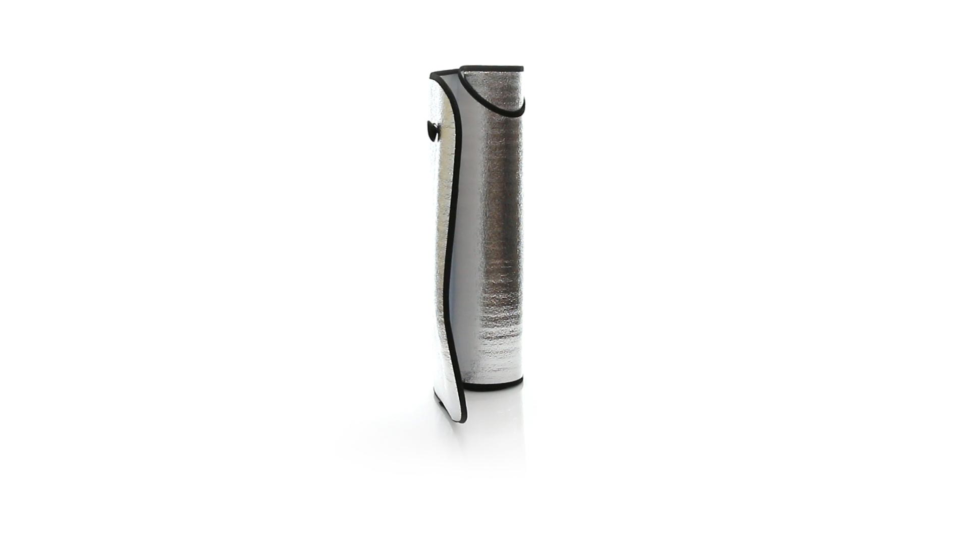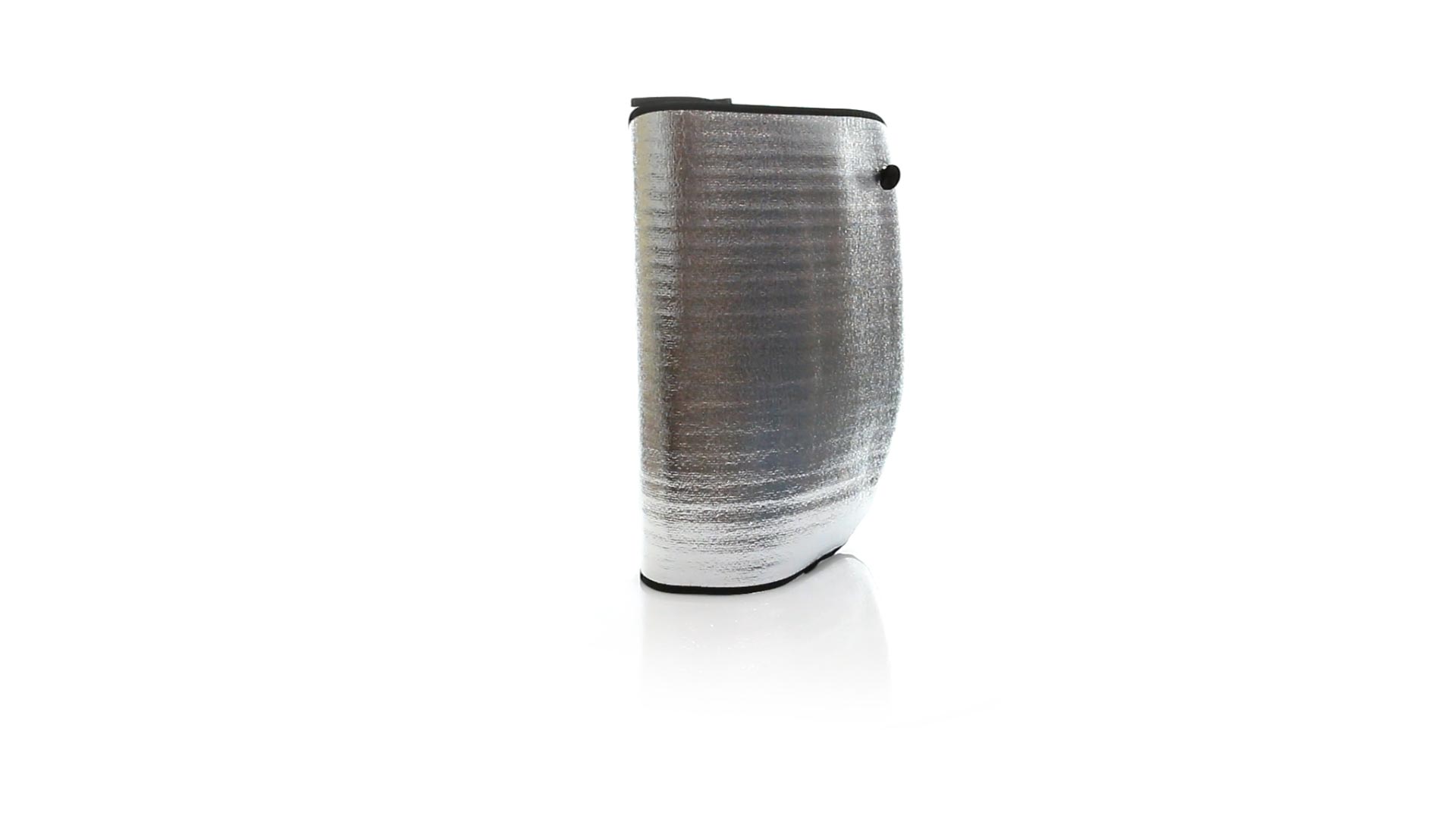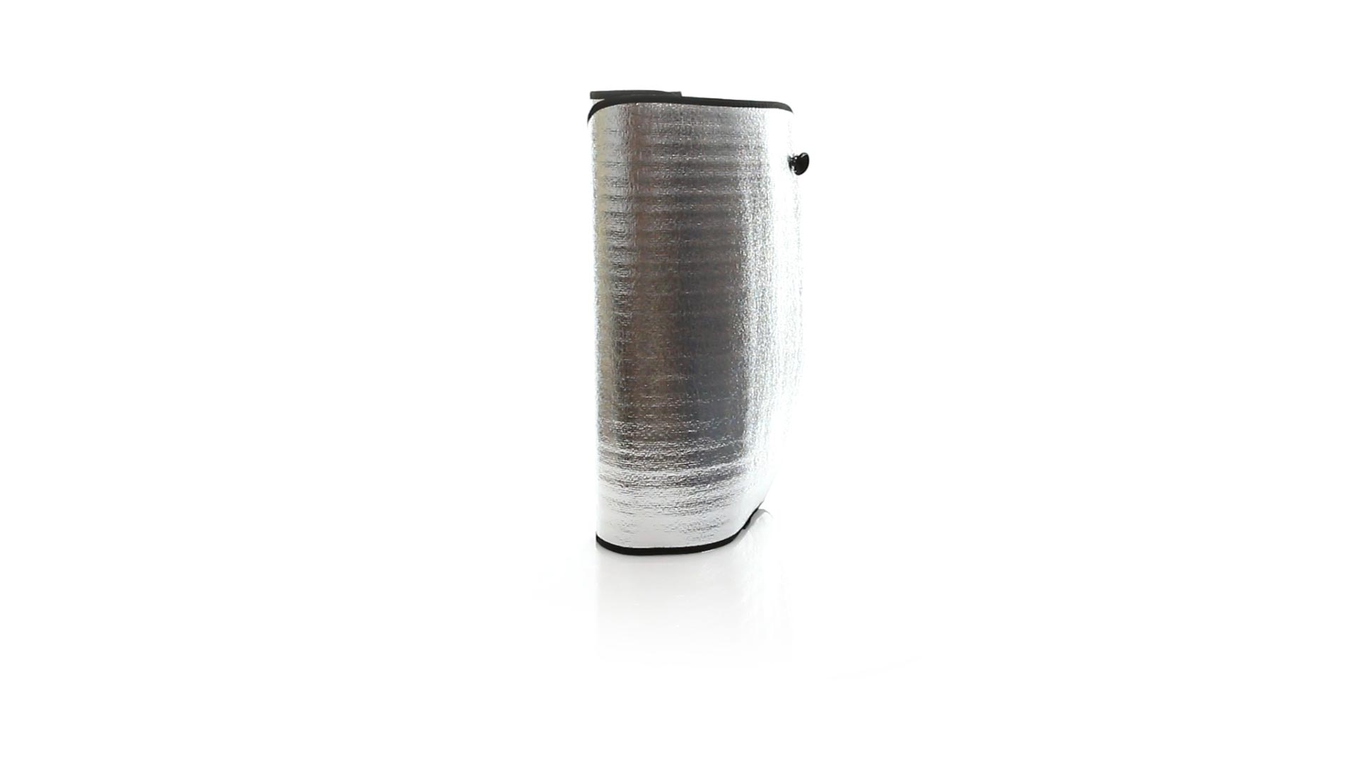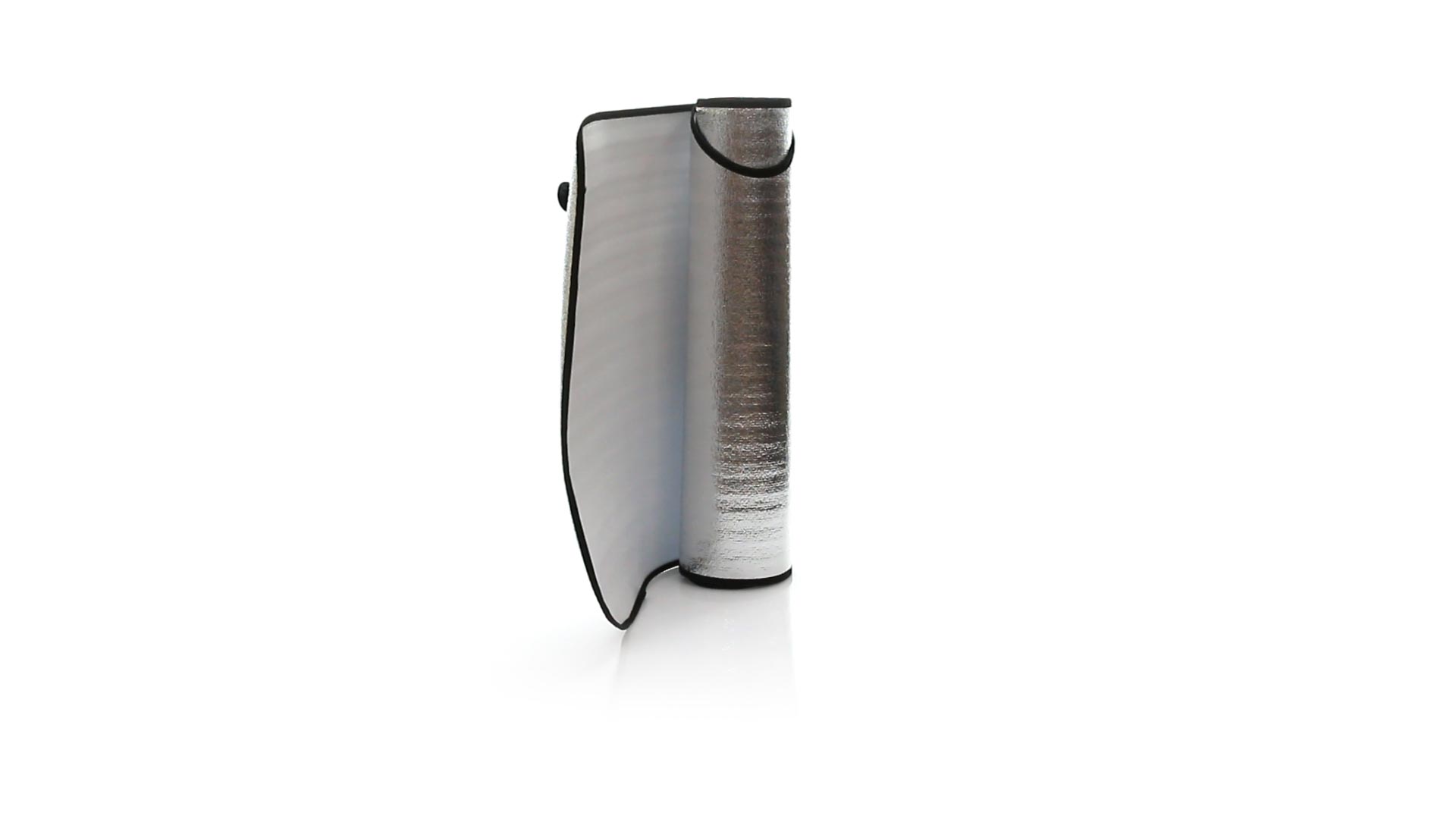 Sonnenschutz mit Vorderseite aus Aluminium und Rückseite aus Schaumstoff. Grösse 130 x 60 cm, mit Non-Woven-Rändern und schwarzen Faltgummis. Inklusive 2 Metallringe und zwei Saugnäpfe zur Befestigung an der Windschutzscheibe. Präsentation in ausgebreiteter Form zur einfachen Bedruckung.