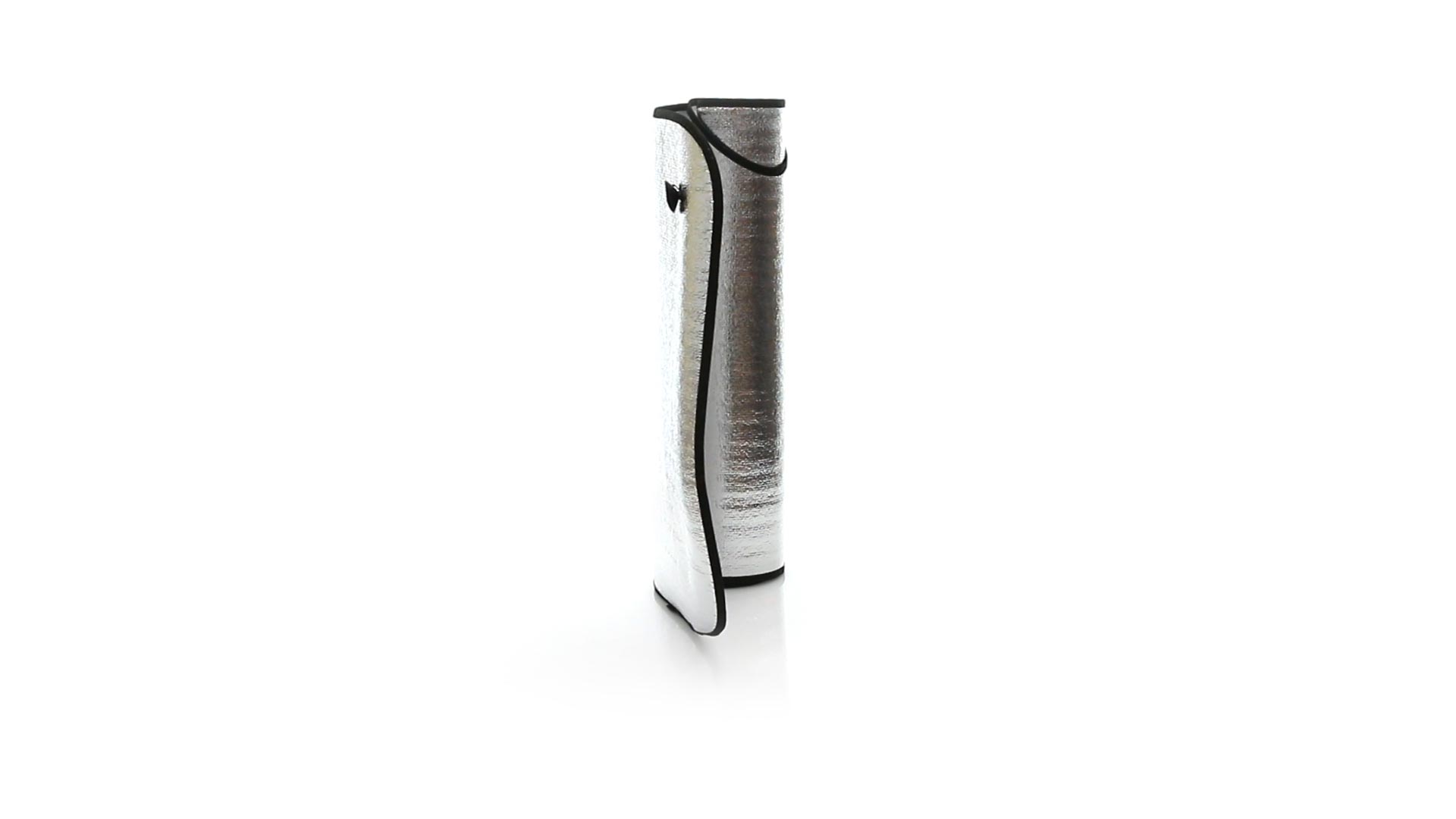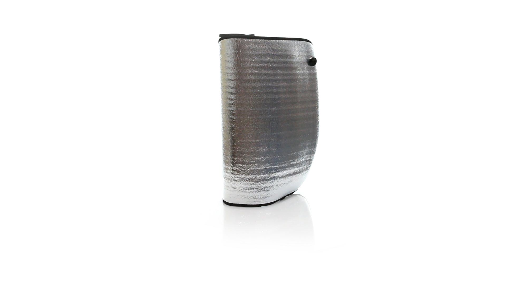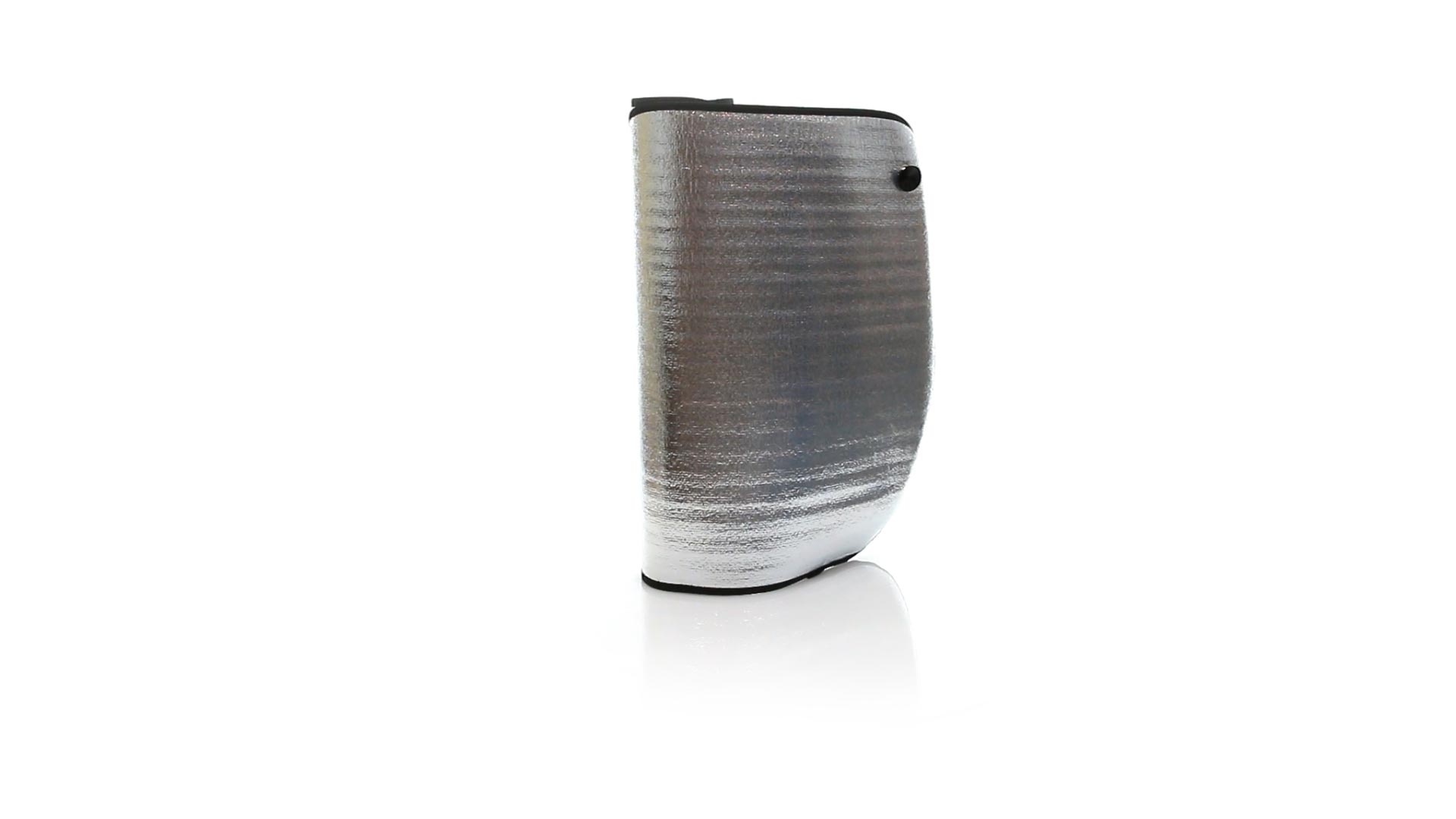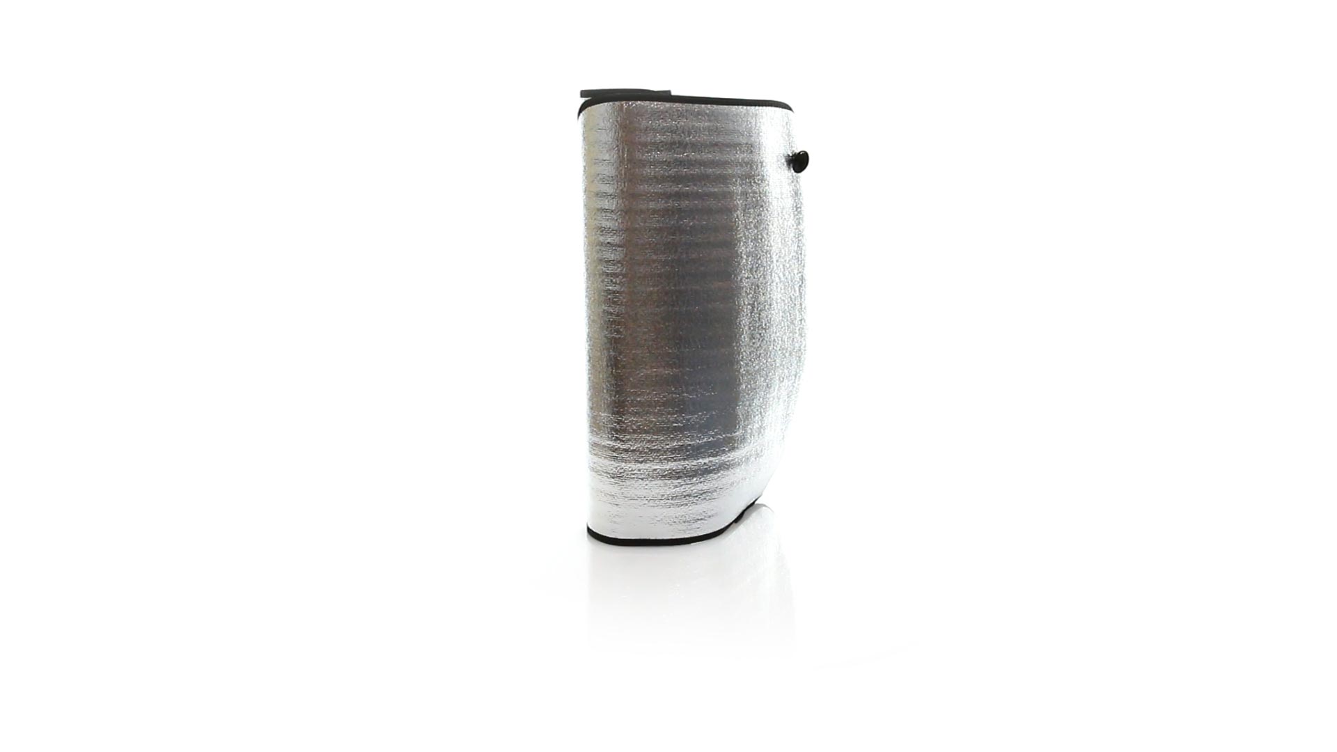 Sonnenschutz mit Vorderseite aus Aluminium und Rückseite aus Schaumstoff. Grösse 130 x 60 cm, mit Non-Woven-Rändern und schwarzen Faltgummis. Inklusive 2 Metallringe und zwei Saugnäpfe zur Befestigung an der Windschutzscheibe. Präsentation in ausgebreiteter Form zur einfachen Bedruckung.