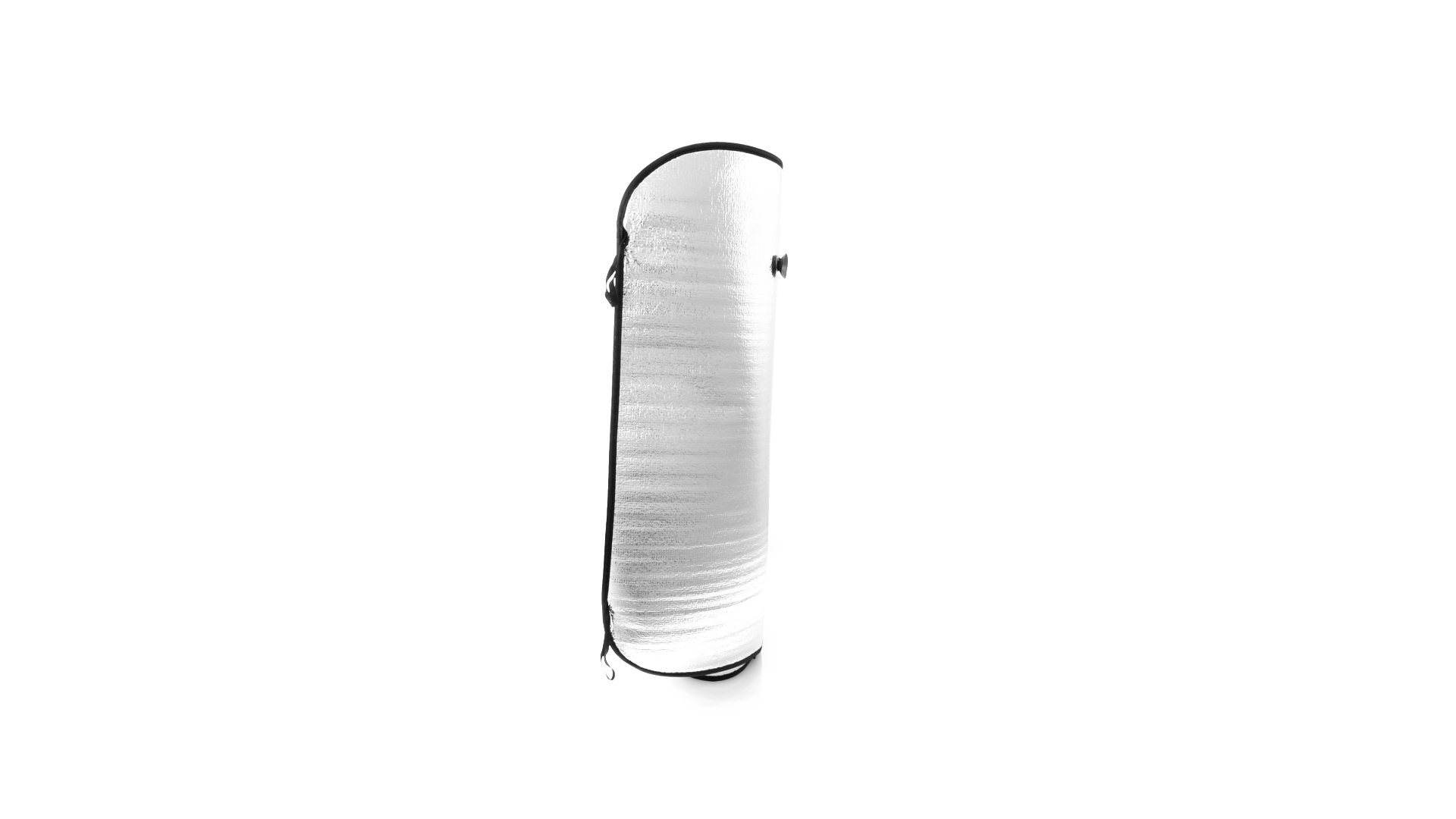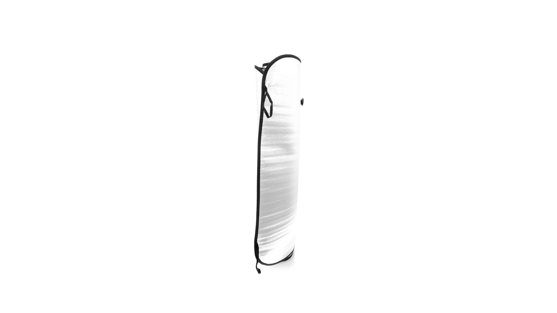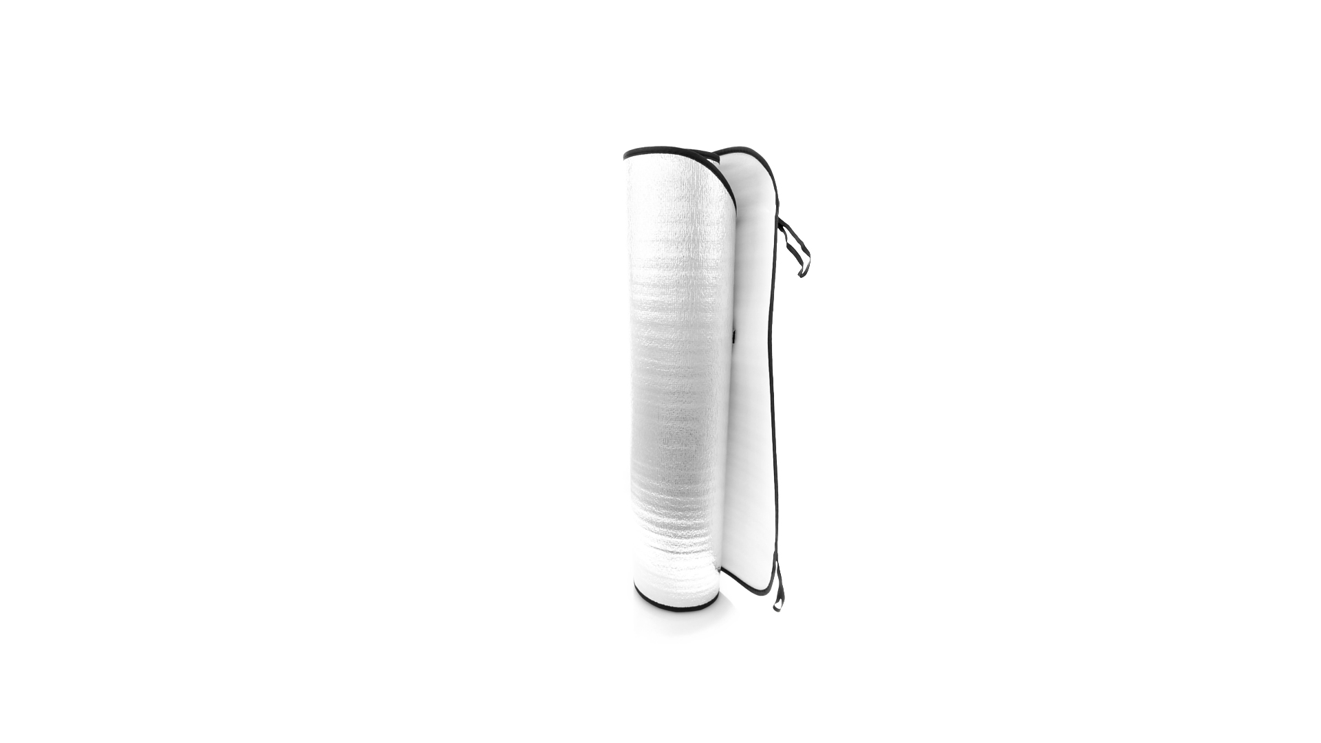 Sonnenschutz aus Aluminum in Metallic-Ausführung mit schwarzer Paspel aus Polyester. Mit den Massen 130 x 70 cm und Schaumstoff auf der Rückseite. Mit Gummibändern zum Fixieren im gefalteten Zustand, Metallösen zur Verstärkung, sowie zwei Saugnäpfen für die Befestigung an der Windschutzscheibe. Präsentiert in ungefaltetem Zustand für einfaches Bedrucken.