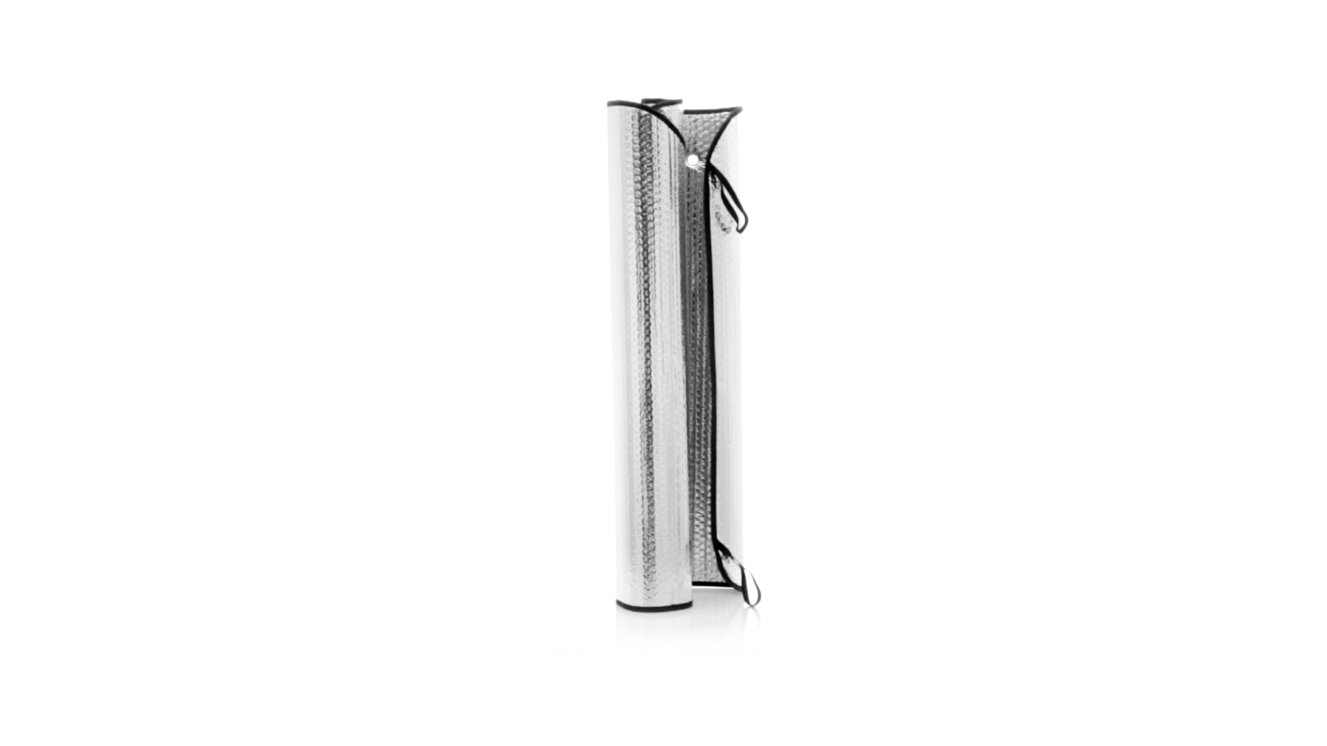 Sonnenschutz aus Aluminum in Silber-Metallic mit schwarzer Paspel. Mit den Massen 130 x 80 cm, Gummibändern zum Fixieren im gefalteten Zustand, Metallösen zur Verstärkung, sowie zwei Saugnäpfen für die Befestigung an der Windschutzscheibe. Präsentiert in ungefaltetem Zustand für einfaches Bedrucken.