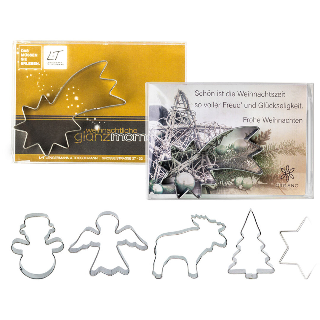 Die sympathischen Backförmchen aus Edelstahl (spülmaschinenfest) sind in der transparenten Box in verschiedenen Motiven erhältlich und werben mit individuell beidseitig bedrucktem Werbeeinleger.