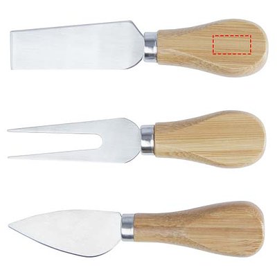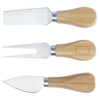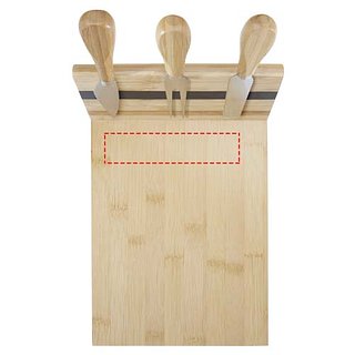 4-teiliges Käseset aus Bambus, bestehend aus einem Käsebrett (30 x 20,2 x 7,6 cm), 2 Käsemesser (12,5 x 2,5 cm und 12,5 x 2,7 cm) und einer Käsegabel (13,5 x 2,4 cm). An der Seite des Käsebretts befindet sich ein Magnetstreifen, an dem das Käsebesteck befestigt wird, so dass Sie den Käse stilvoll servieren können. Der verwendete Bambus wird nach nachhaltigen Normen beschafft und produziert.