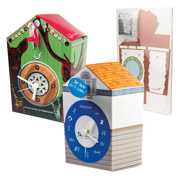 Zeit für erfolgreiche Werbekontakte: Die traditionelle Kuckucksuhr wird zum trendigen Werbeträger und begehrten Bastel-Objekt. Vollflächig 4-c bedruckbar und als Set inkl. Uhrwerk, Batterie und aufsteckbarem Kuckuck und/oder Sprechblase geliefert, schmückt die Uhr dauerhaft und begeistert.