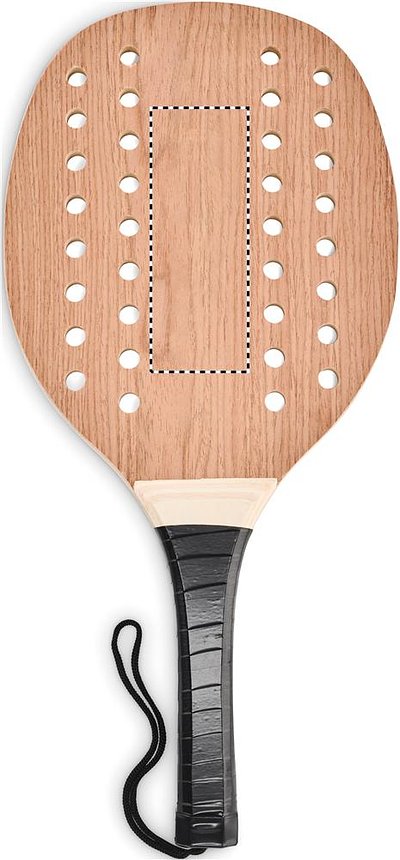 Beachball Spiel mit 2 Schlägern aus Rosenholz mit PU-Griffteil und einem soften Ball. Lieferung im Baumwollnetz mit Kordelzug.