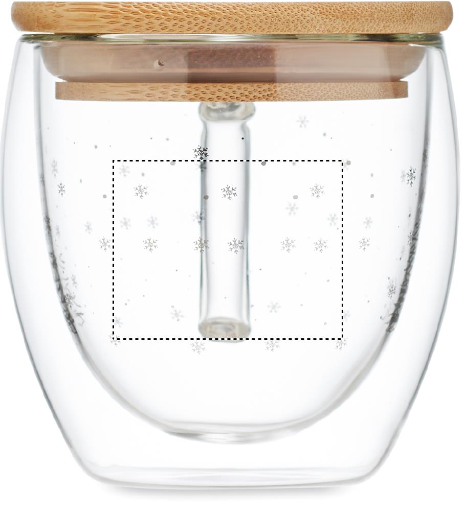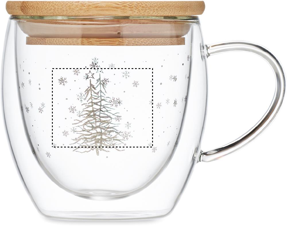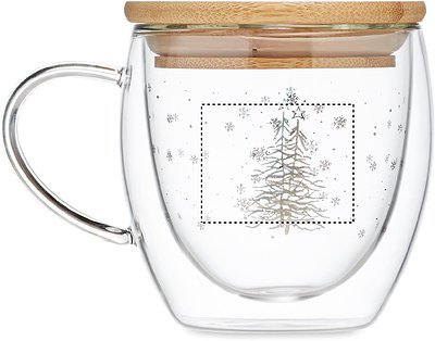 Doppelwandiger Becher mit Weihnachtsbaum-Dekor aus Borosilikatglas. Deckel aus Bambus. Füllmenge: 220 ml. Bambus ist ein natürliches Produkt, es kann daher zu leichten Abweichungen in Farbe, Dekor und Massen kommen.