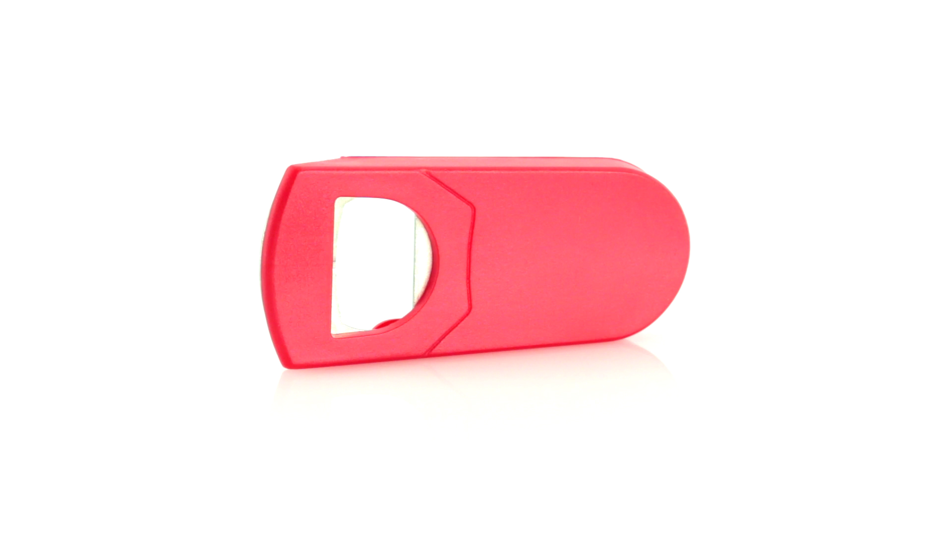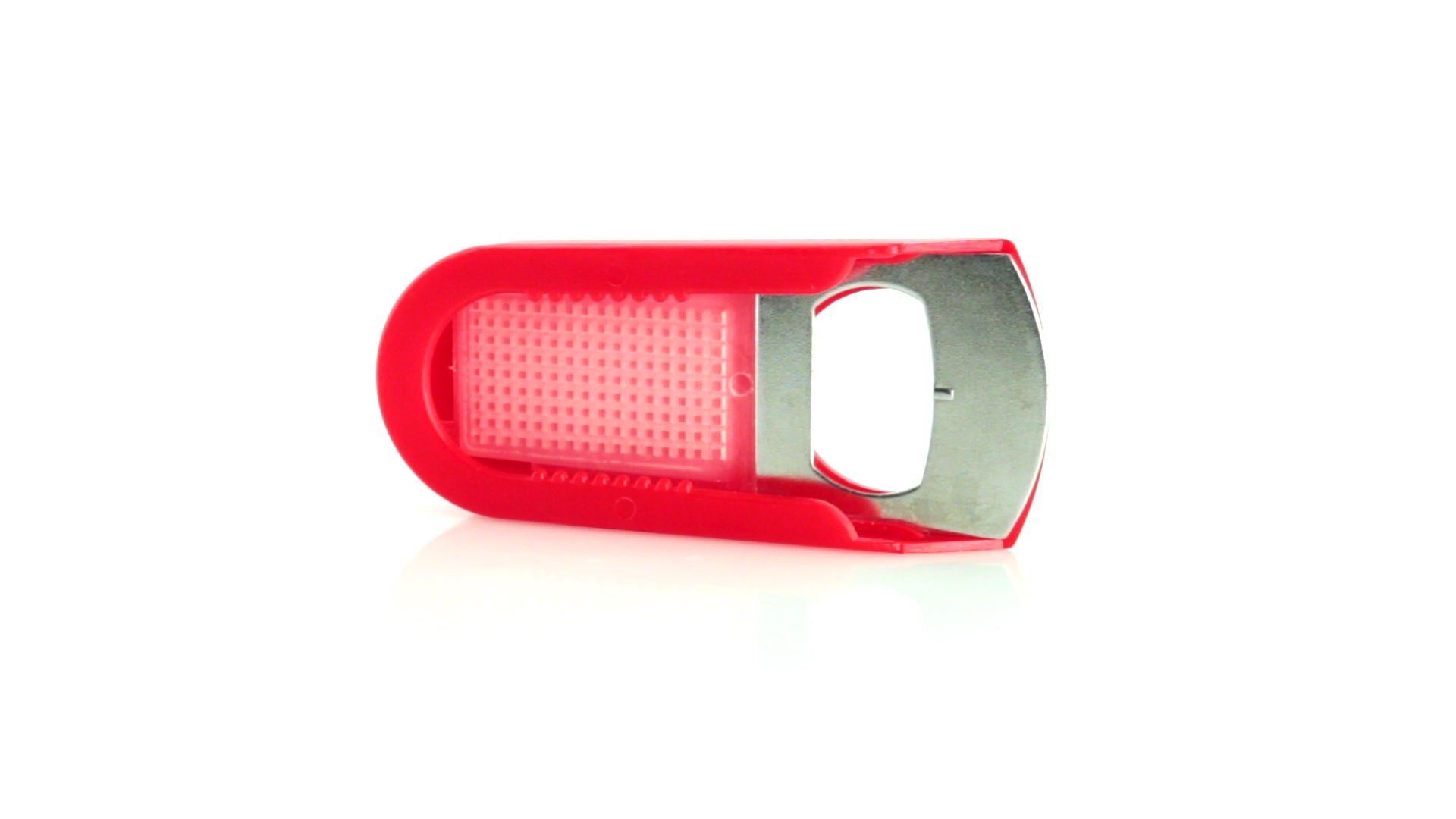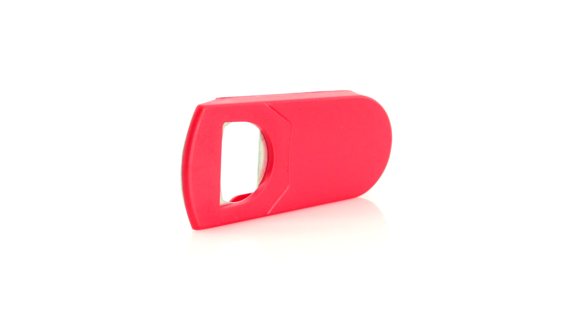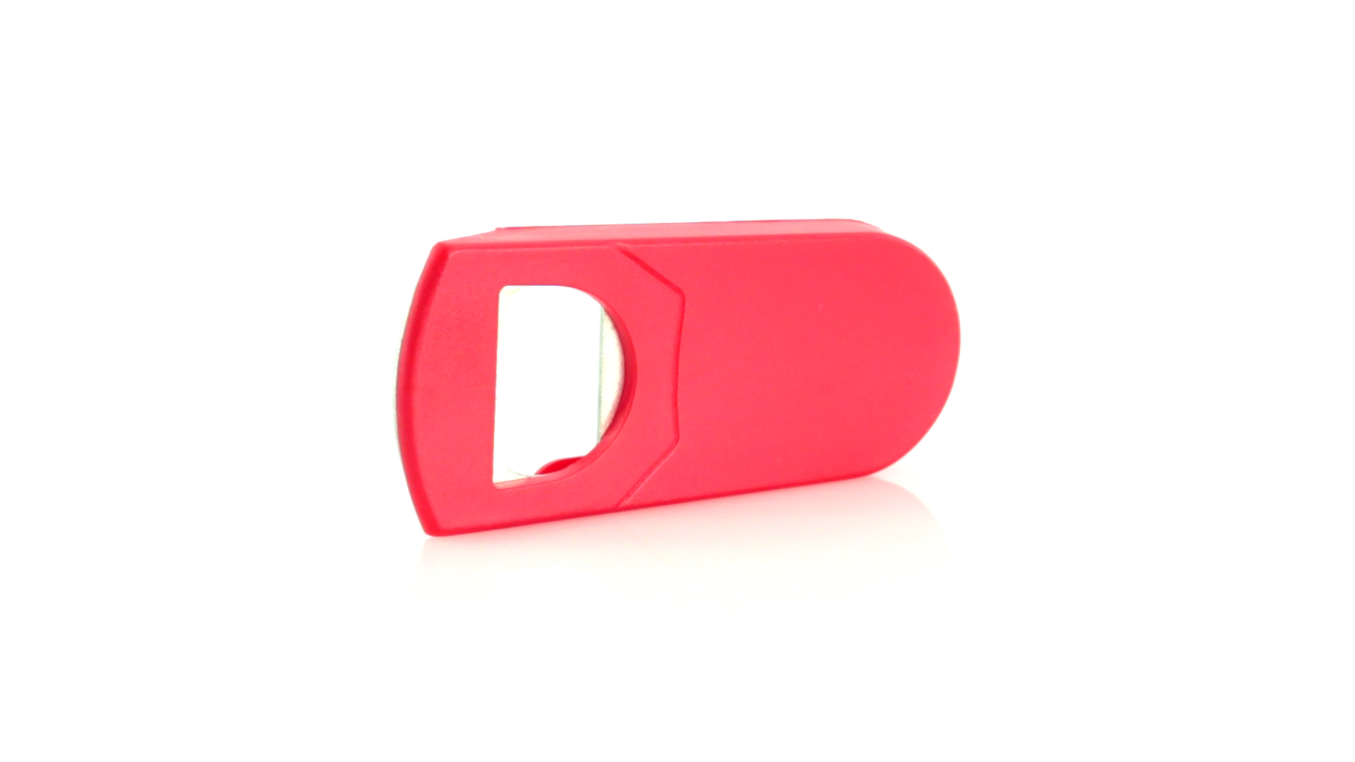 Flaschenöffner mit robustem Körper in verschiedenen Farben. Mit Metallheber zum Öffnen. Rückseite mit Flaschendeckel.