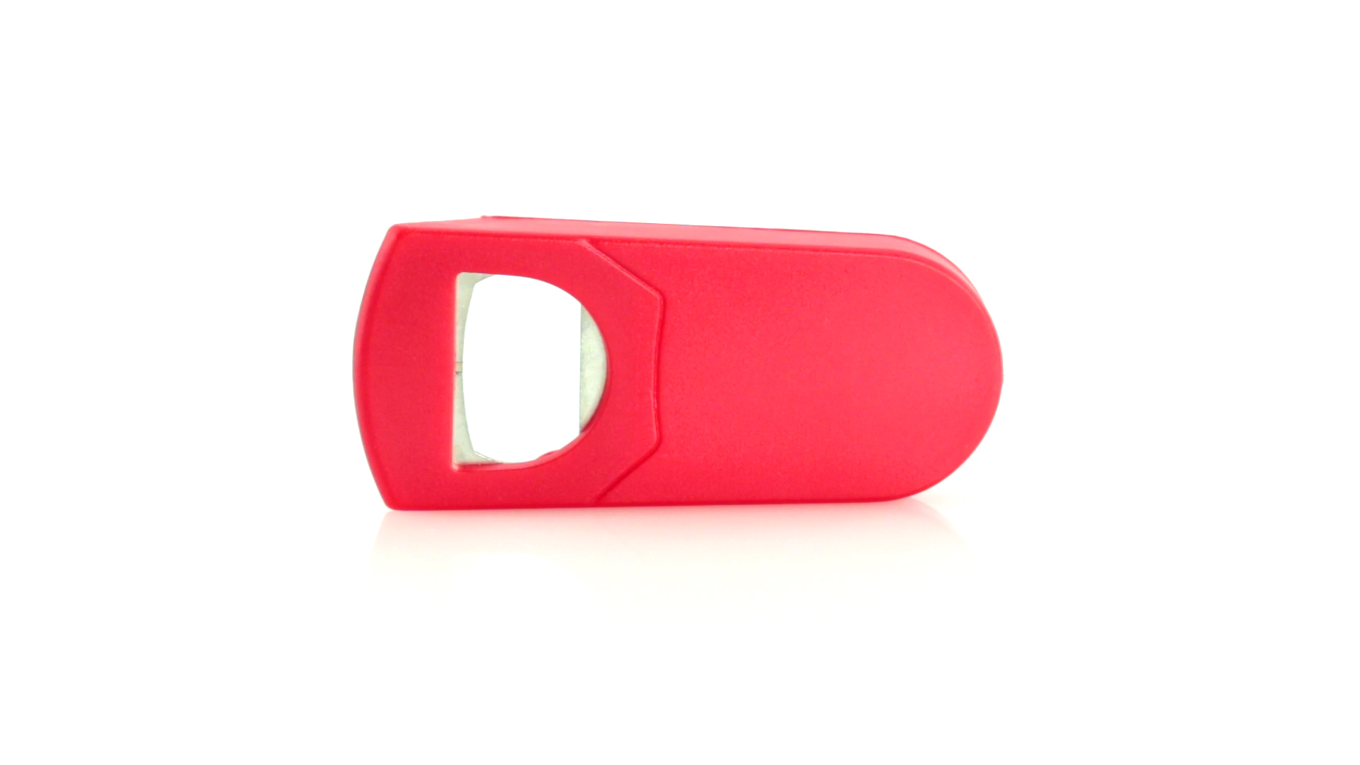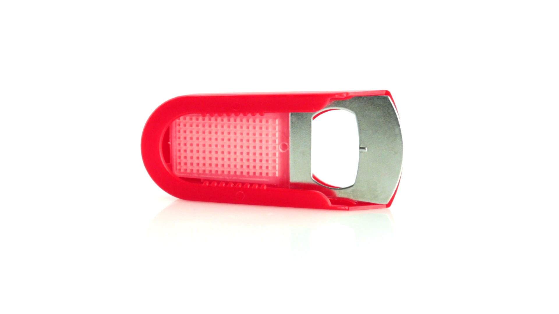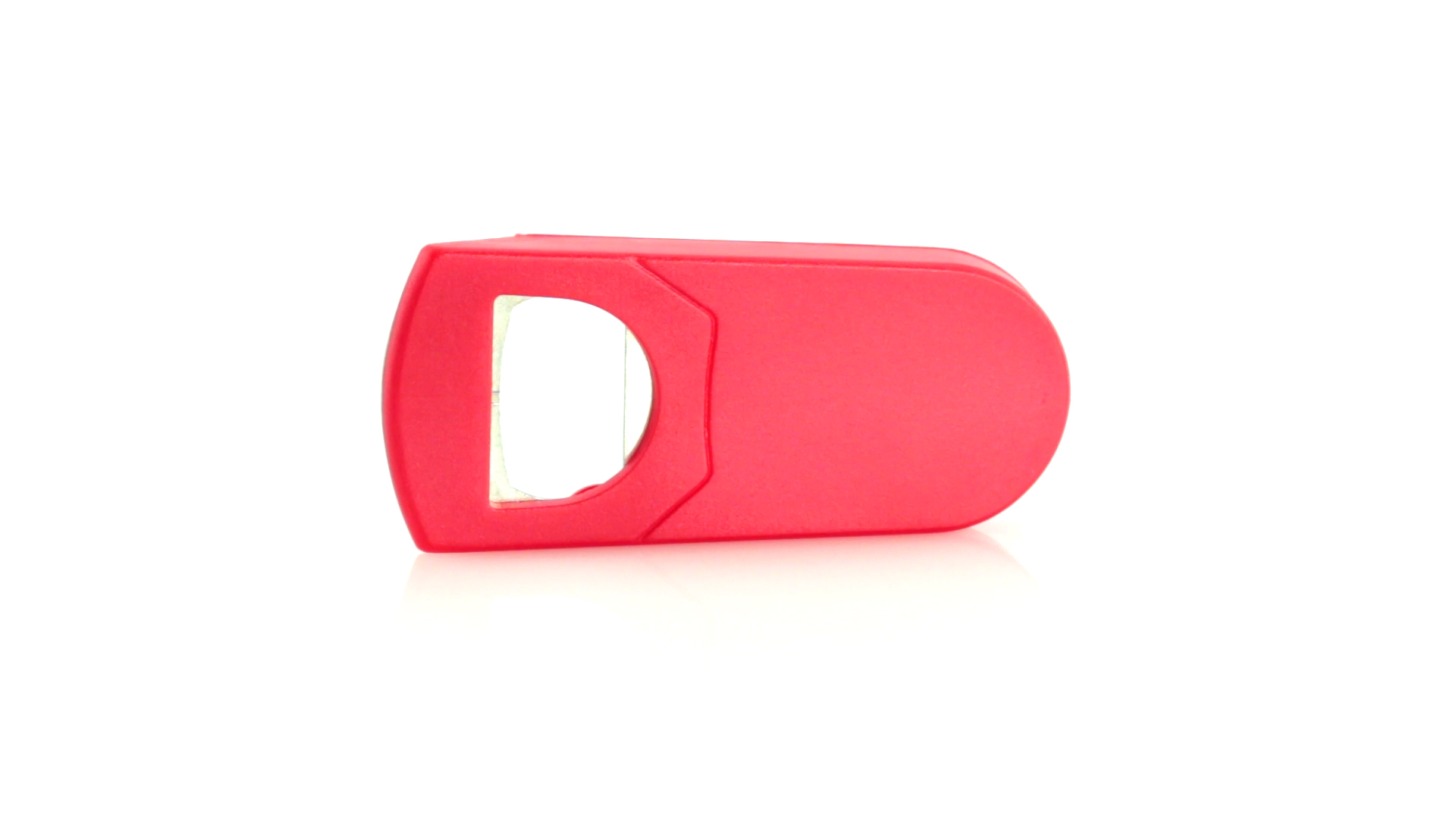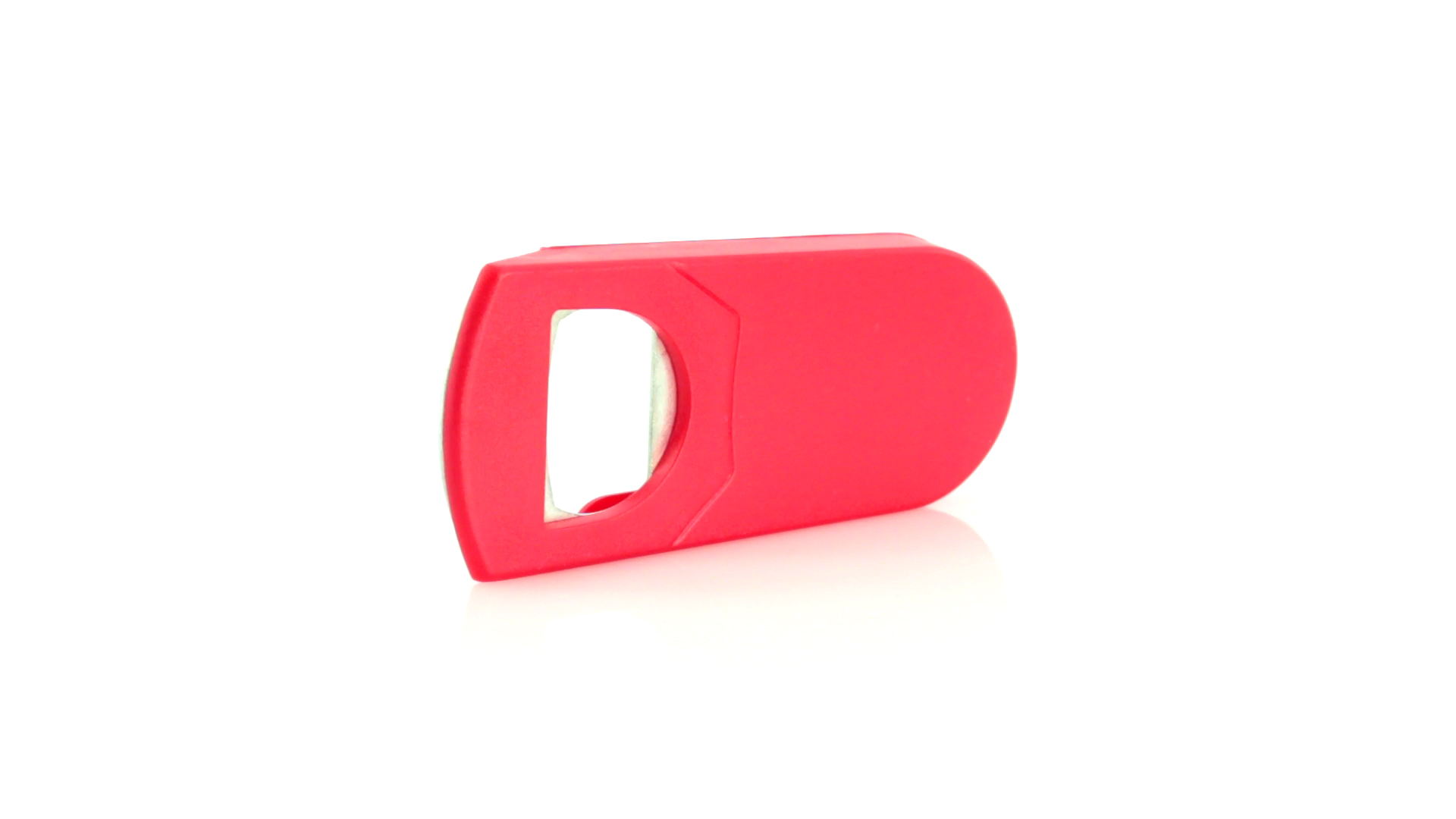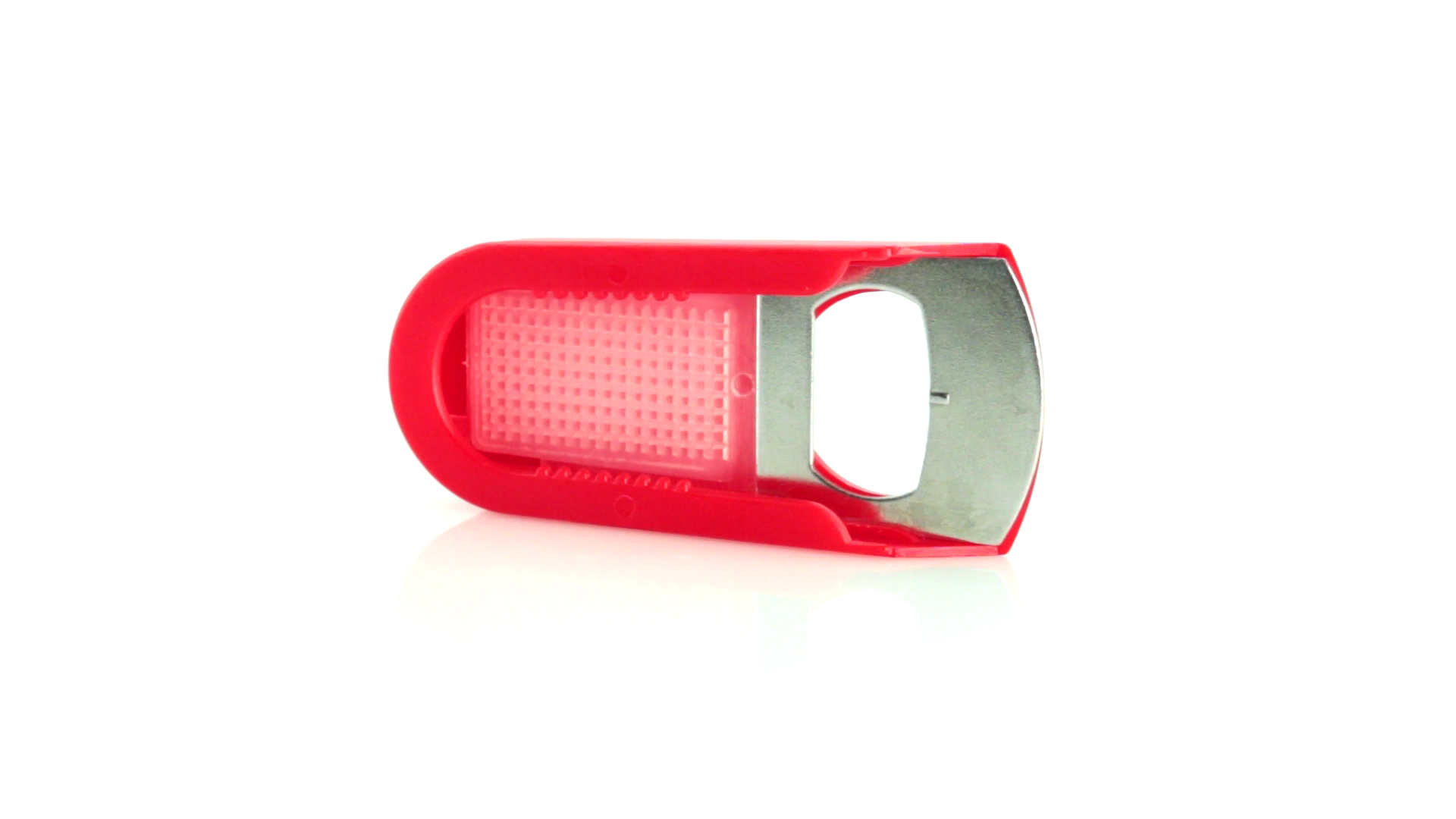 Flaschenöffner mit robustem Körper in verschiedenen Farben. Mit Metallheber zum Öffnen. Rückseite mit Flaschendeckel.
