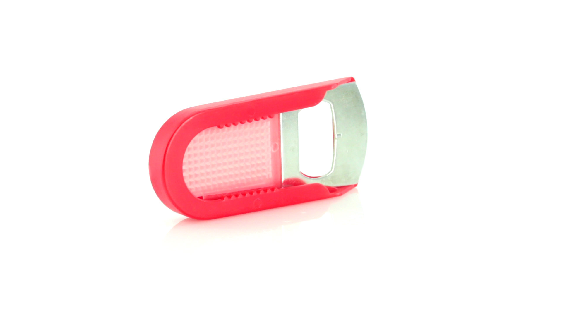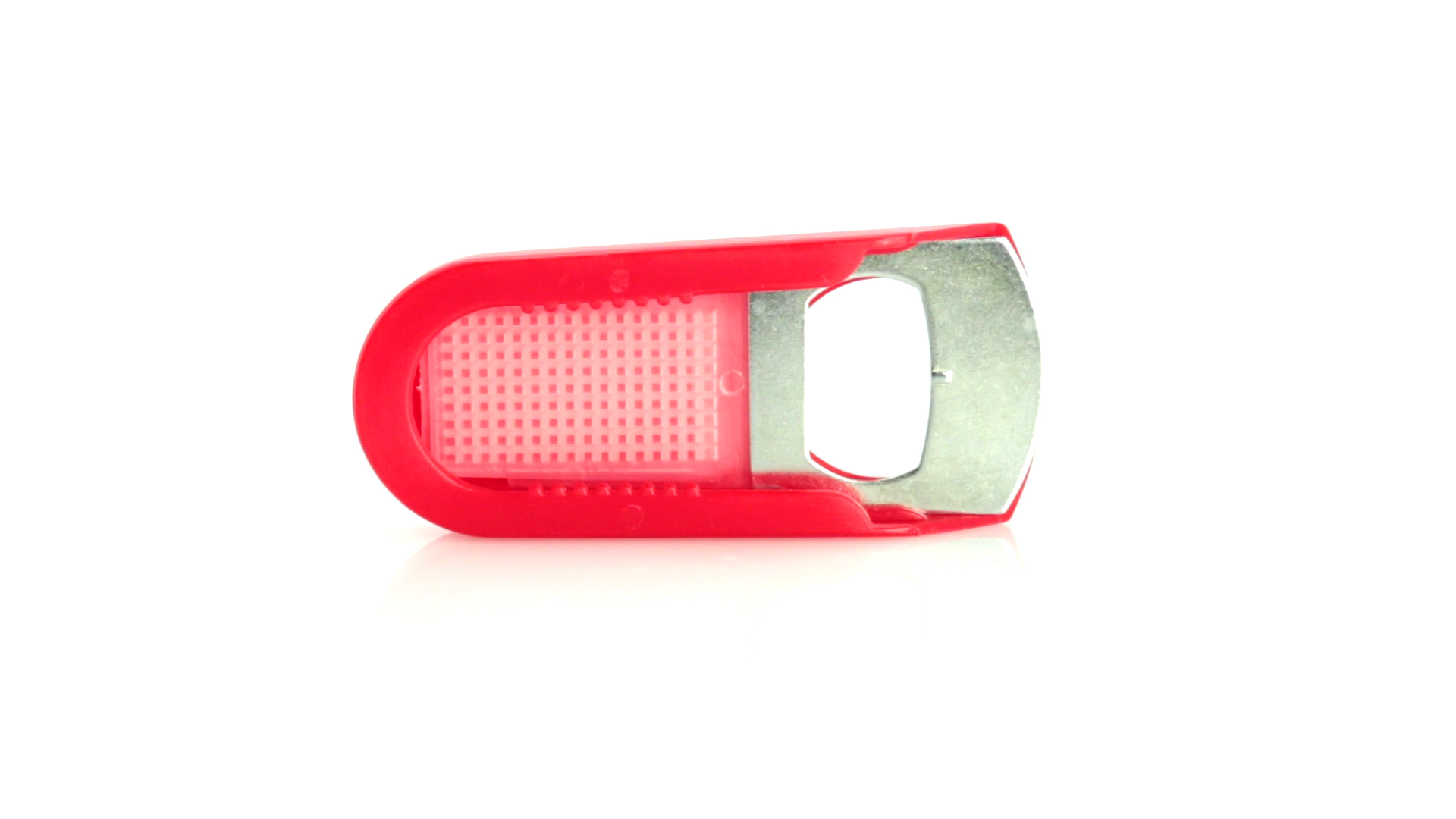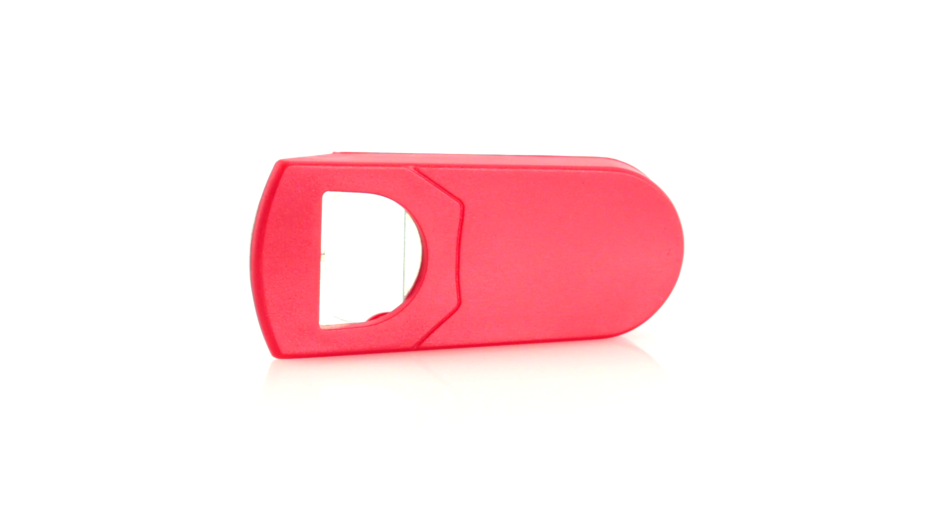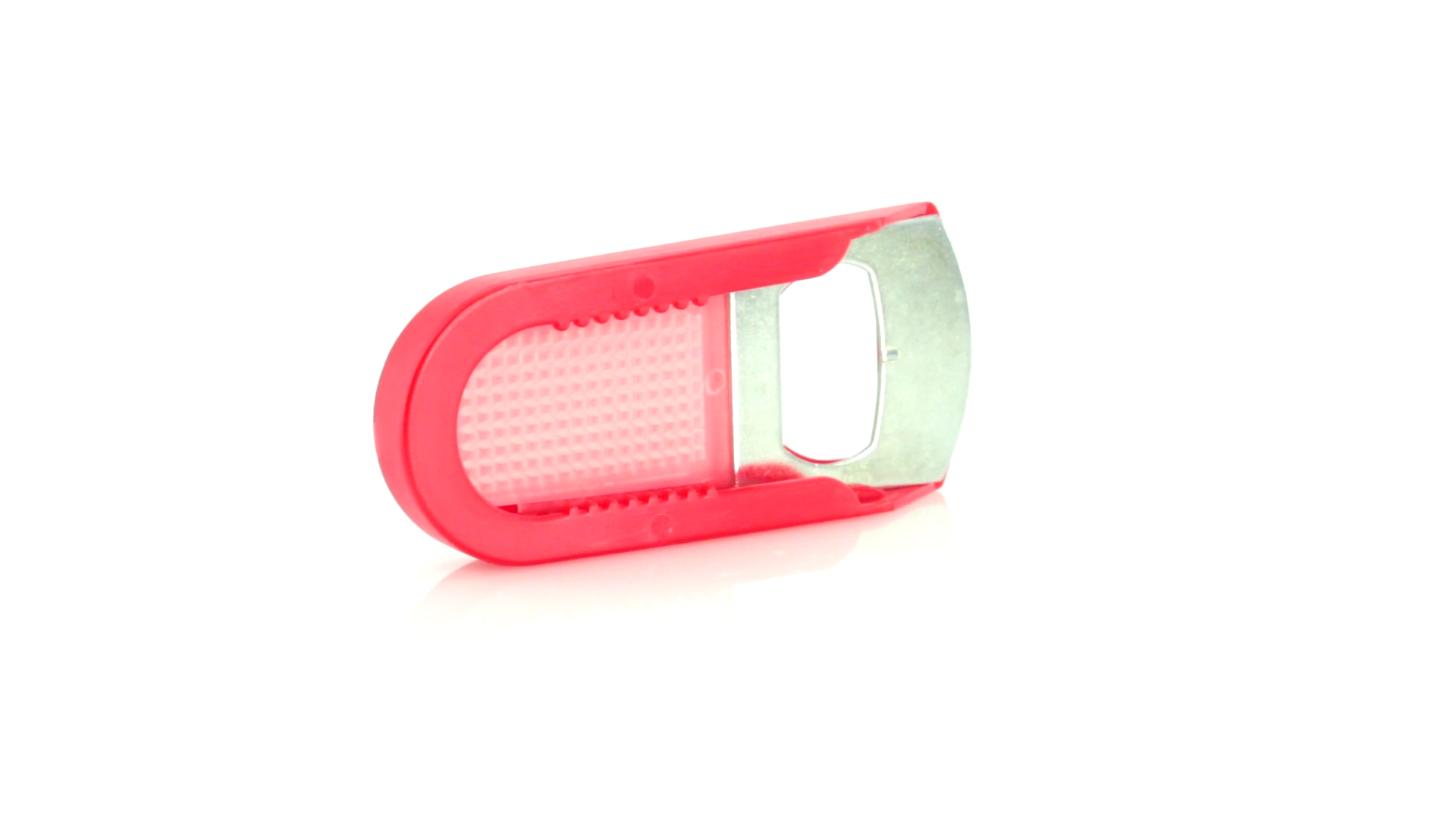 Flaschenöffner mit robustem Körper in verschiedenen Farben. Mit Metallheber zum Öffnen. Rückseite mit Flaschendeckel.