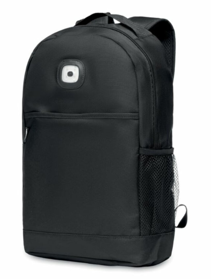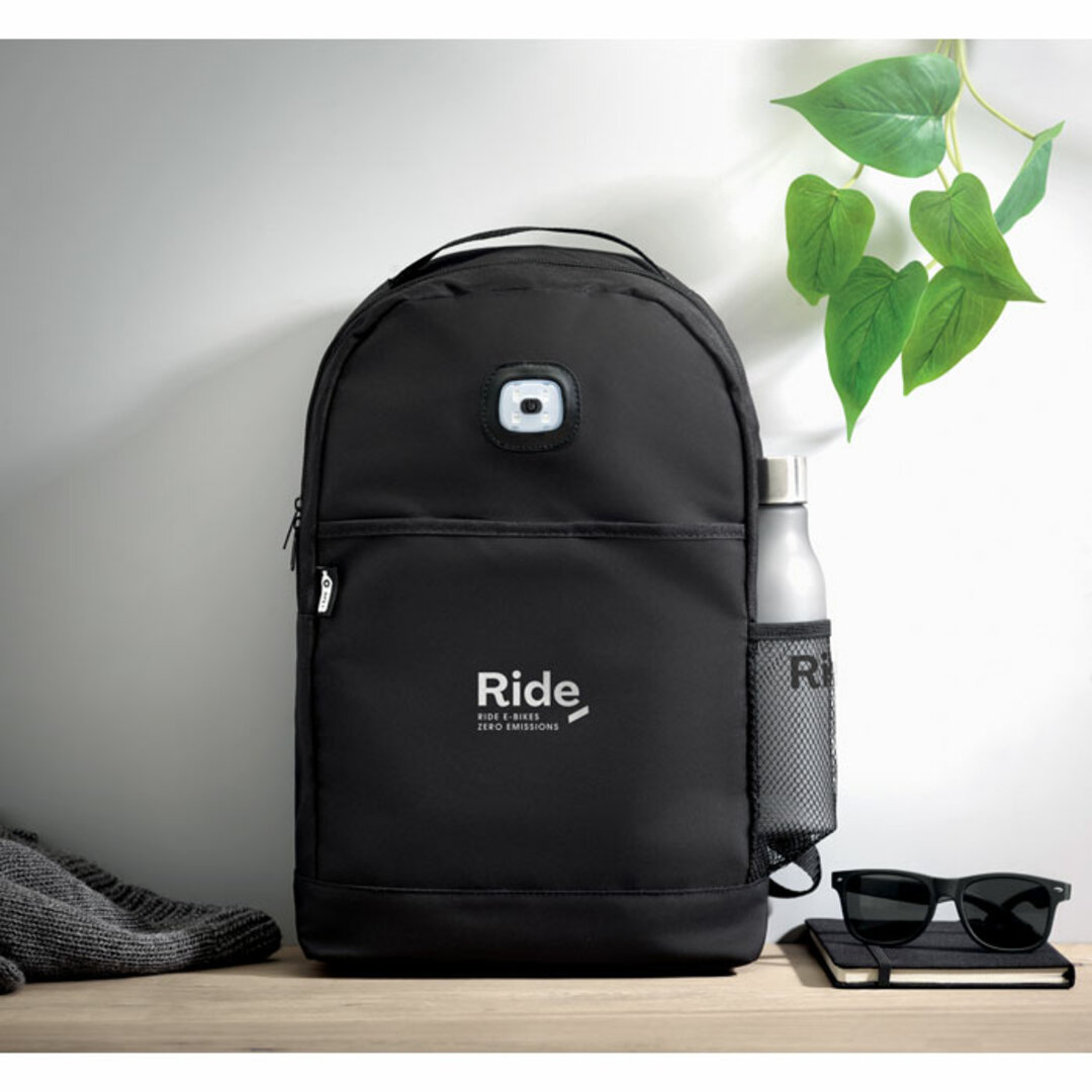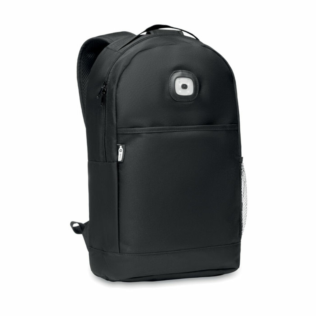 Entdecke deinen umweltfreundlichen 600D RPET Rucksack mit abnehmbarem COB Licht und deinem individuellen Logo im Siebdruck!