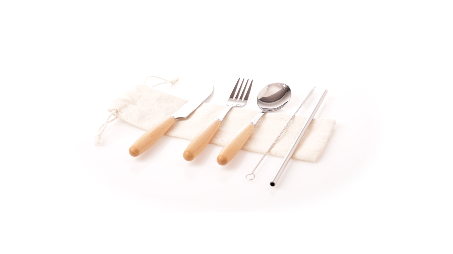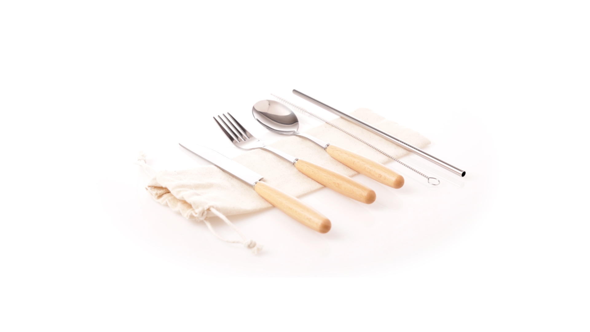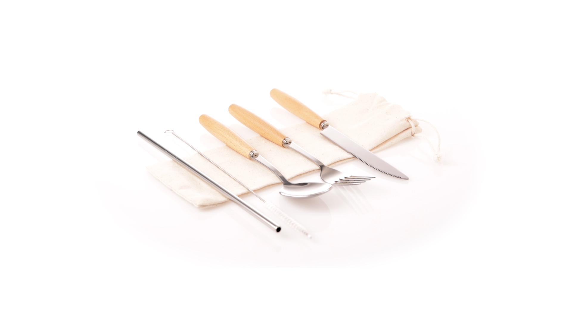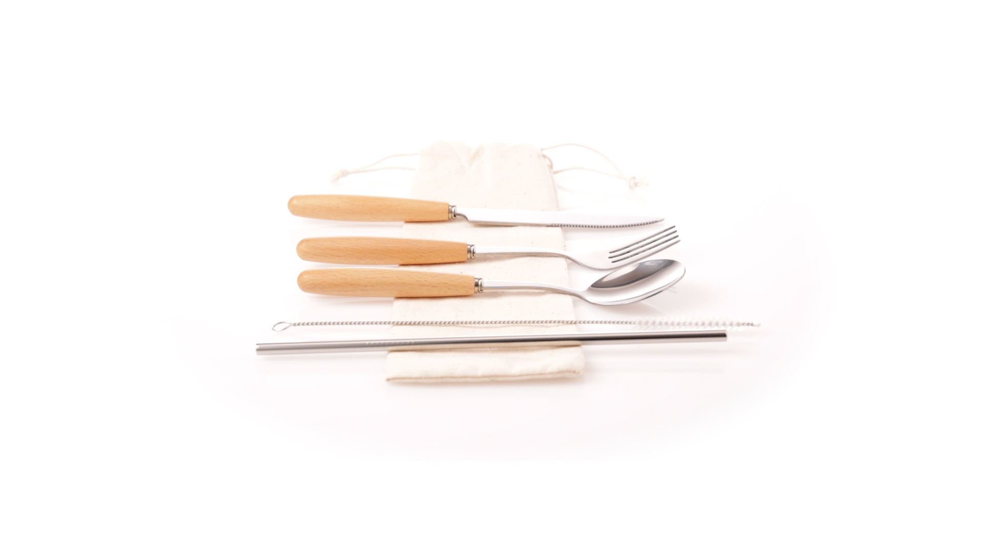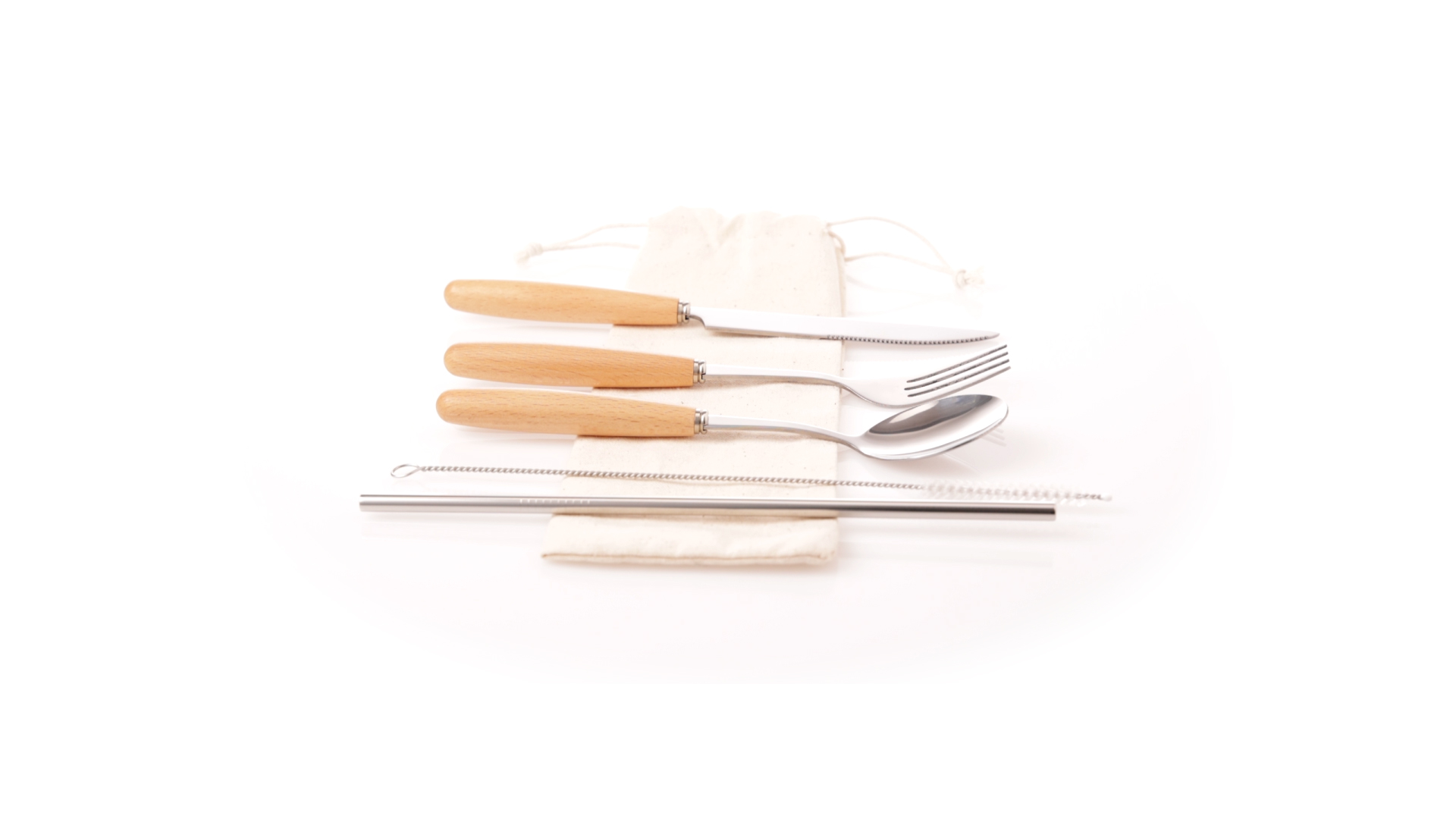 5-teiliges Besteckset aus rostfreiem Stahl, mit Naturholzgriff. Inklusive Löffel, Gabel, Messer, wiederverwendbarem Strohhalm und Reinigungsbürste für den Strohhalm. Präsentiert in einem Beutel aus natürlicher Baumwolle mit Kordelzugverschluss.