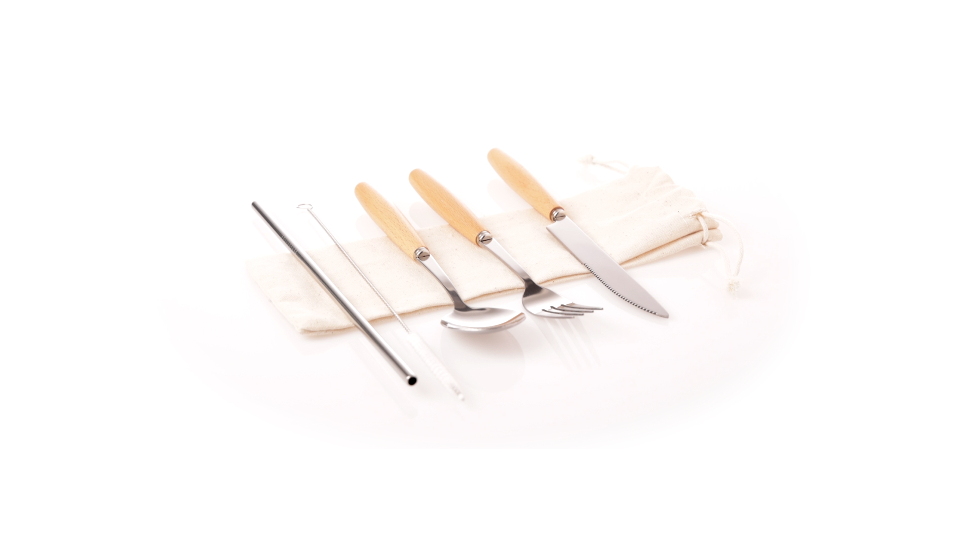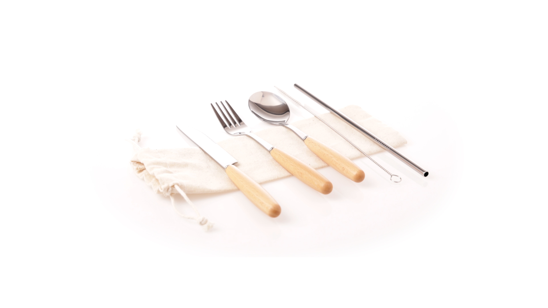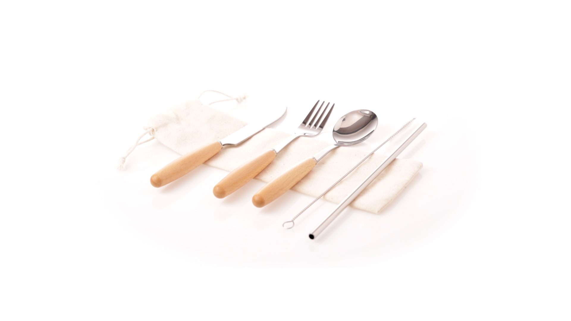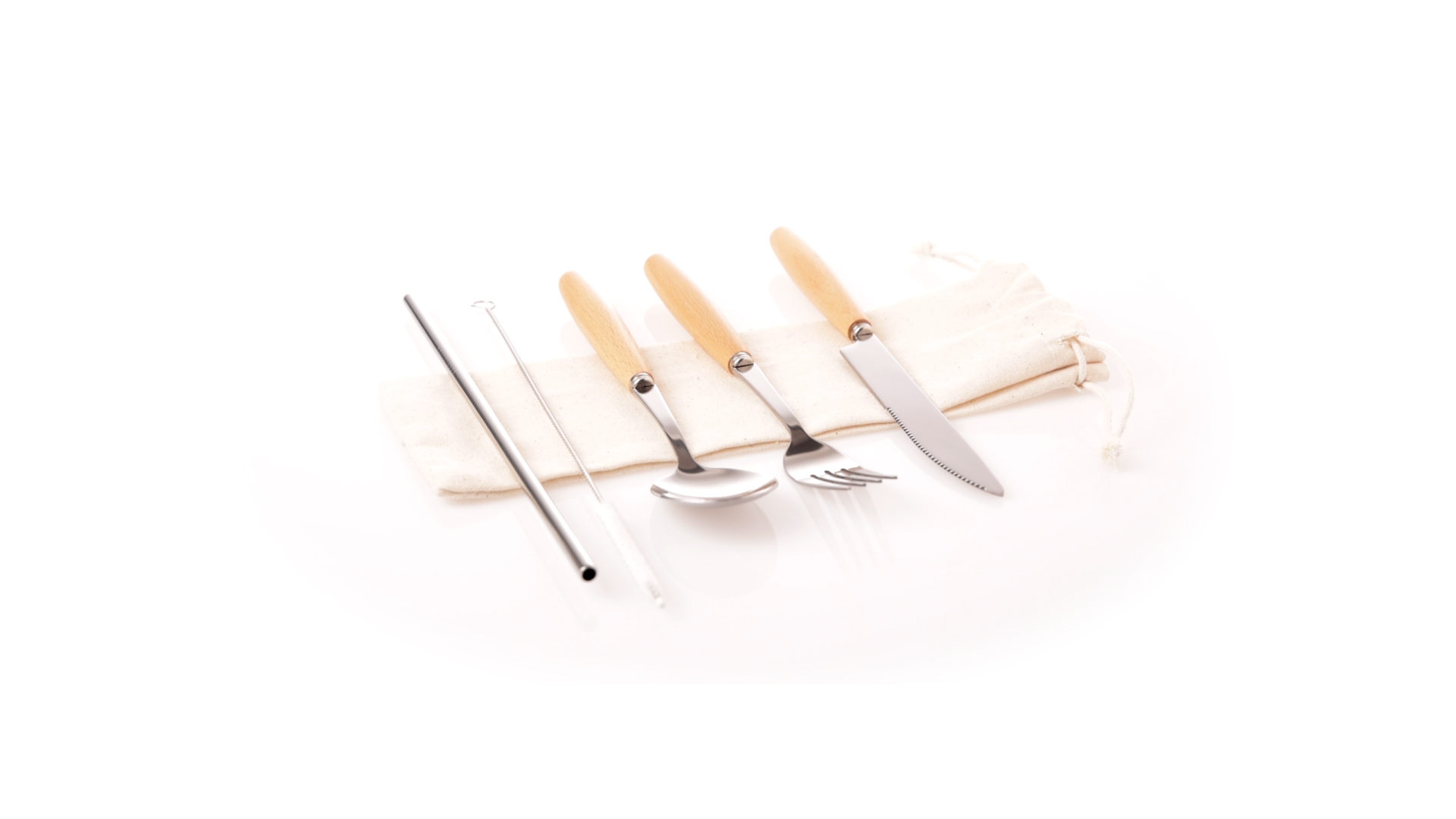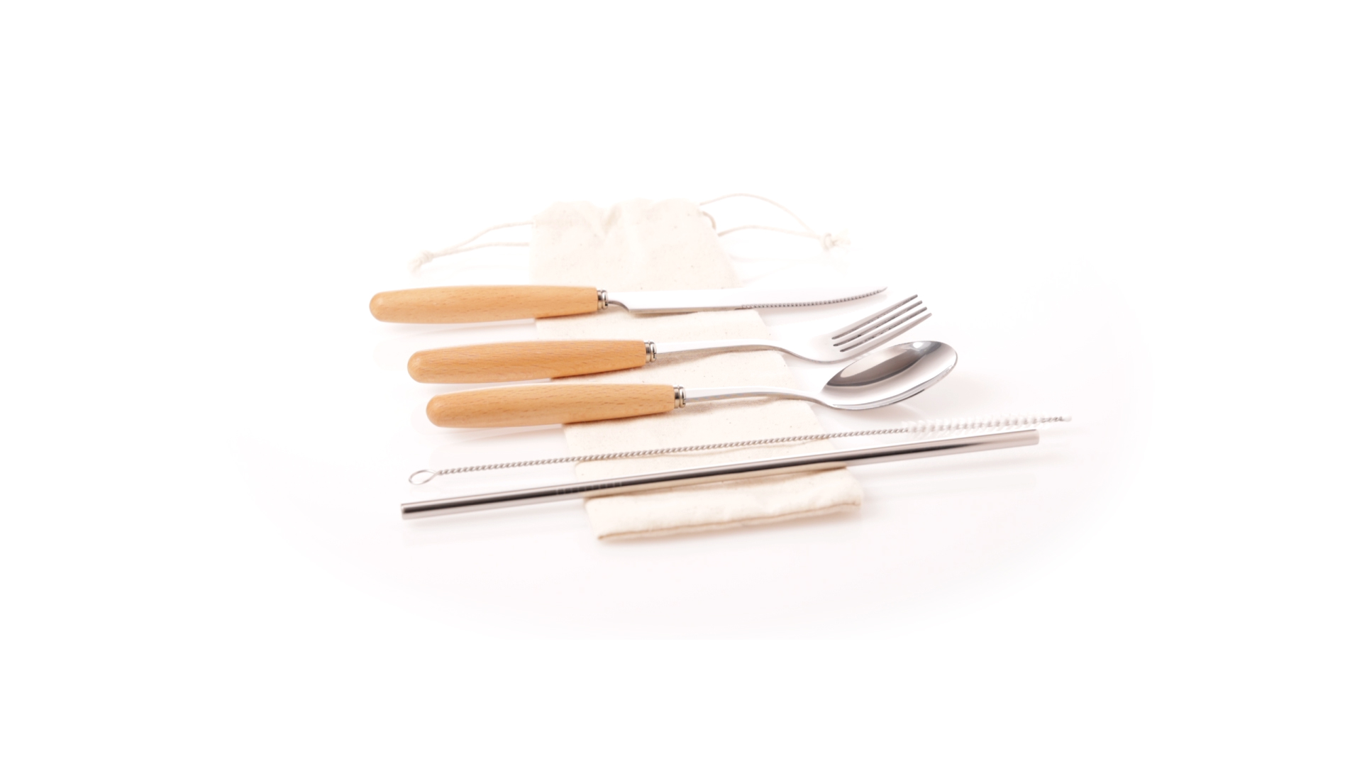 5-teiliges Besteckset aus rostfreiem Stahl, mit Naturholzgriff. Inklusive Löffel, Gabel, Messer, wiederverwendbarem Strohhalm und Reinigungsbürste für den Strohhalm. Präsentiert in einem Beutel aus natürlicher Baumwolle mit Kordelzugverschluss.
