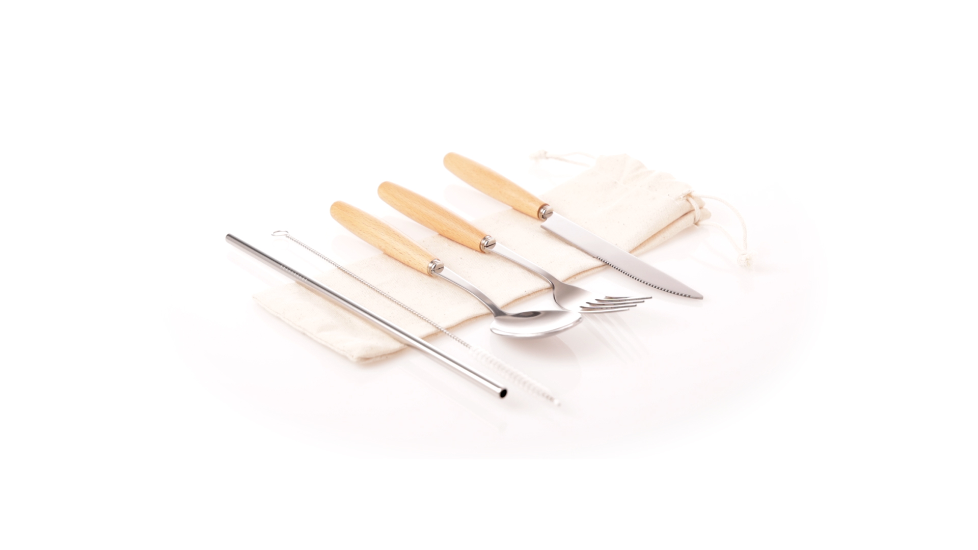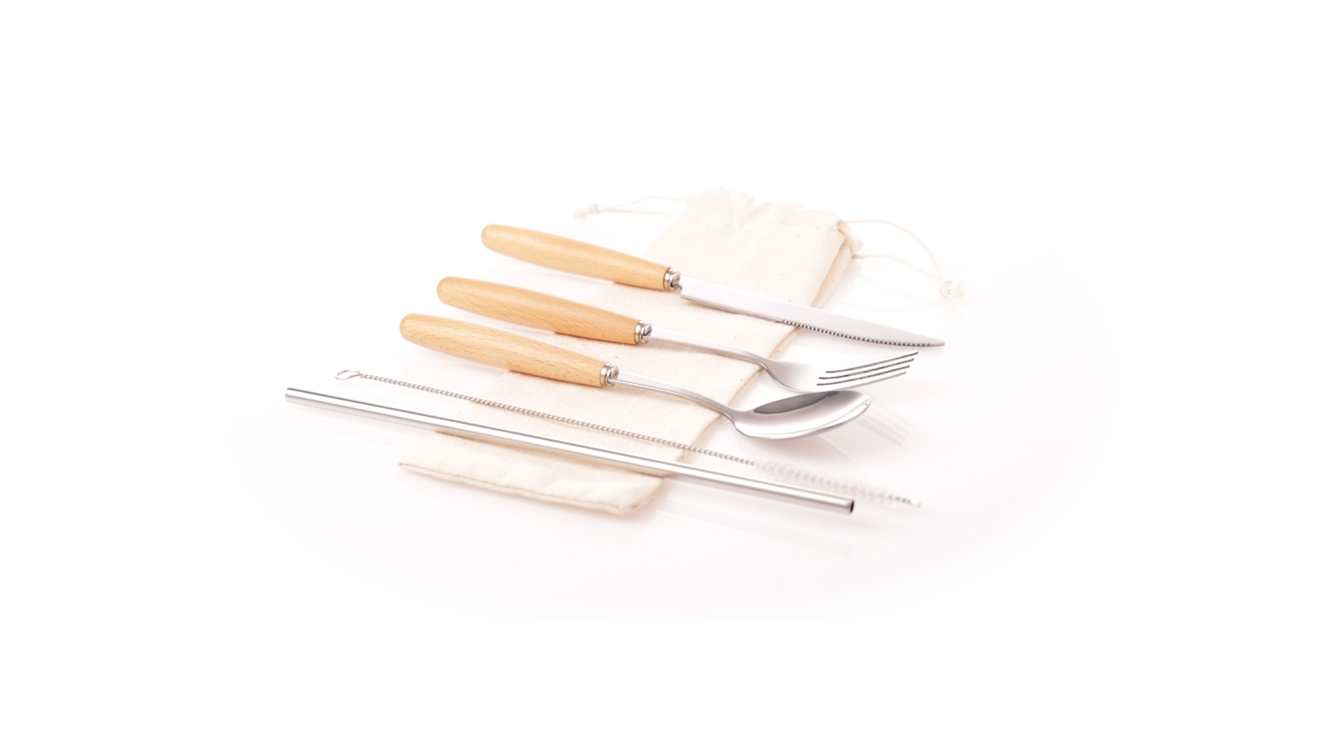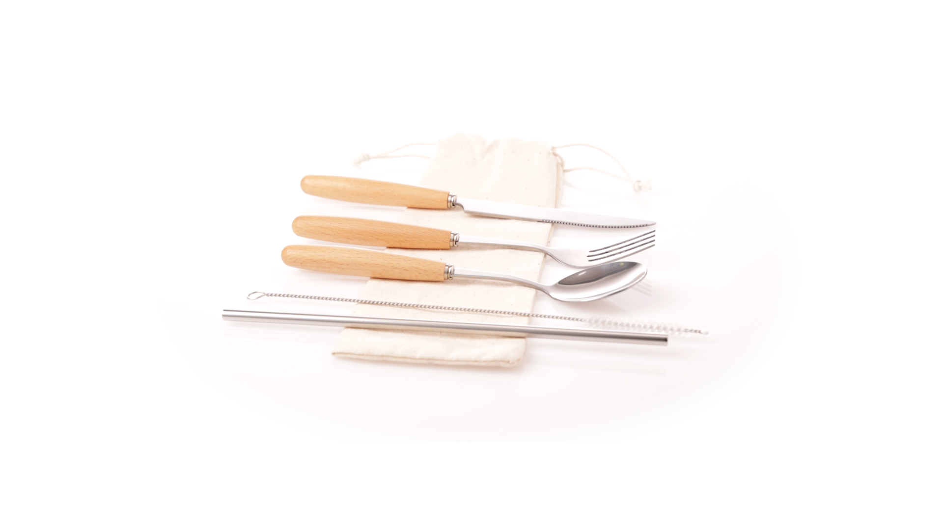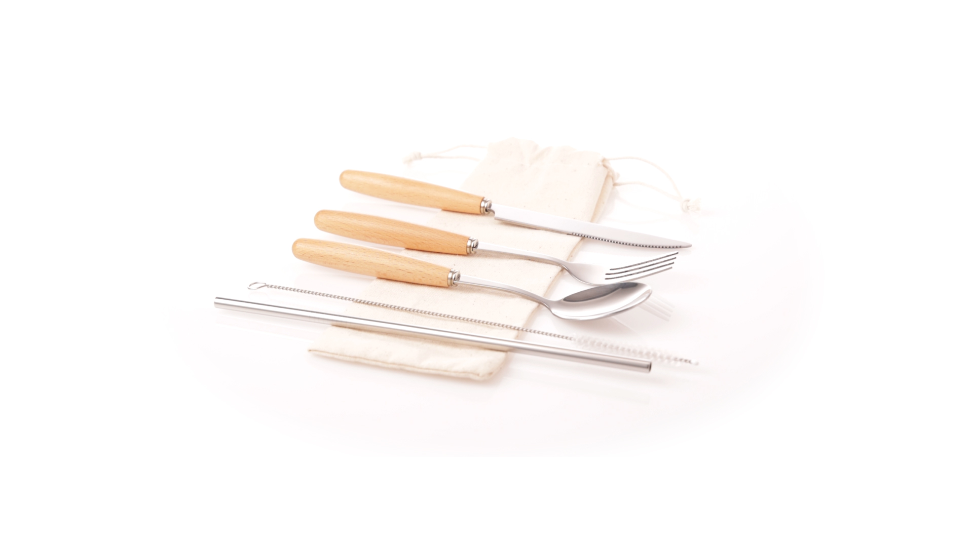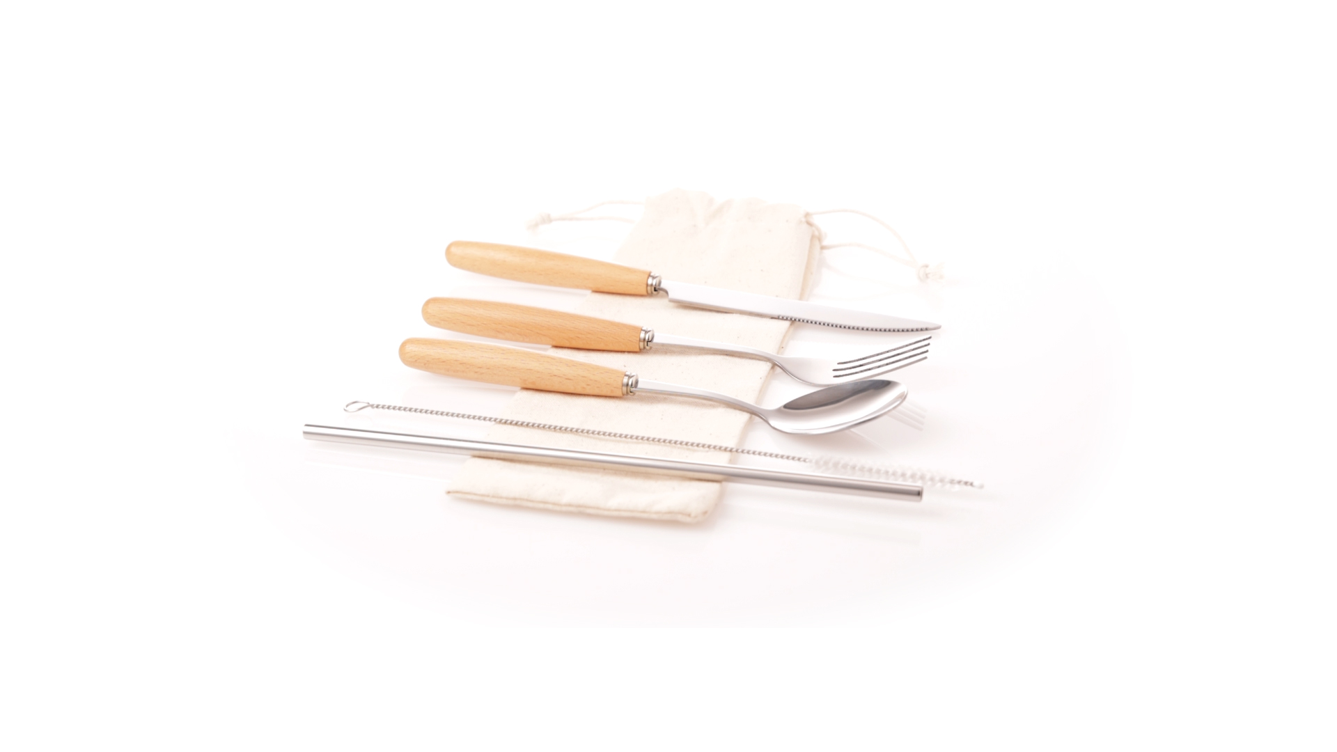 5-teiliges Besteckset aus rostfreiem Stahl, mit Naturholzgriff. Inklusive Löffel, Gabel, Messer, wiederverwendbarem Strohhalm und Reinigungsbürste für den Strohhalm. Präsentiert in einem Beutel aus natürlicher Baumwolle mit Kordelzugverschluss.