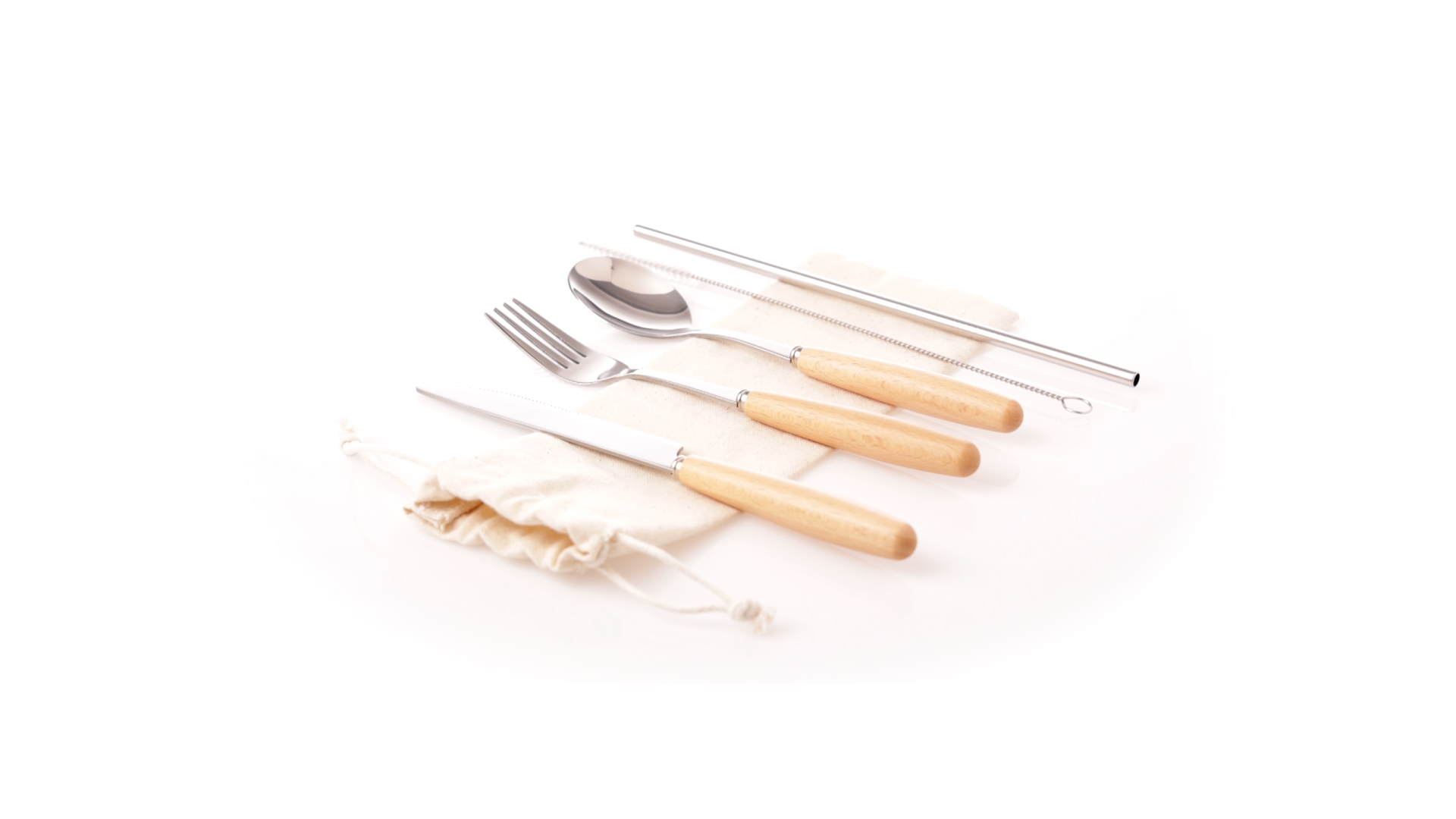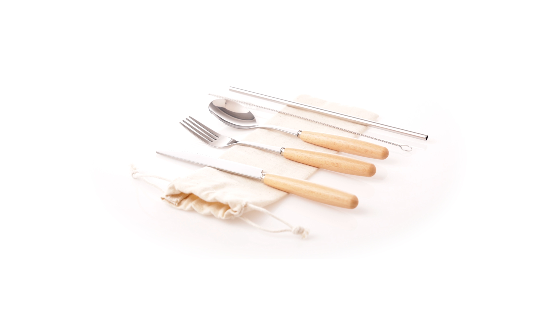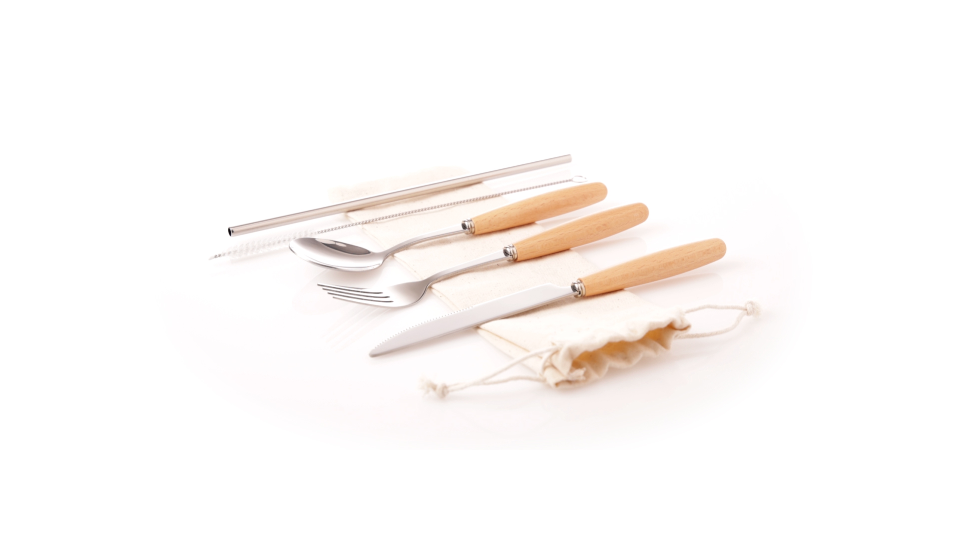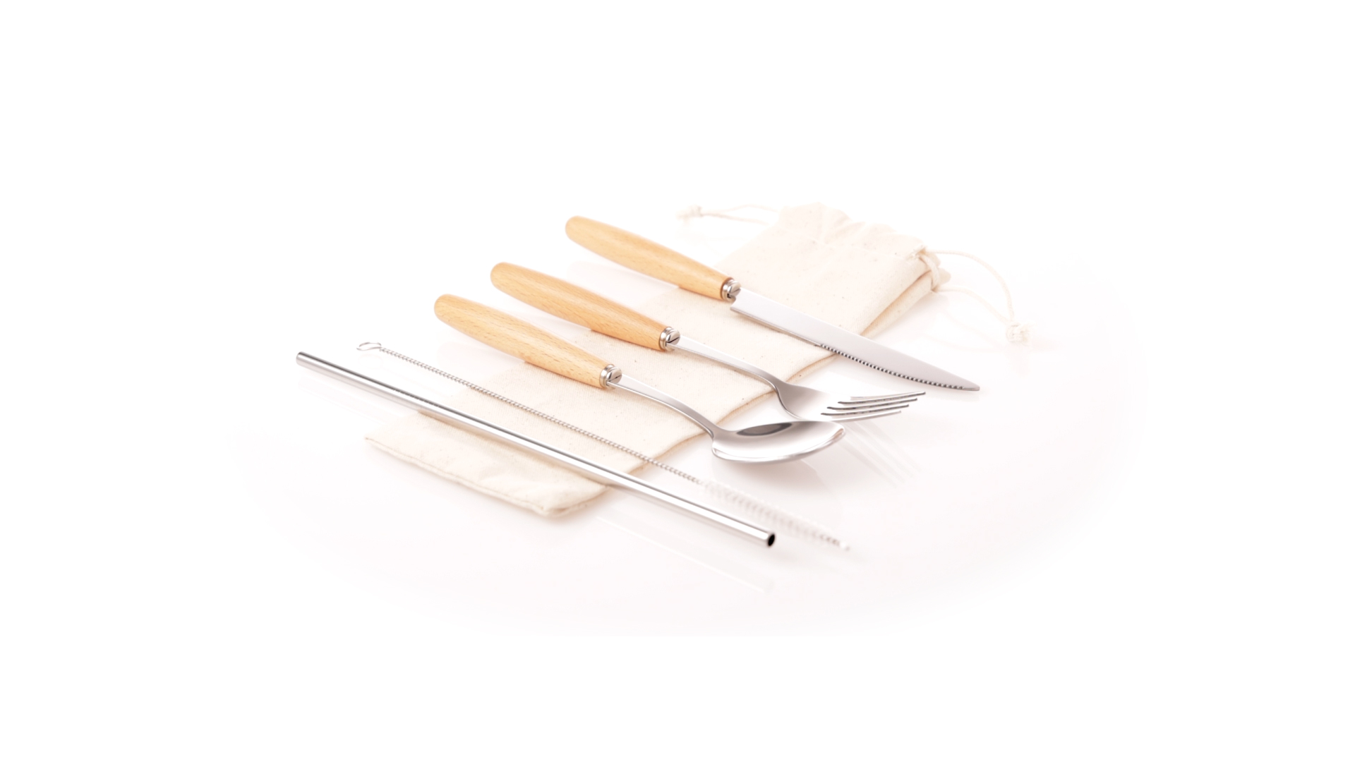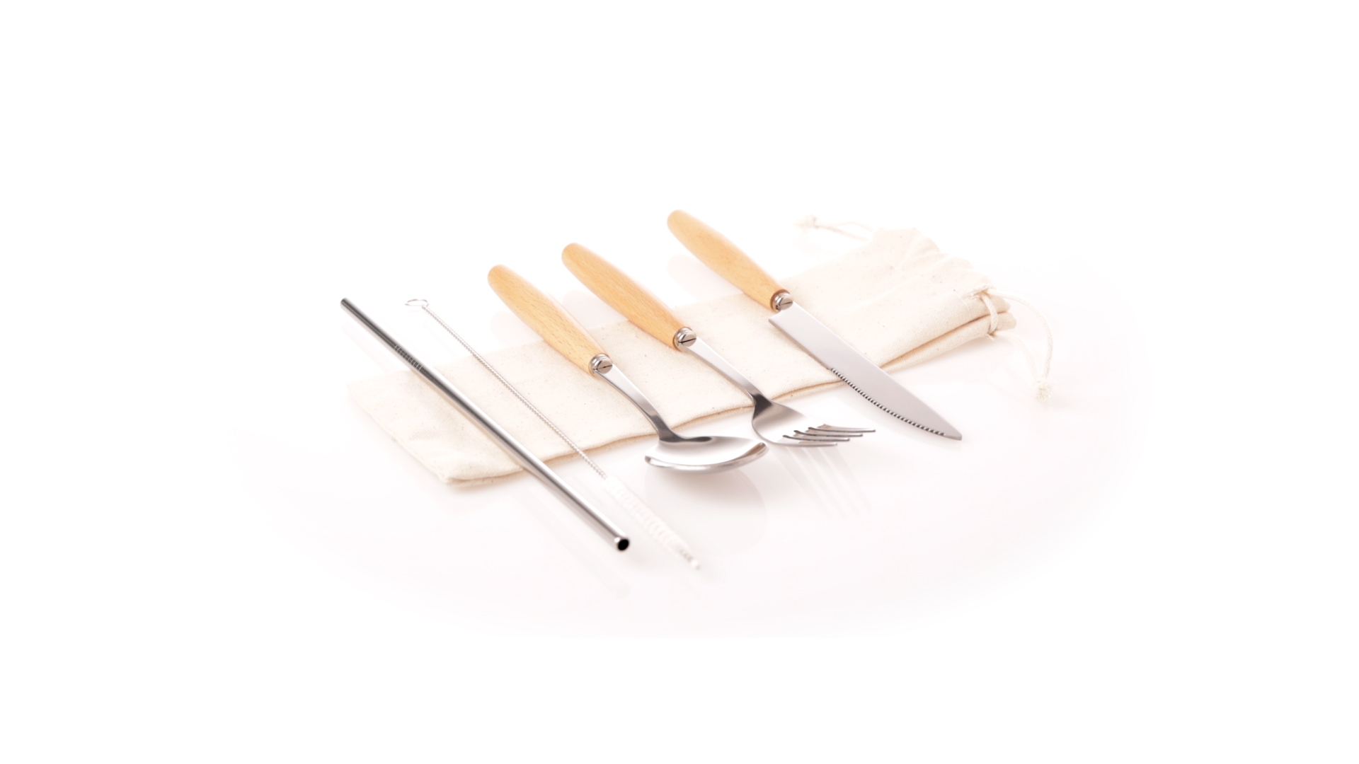 5-teiliges Besteckset aus rostfreiem Stahl, mit Naturholzgriff. Inklusive Löffel, Gabel, Messer, wiederverwendbarem Strohhalm und Reinigungsbürste für den Strohhalm. Präsentiert in einem Beutel aus natürlicher Baumwolle mit Kordelzugverschluss.