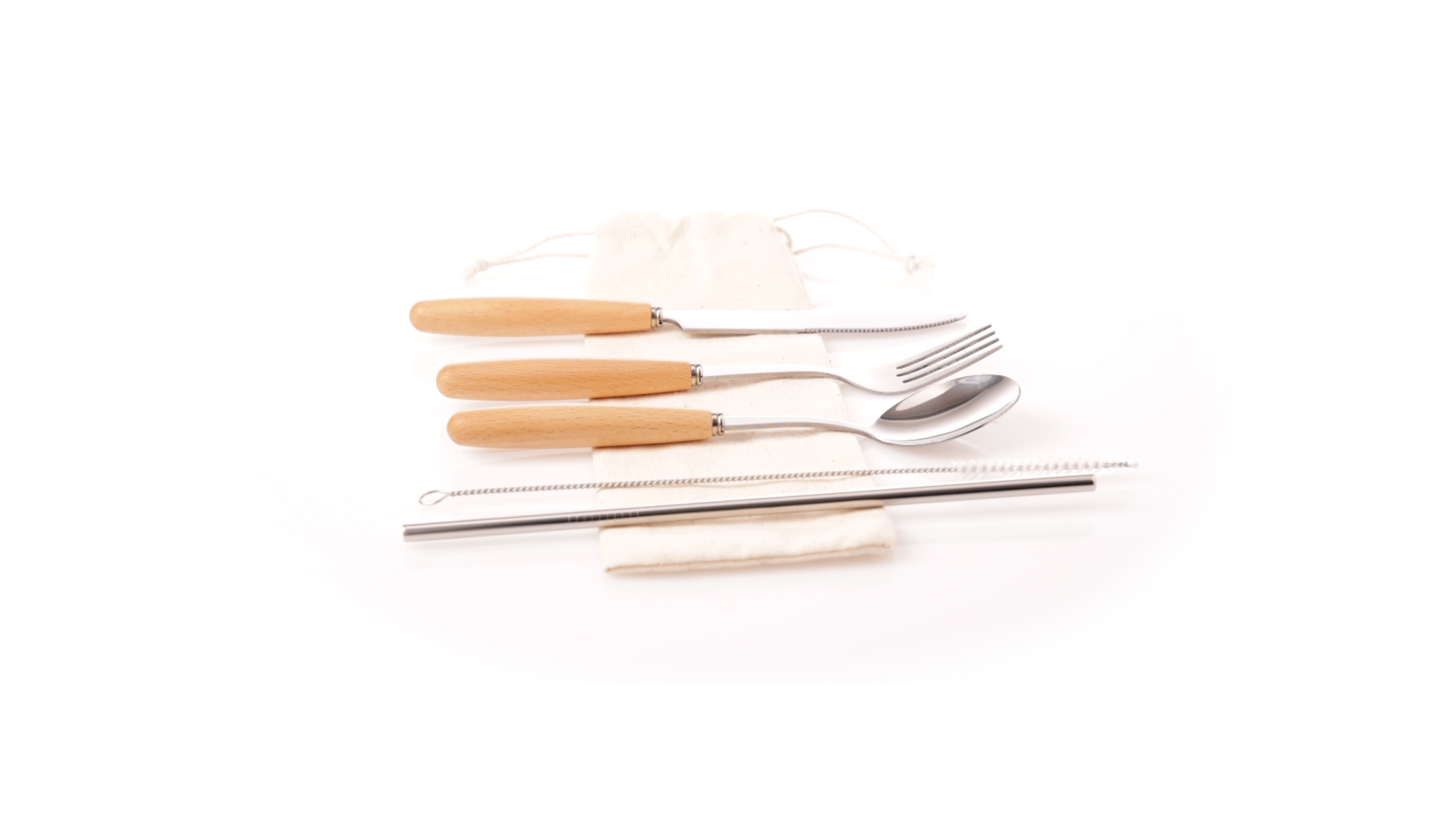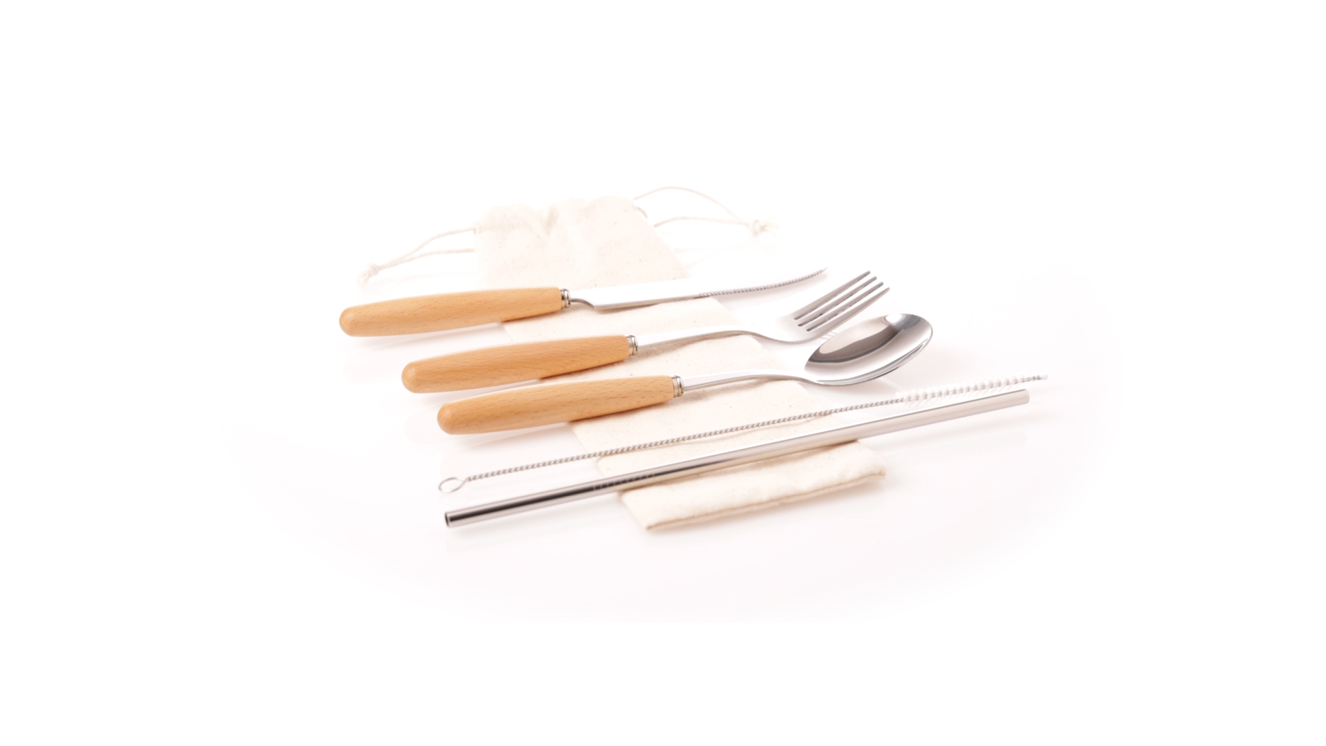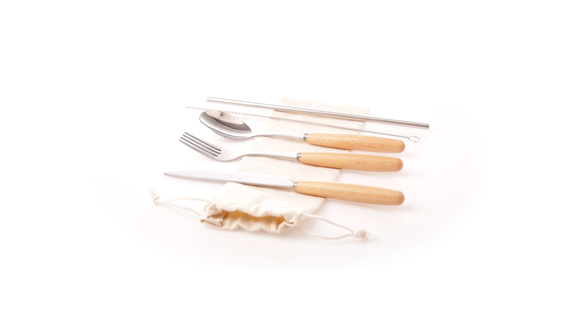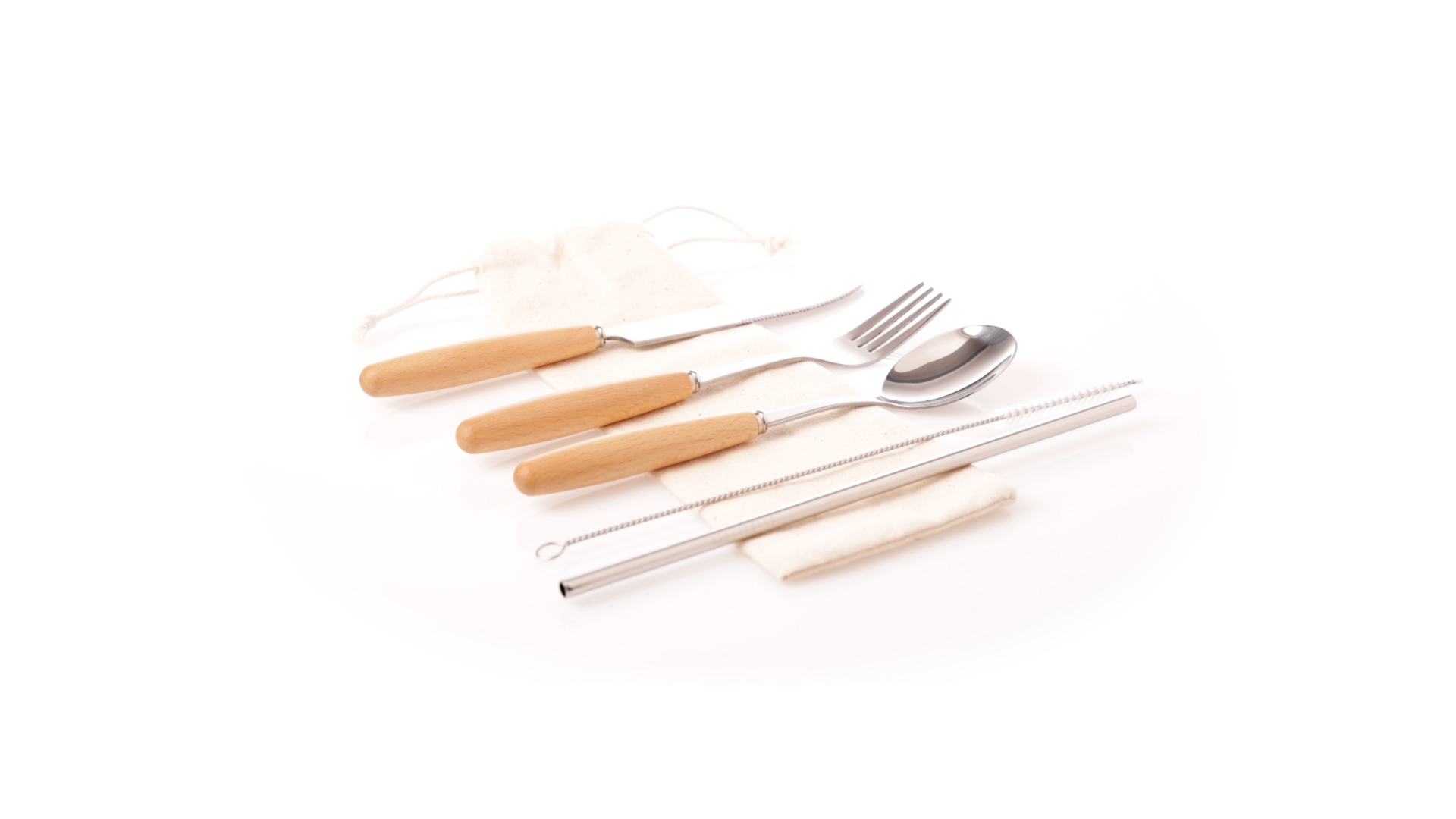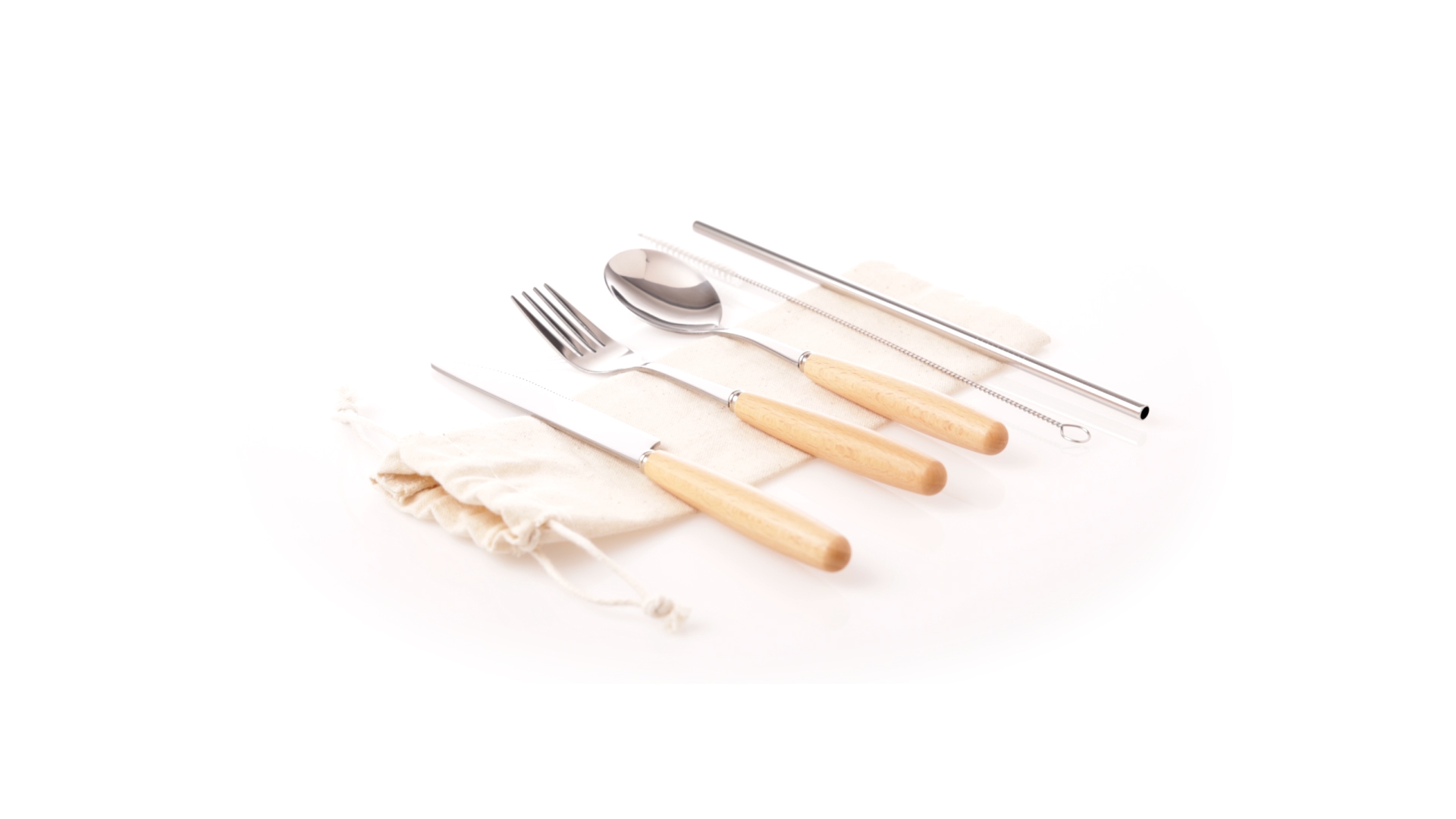5-teiliges Besteckset aus rostfreiem Stahl, mit Naturholzgriff. Inklusive Löffel, Gabel, Messer, wiederverwendbarem Strohhalm und Reinigungsbürste für den Strohhalm. Präsentiert in einem Beutel aus natürlicher Baumwolle mit Kordelzugverschluss.
