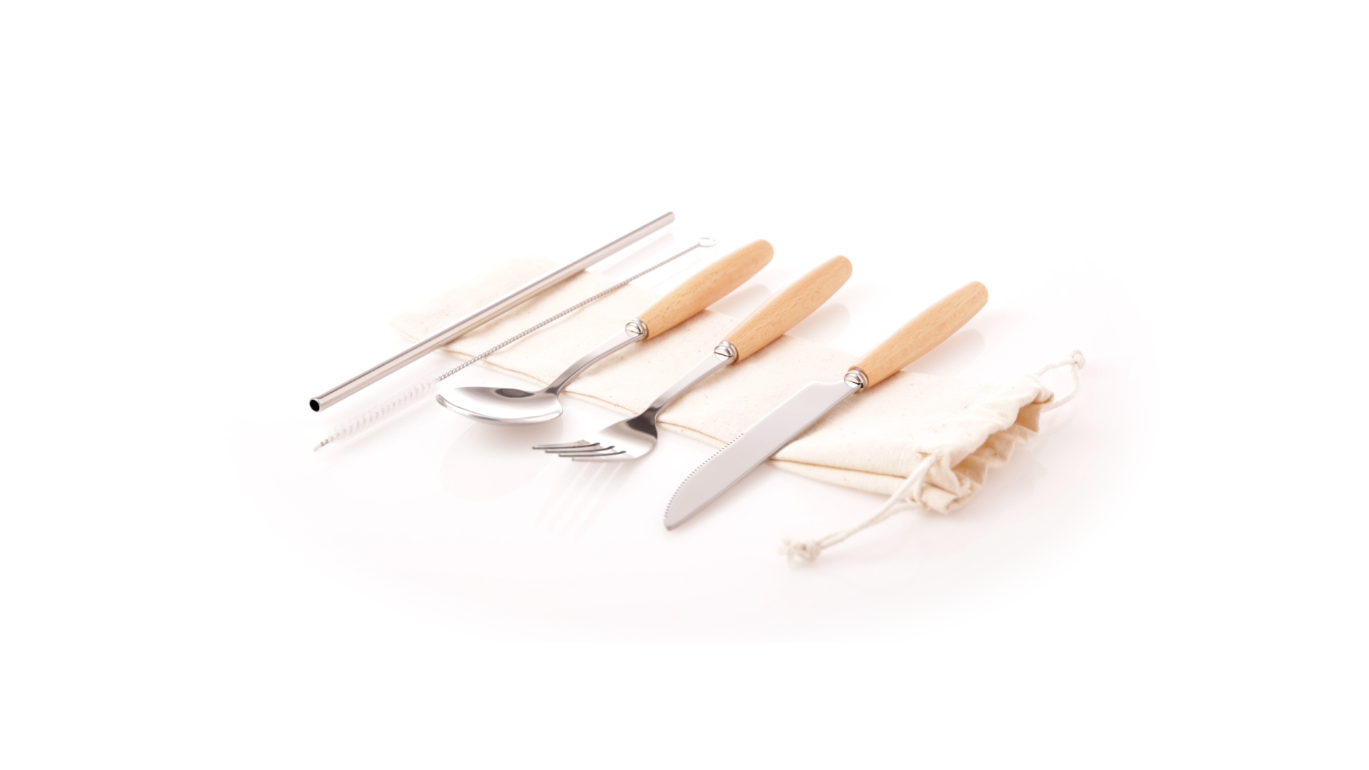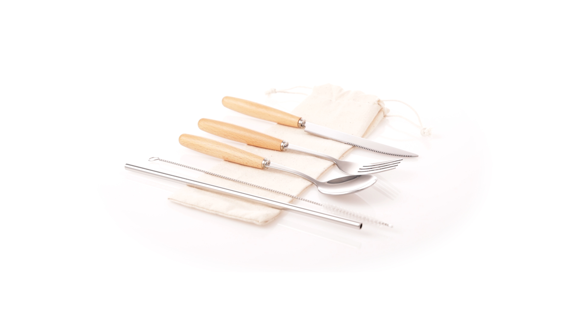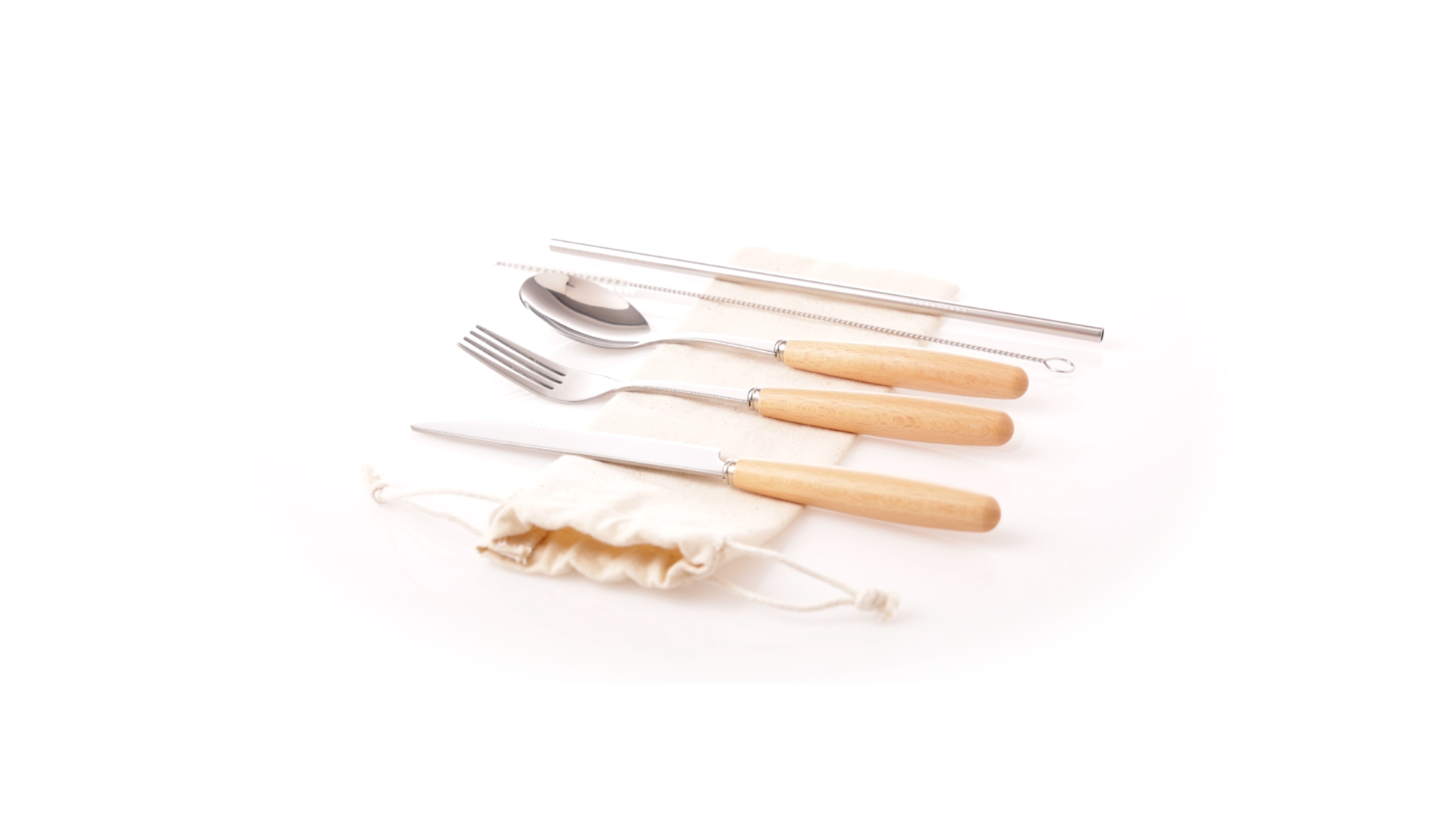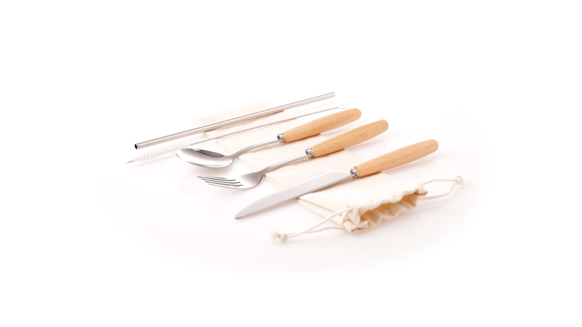 5-teiliges Besteckset aus rostfreiem Stahl, mit Naturholzgriff. Inklusive Löffel, Gabel, Messer, wiederverwendbarem Strohhalm und Reinigungsbürste für den Strohhalm. Präsentiert in einem Beutel aus natürlicher Baumwolle mit Kordelzugverschluss.
