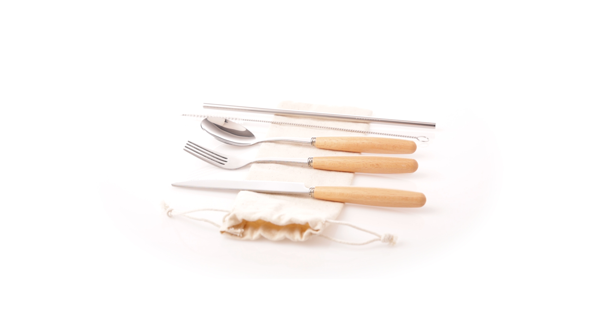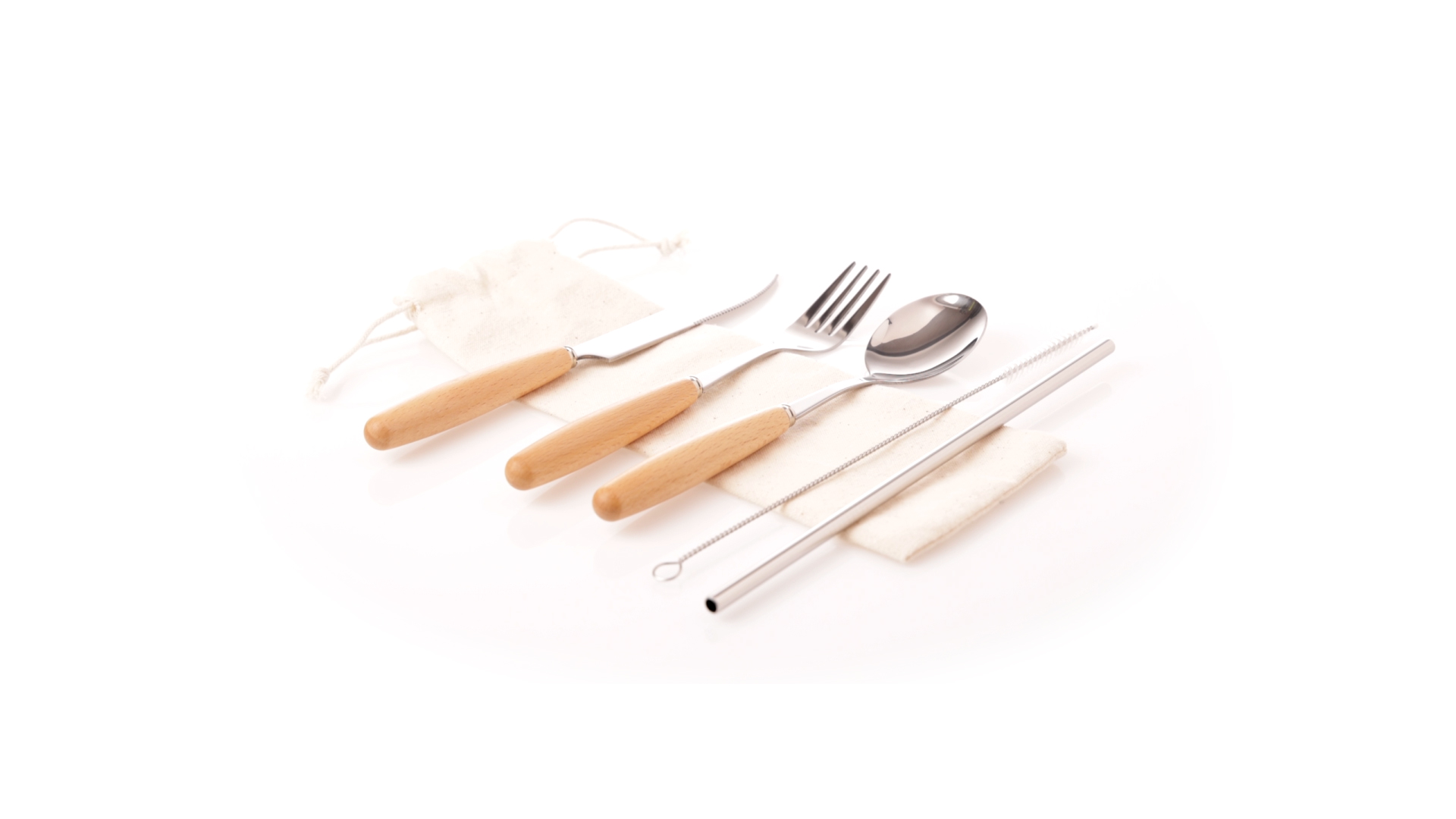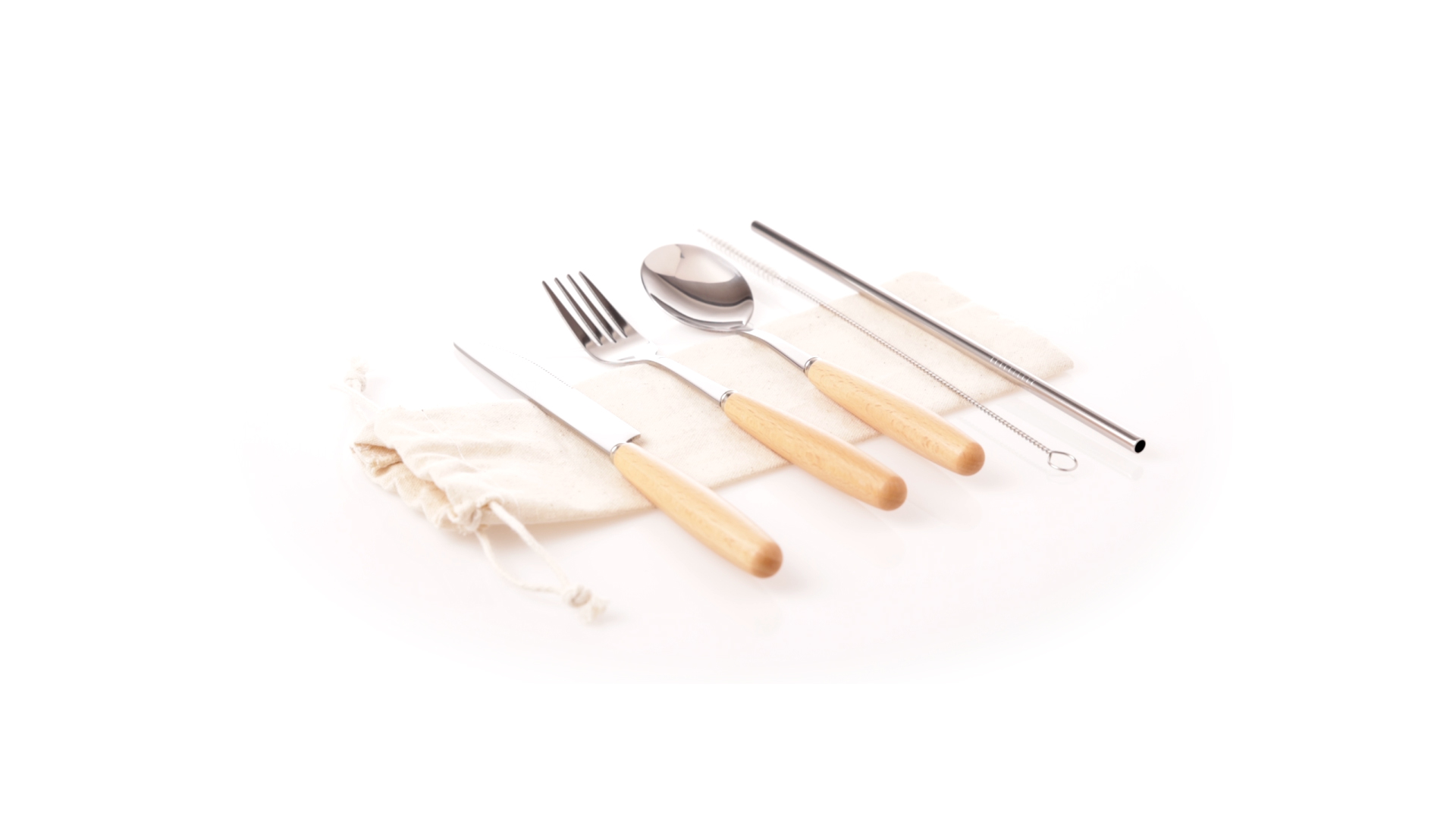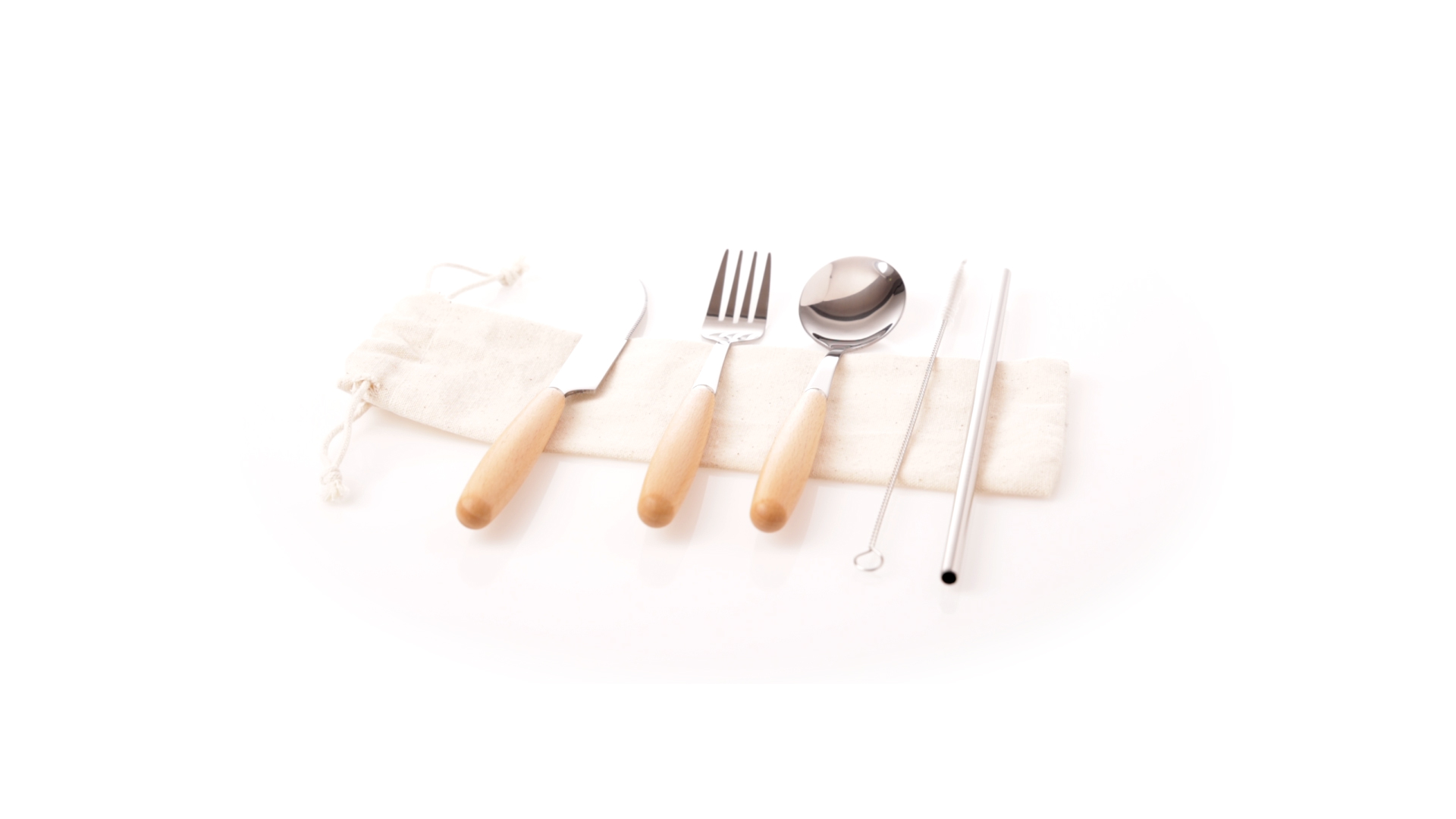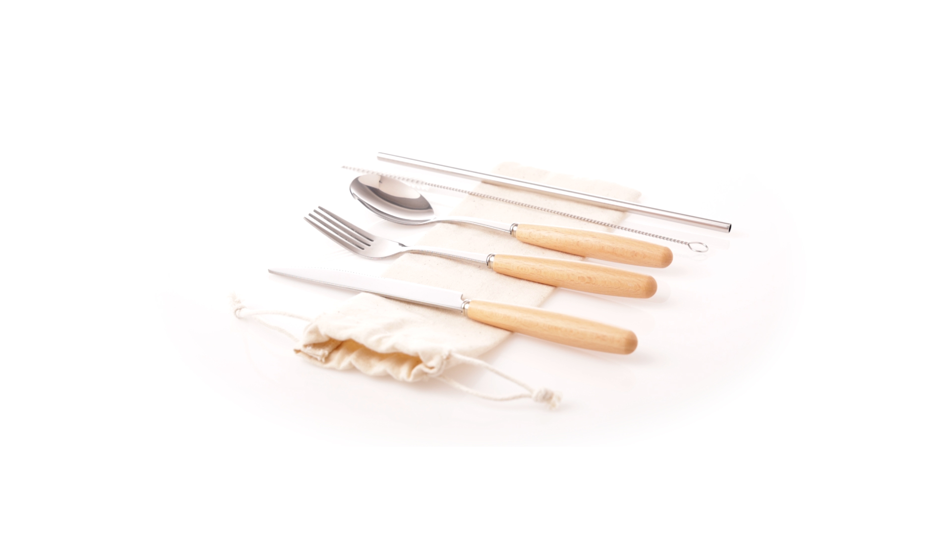 5-teiliges Besteckset aus rostfreiem Stahl, mit Naturholzgriff. Inklusive Löffel, Gabel, Messer, wiederverwendbarem Strohhalm und Reinigungsbürste für den Strohhalm. Präsentiert in einem Beutel aus natürlicher Baumwolle mit Kordelzugverschluss.