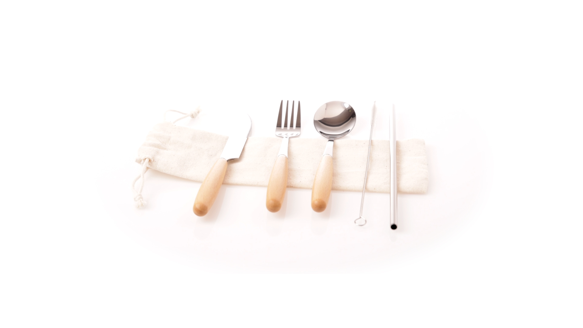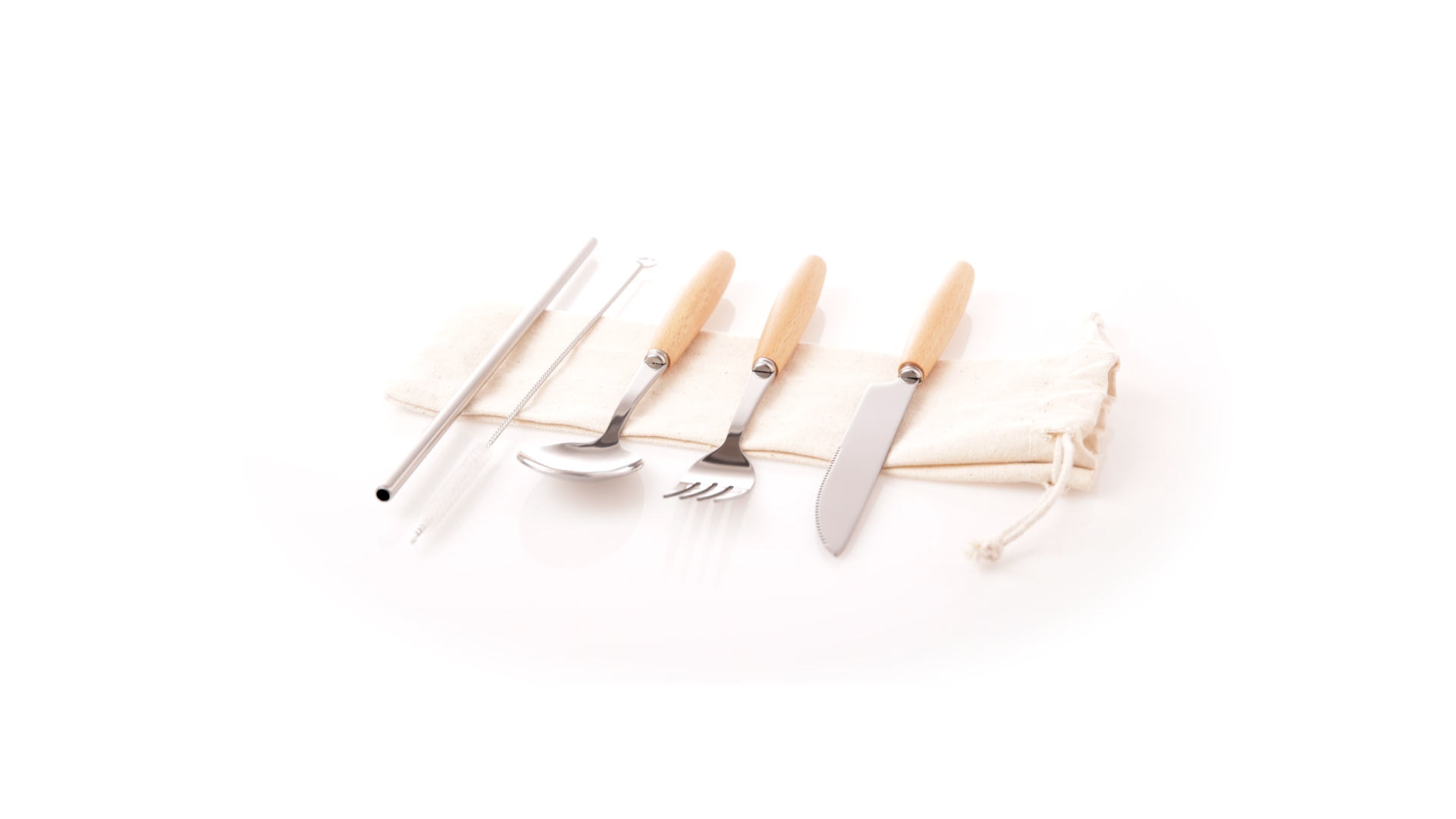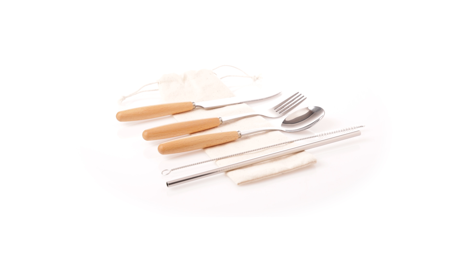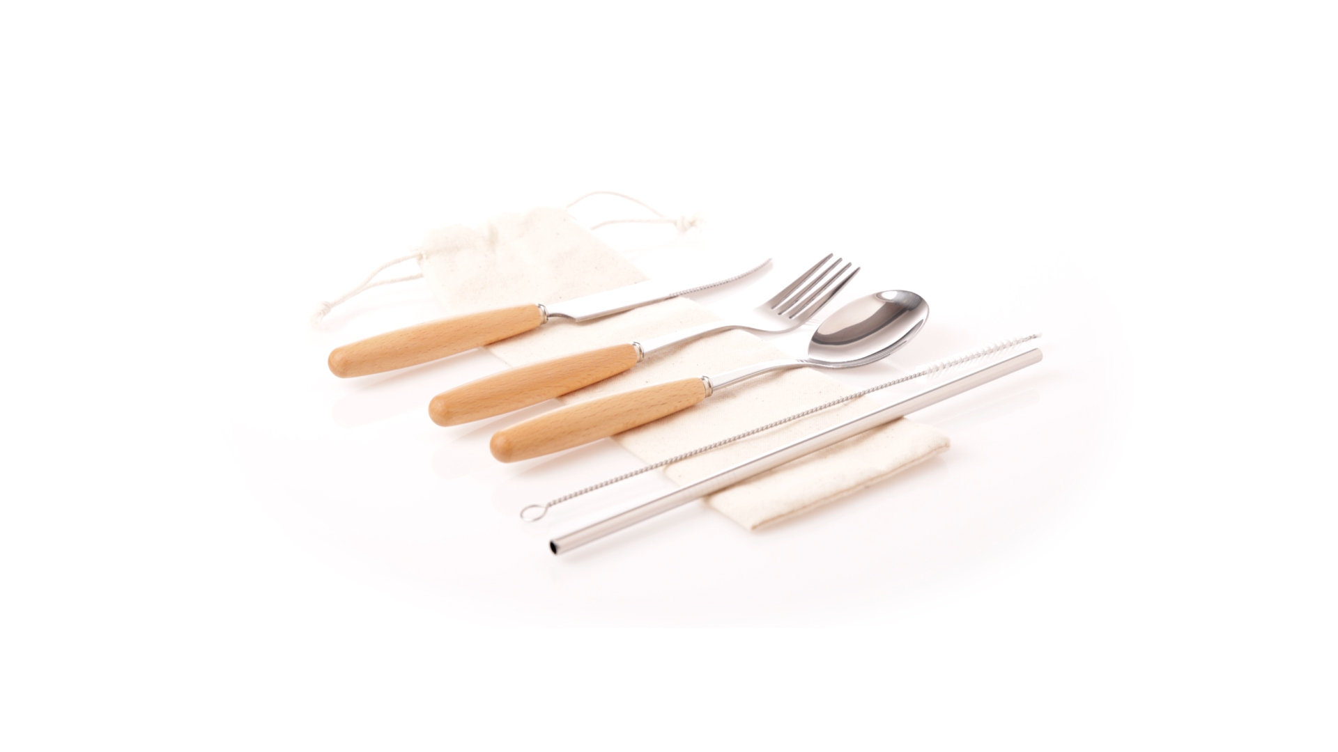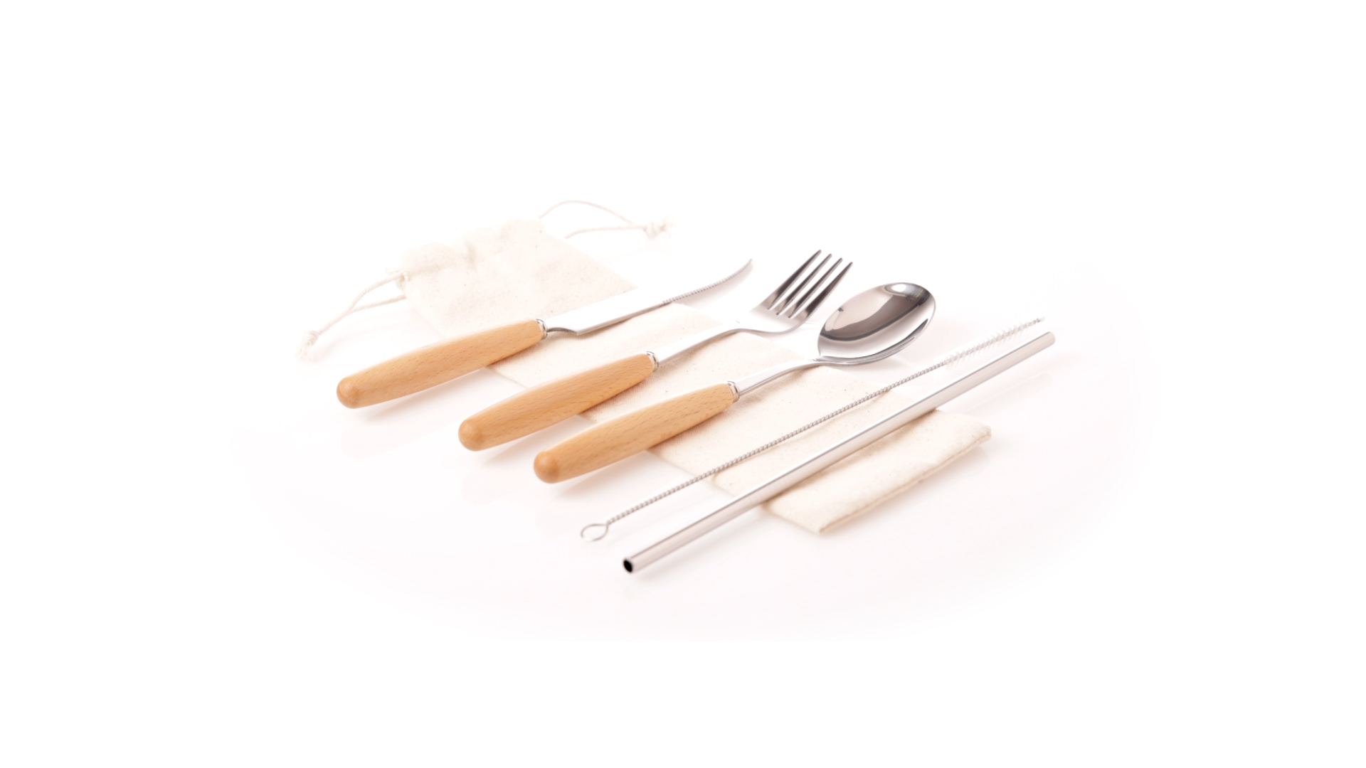 5-teiliges Besteckset aus rostfreiem Stahl, mit Naturholzgriff. Inklusive Löffel, Gabel, Messer, wiederverwendbarem Strohhalm und Reinigungsbürste für den Strohhalm. Präsentiert in einem Beutel aus natürlicher Baumwolle mit Kordelzugverschluss.