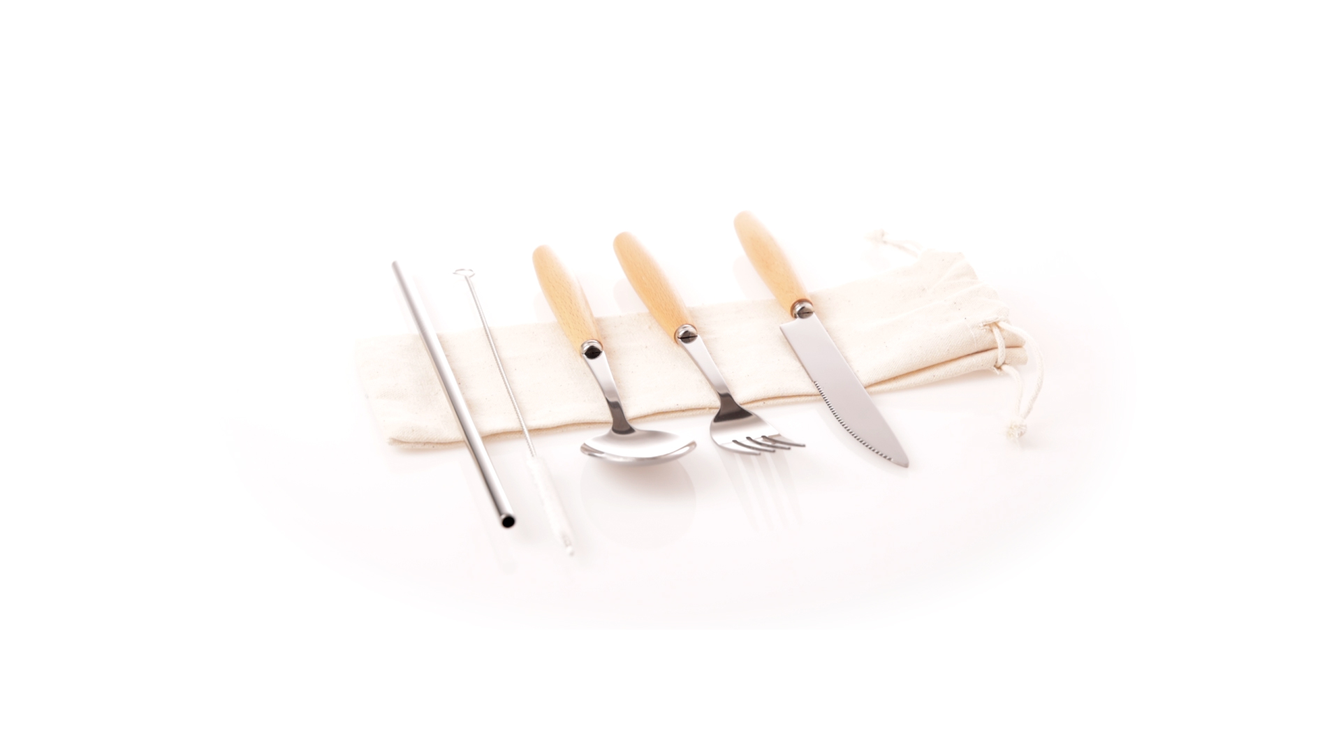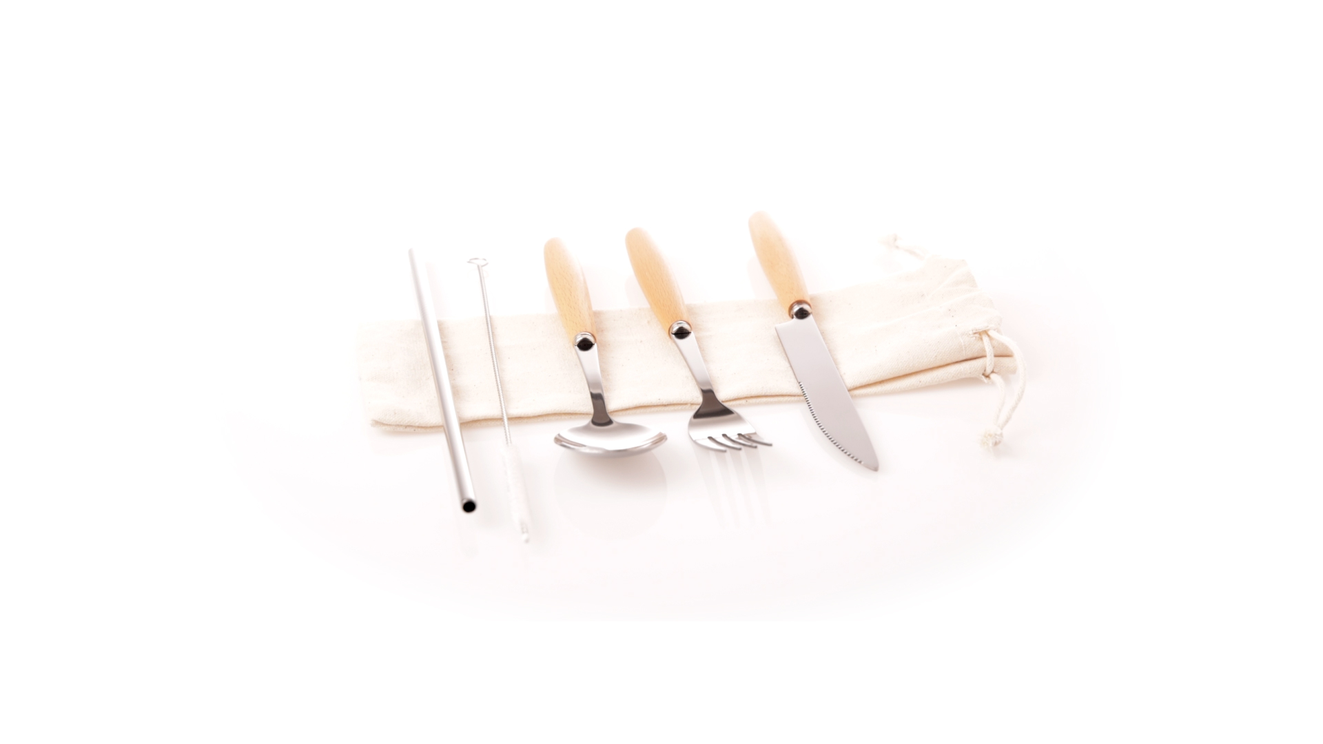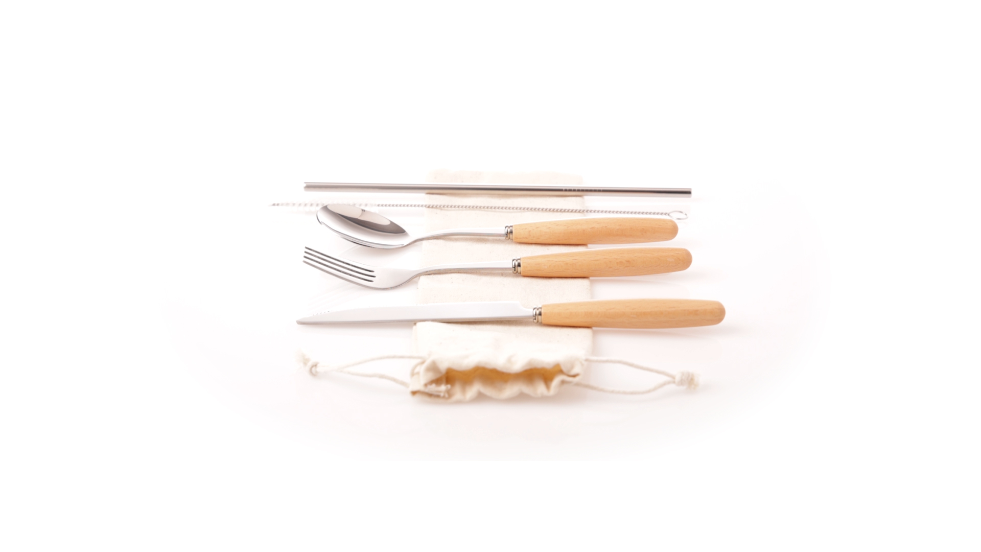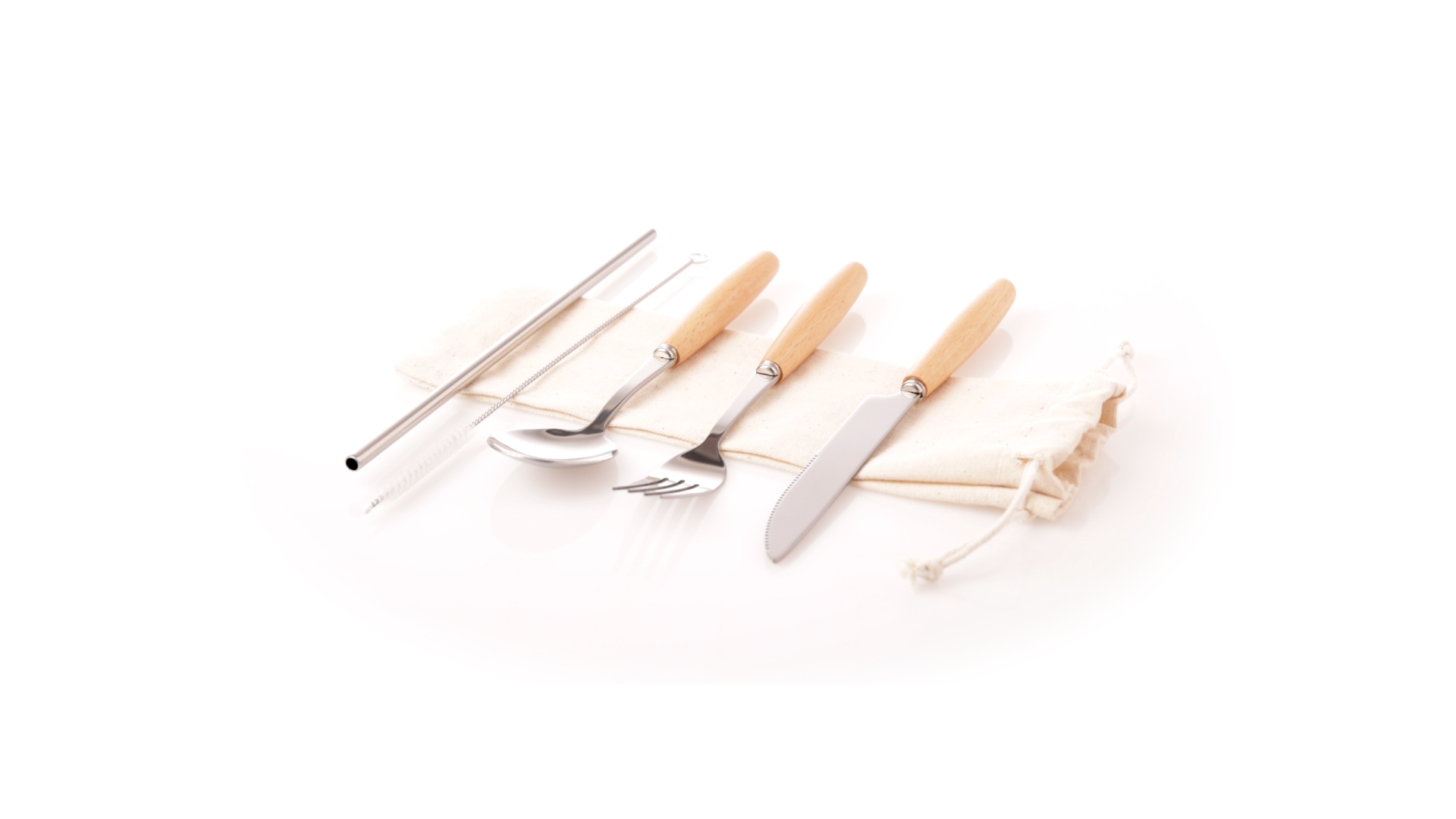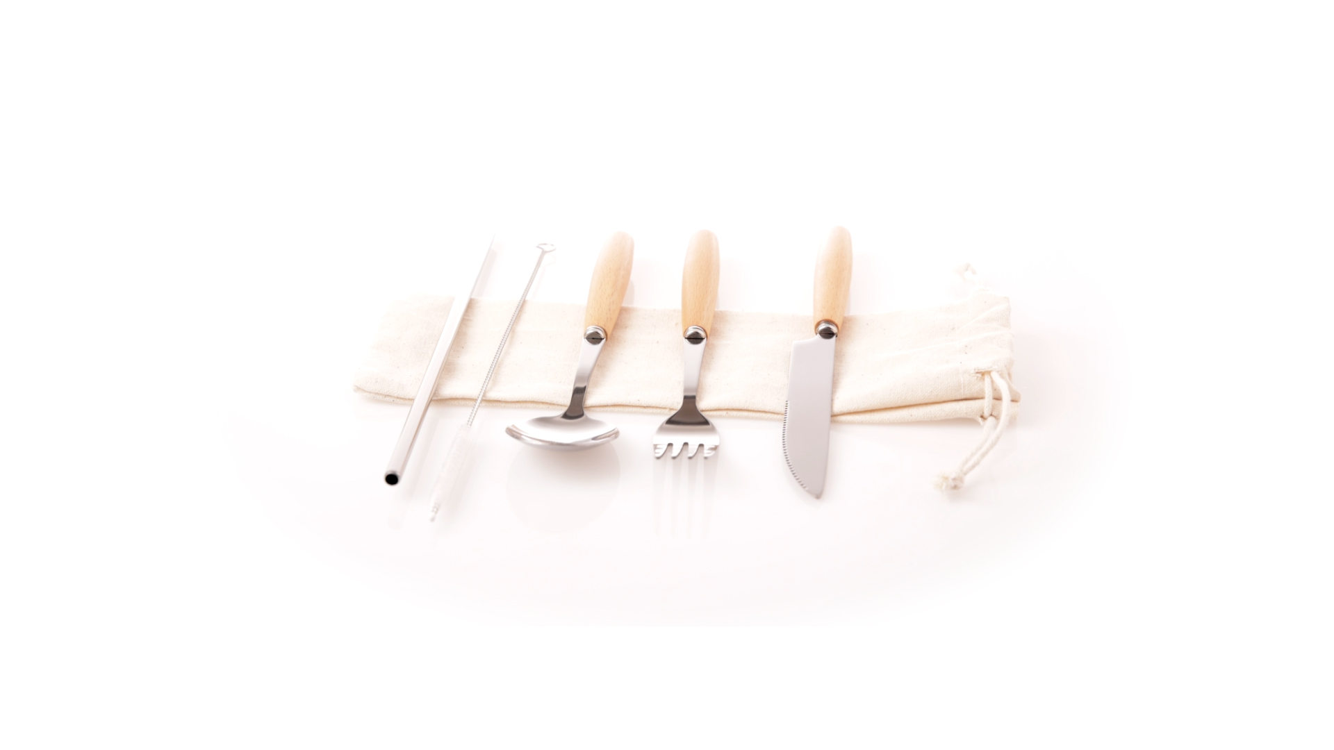 5-teiliges Besteckset aus rostfreiem Stahl, mit Naturholzgriff. Inklusive Löffel, Gabel, Messer, wiederverwendbarem Strohhalm und Reinigungsbürste für den Strohhalm. Präsentiert in einem Beutel aus natürlicher Baumwolle mit Kordelzugverschluss.