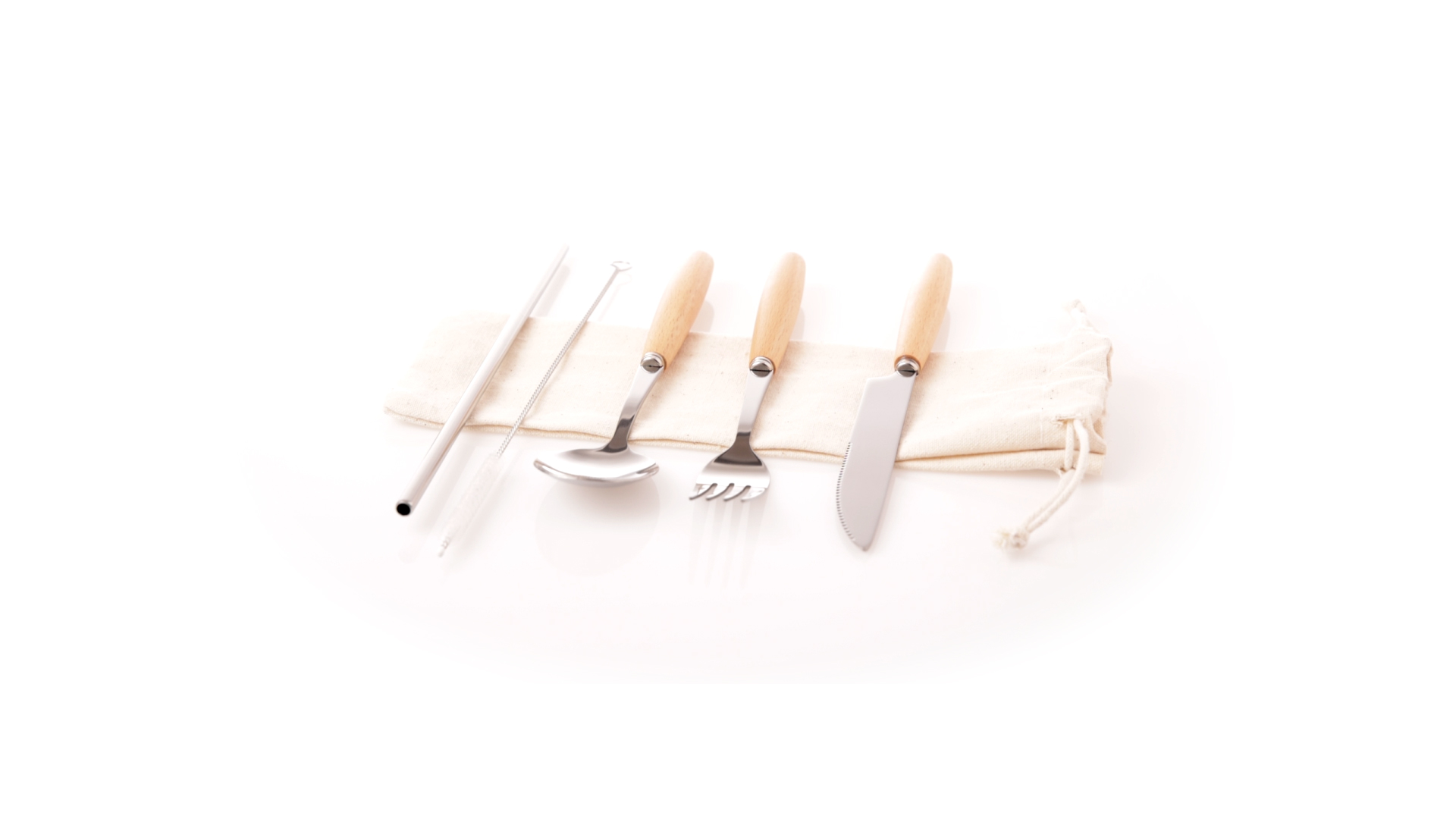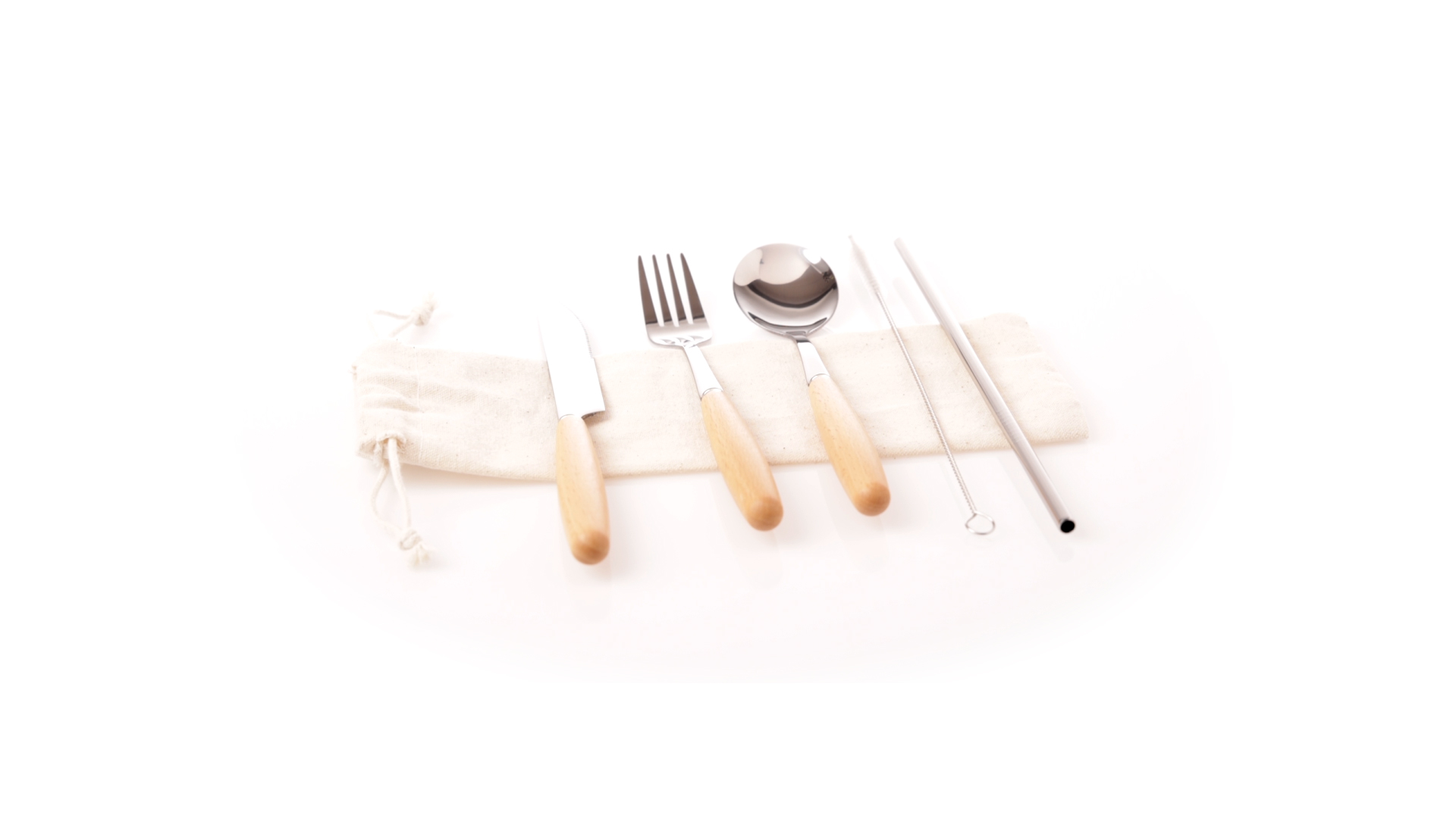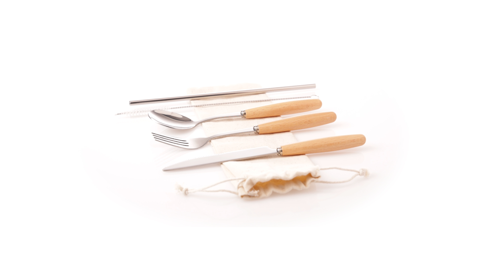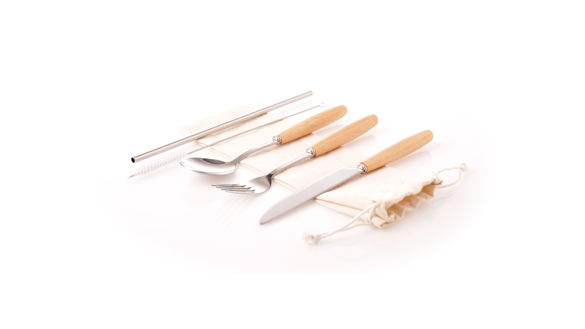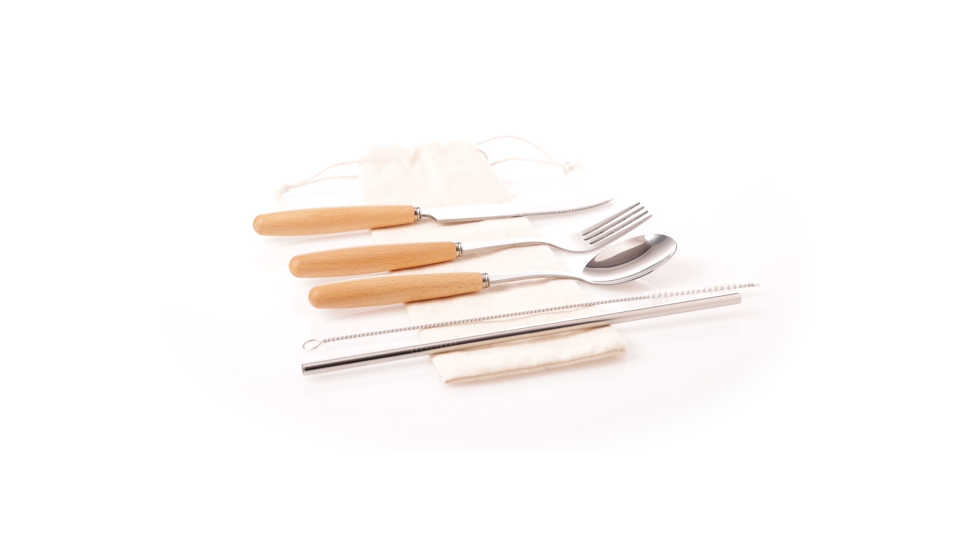 5-teiliges Besteckset aus rostfreiem Stahl, mit Naturholzgriff. Inklusive Löffel, Gabel, Messer, wiederverwendbarem Strohhalm und Reinigungsbürste für den Strohhalm. Präsentiert in einem Beutel aus natürlicher Baumwolle mit Kordelzugverschluss.