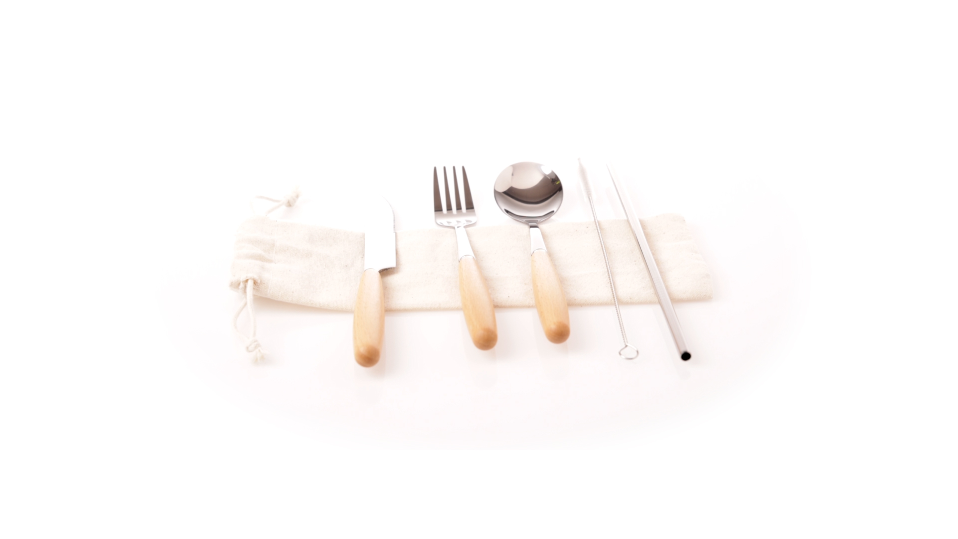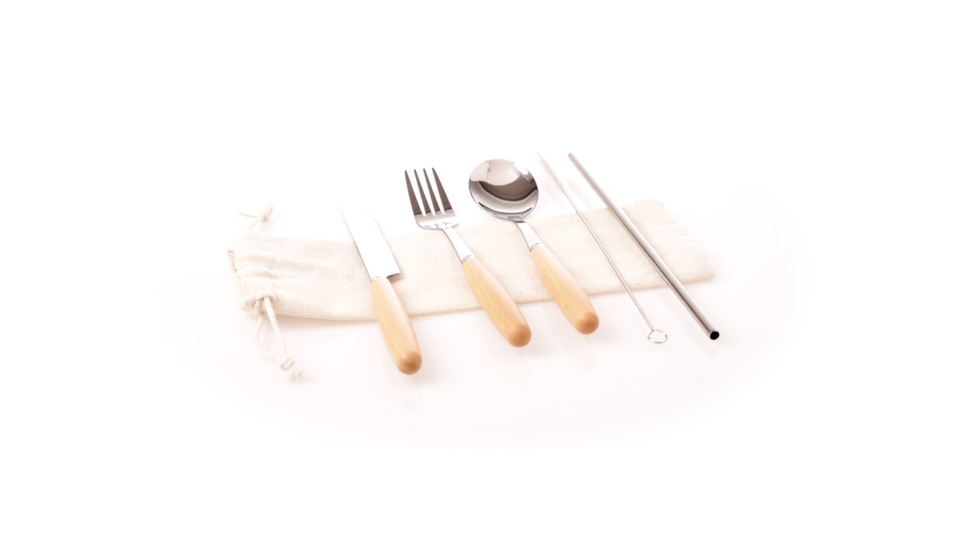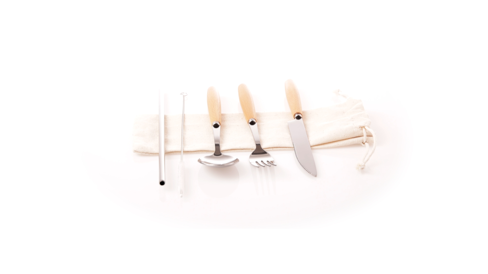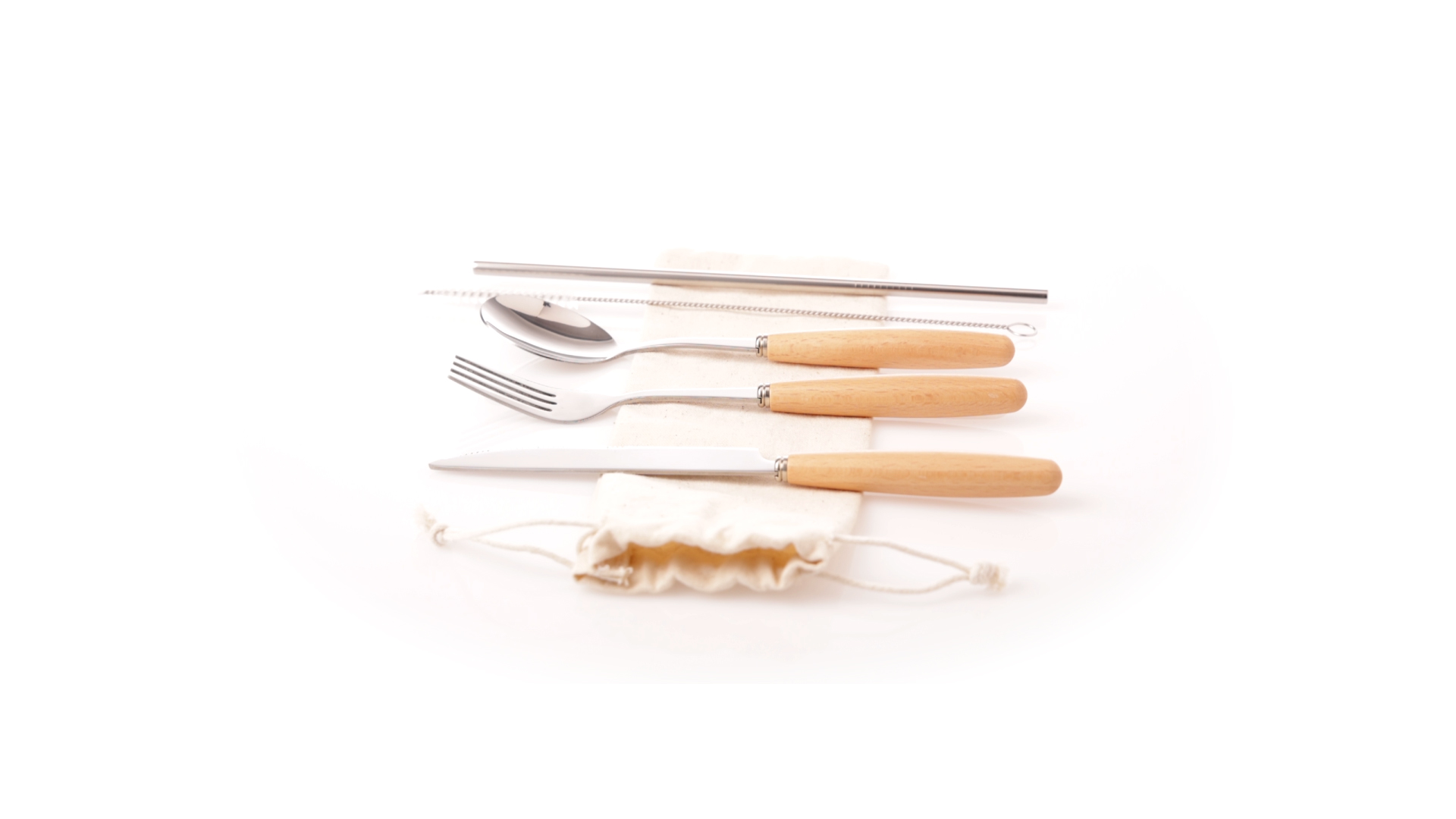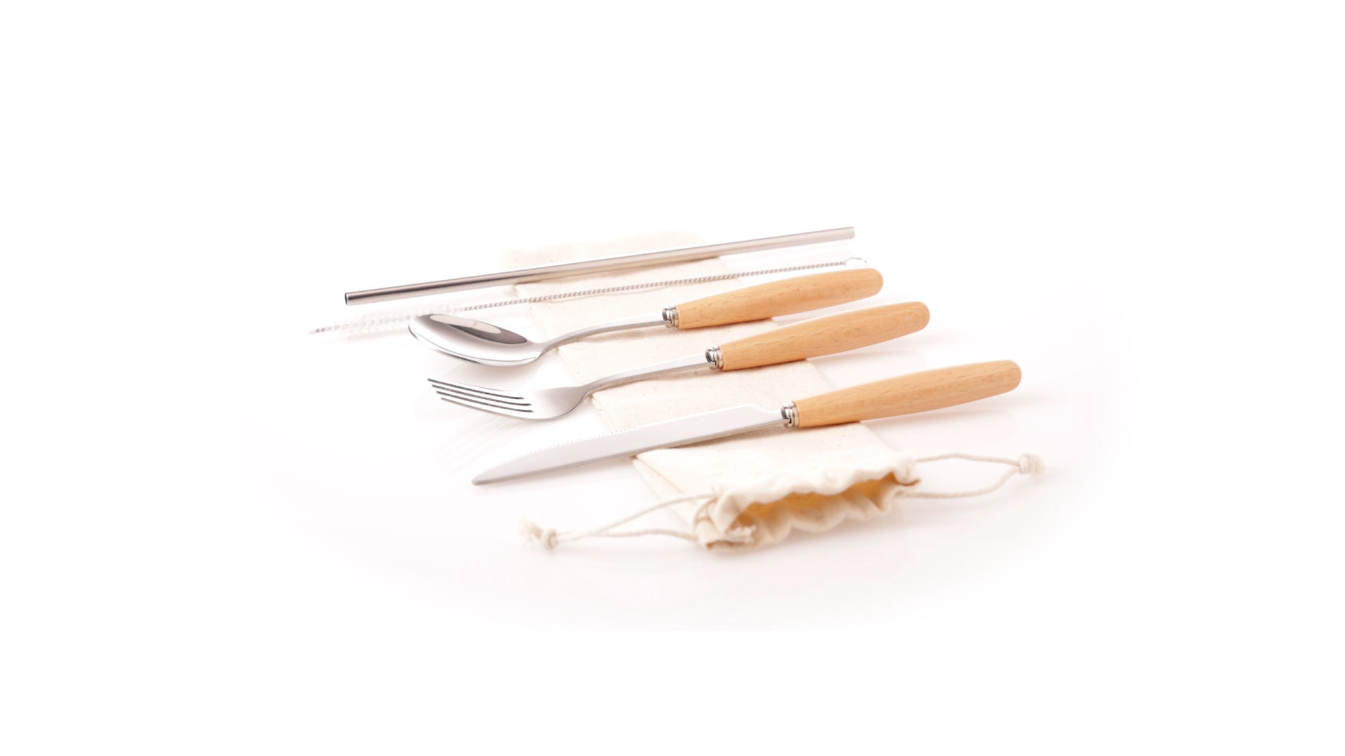 5-teiliges Besteckset aus rostfreiem Stahl, mit Naturholzgriff. Inklusive Löffel, Gabel, Messer, wiederverwendbarem Strohhalm und Reinigungsbürste für den Strohhalm. Präsentiert in einem Beutel aus natürlicher Baumwolle mit Kordelzugverschluss.
