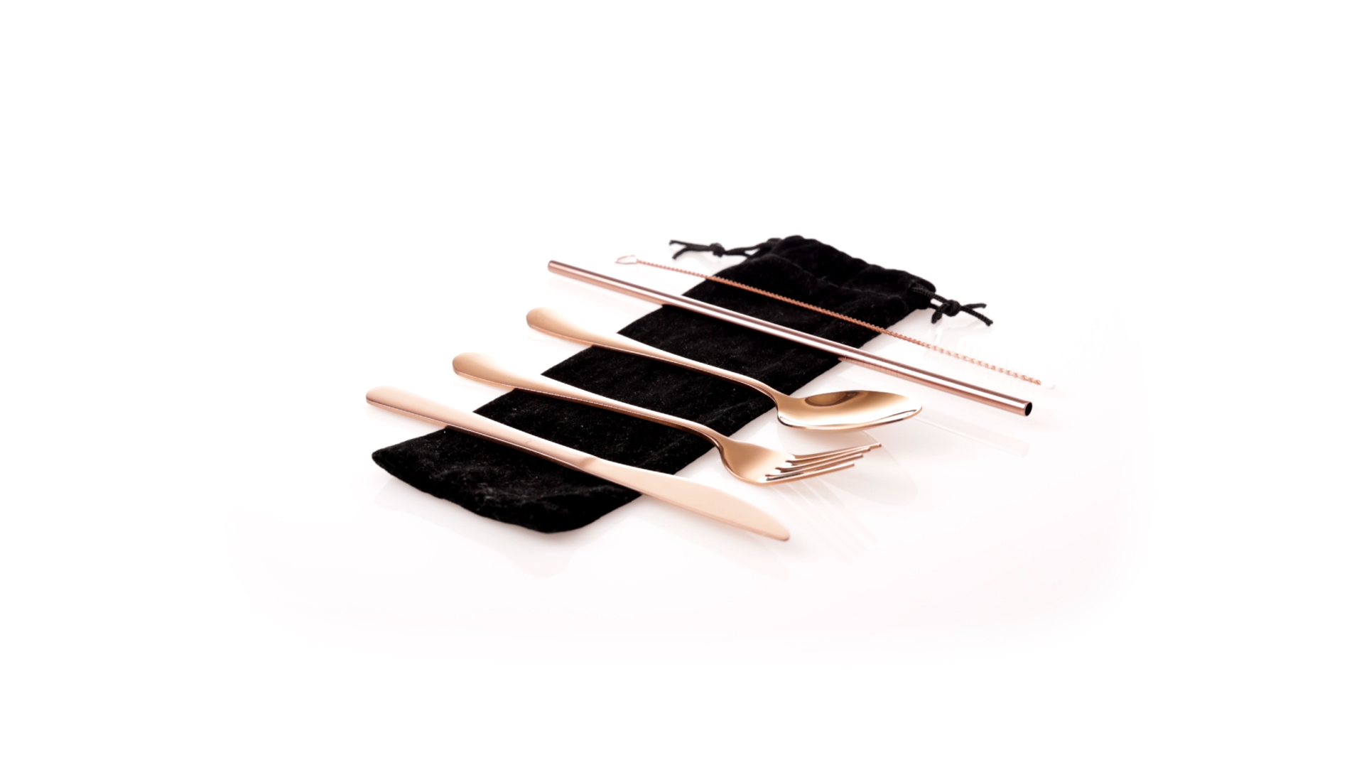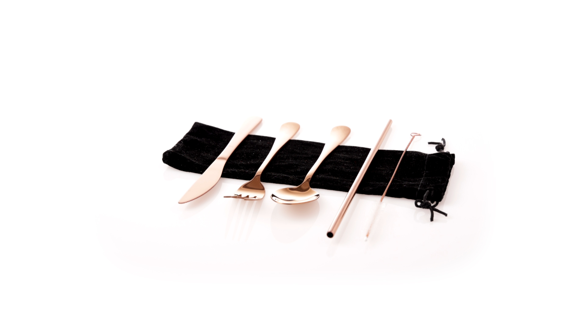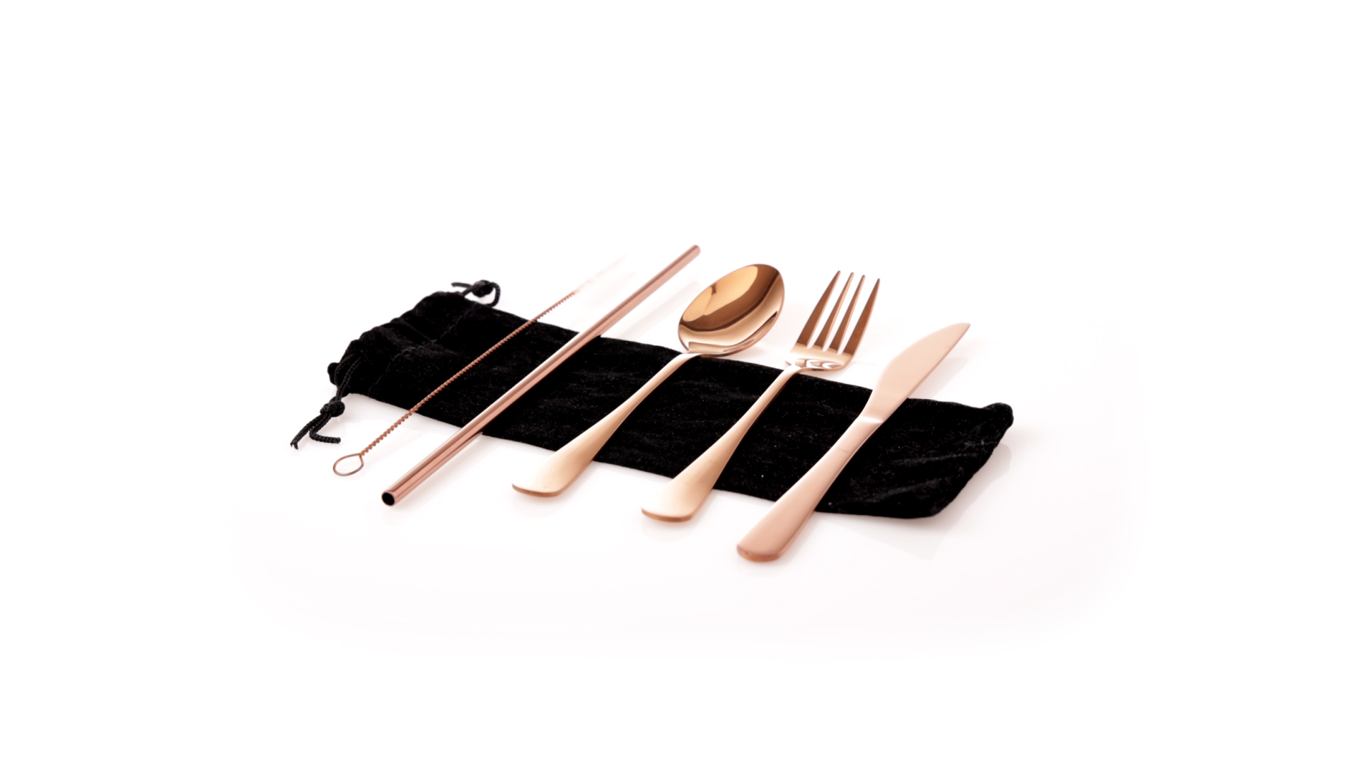 5-teiliges Besteckset aus rostfreiem Stahl mit galvanisierter Kupferbeschichtung. Inklusive Löffel, Gabel, Messer, wiederverwendbarem Strohhalm und Reinigungsbürste für den Strohhalm. Präsentiert in einem schwarzen Wildlederbeutel mit Kordelzugverschluss.