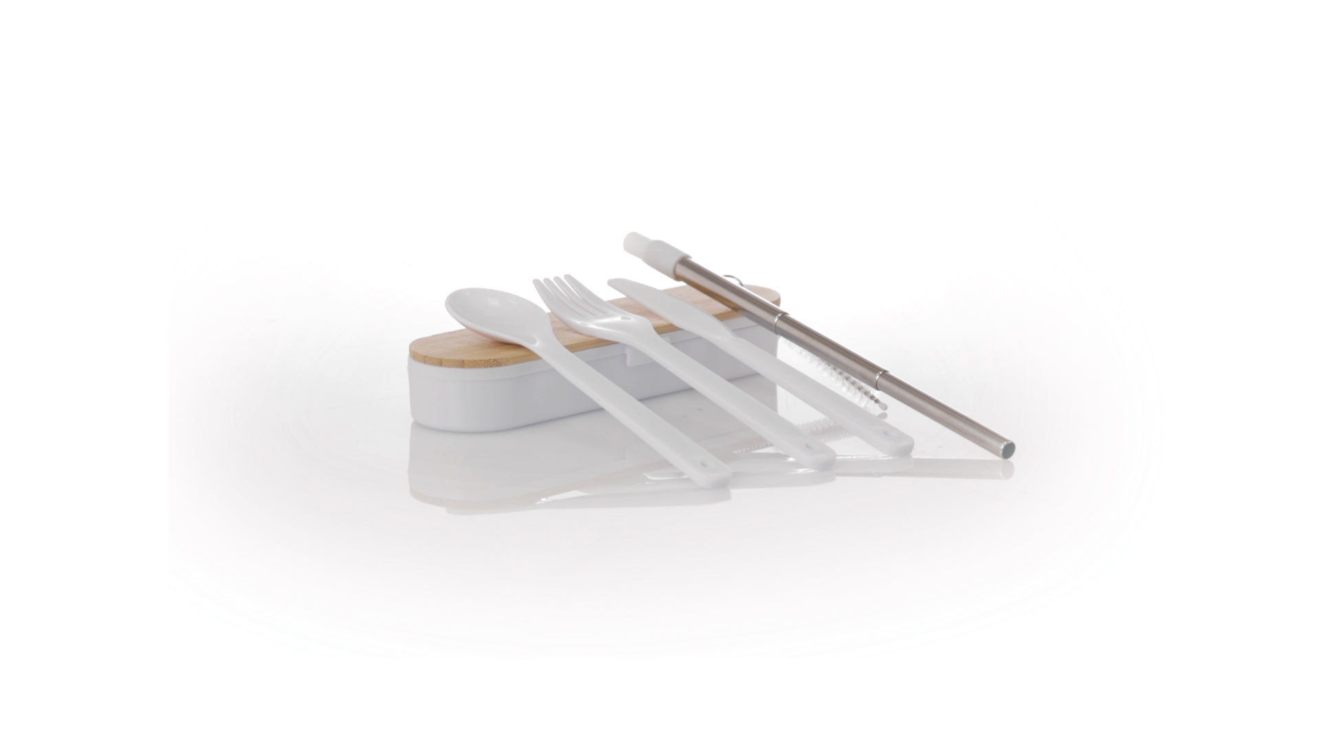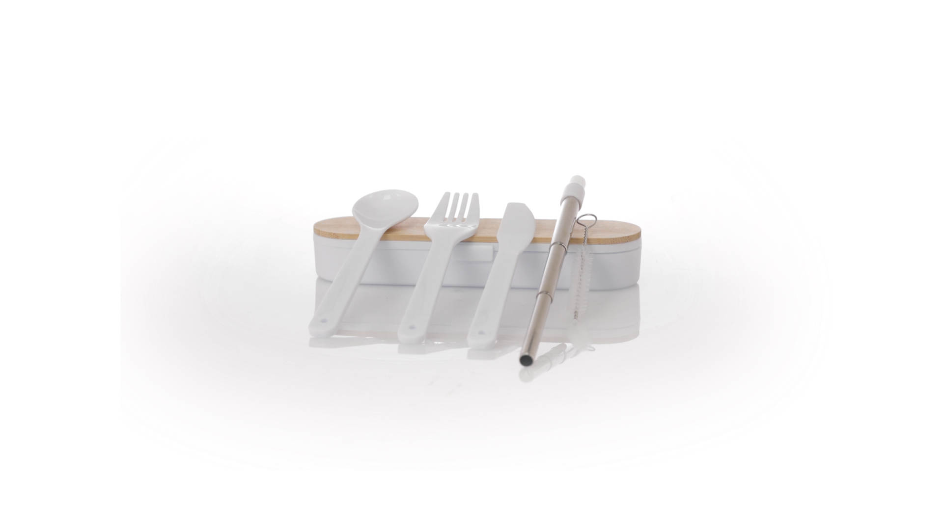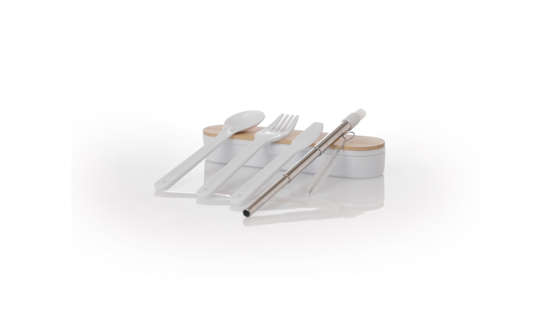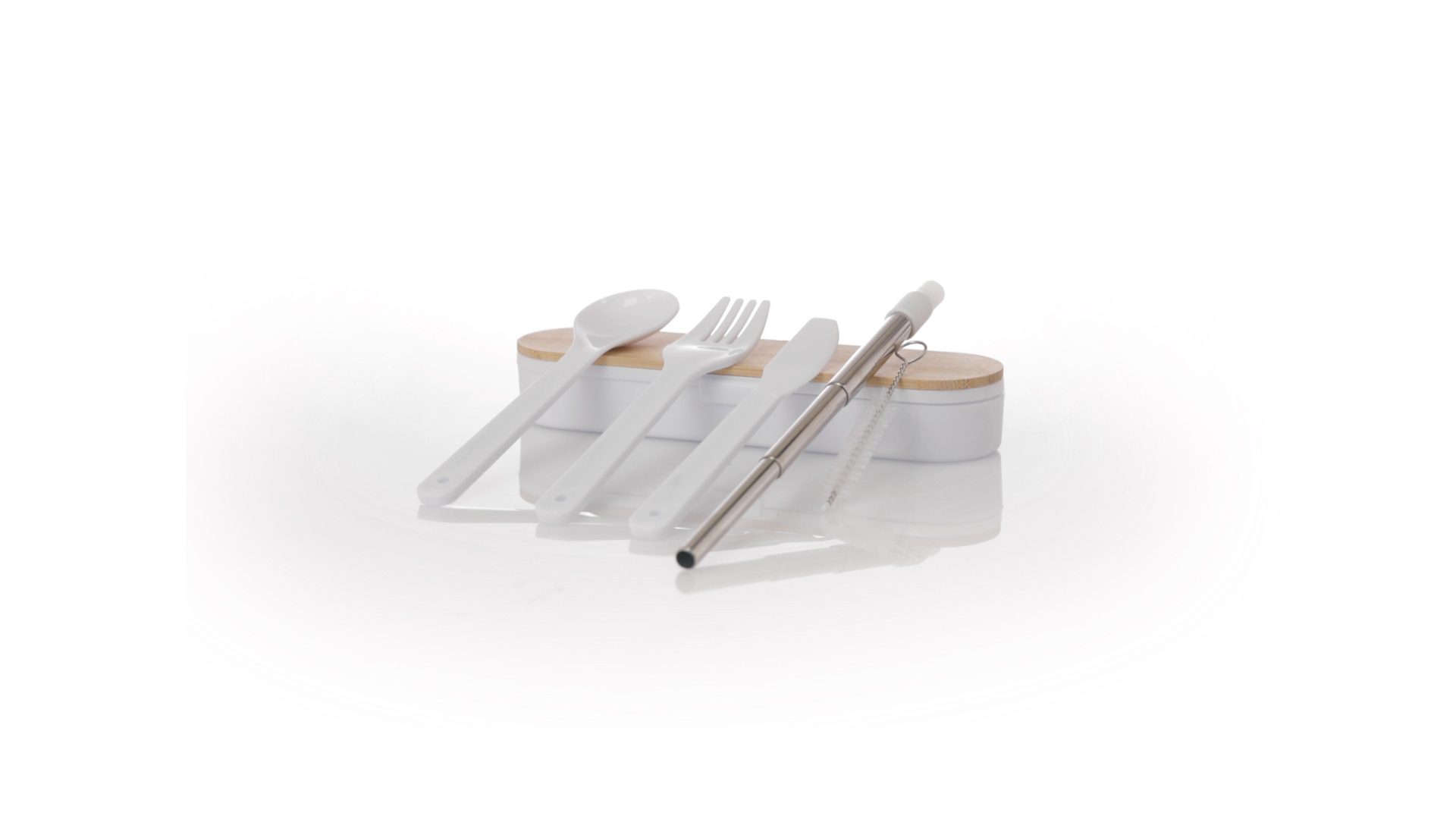 Besteckset aus PP und BPA-frei, mit passender Präsentationsbox und mit Bambusdeckel. Dieses Komplettset beinhaltet Löffel, Gabel, Messer und Faltstrohhalm mit Reiniger. Zertifiziert in Lebensmittelqualität, garantiert Sicherheit, wenn Lebensmittel mit dem zur Herstellung des Produkts verwendeten Material in Kontakt kommen. Präsentiert in einer einzelnen recycelten Tasche.