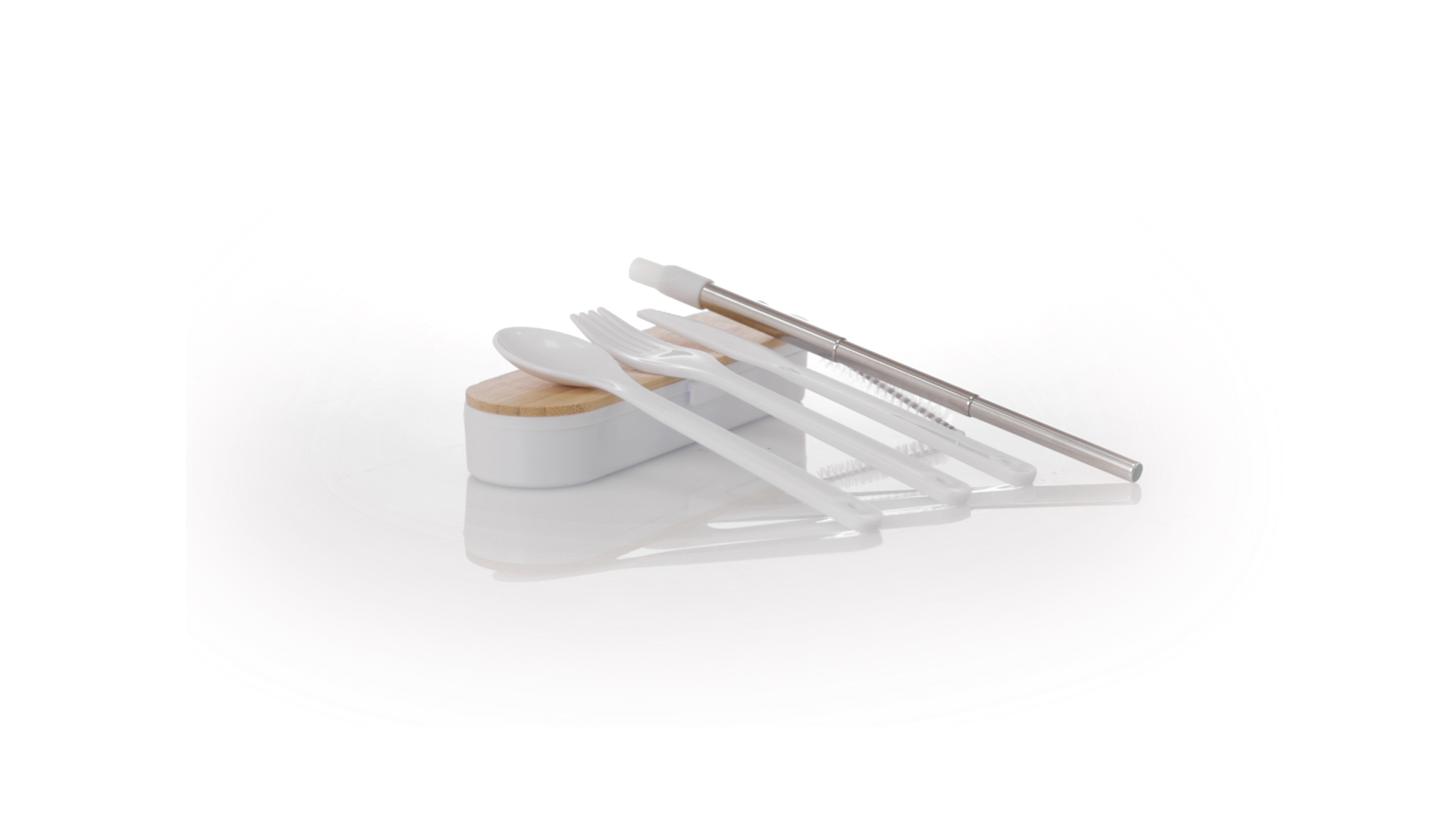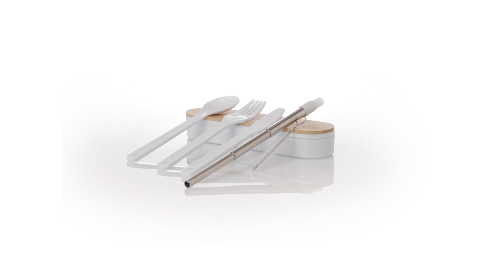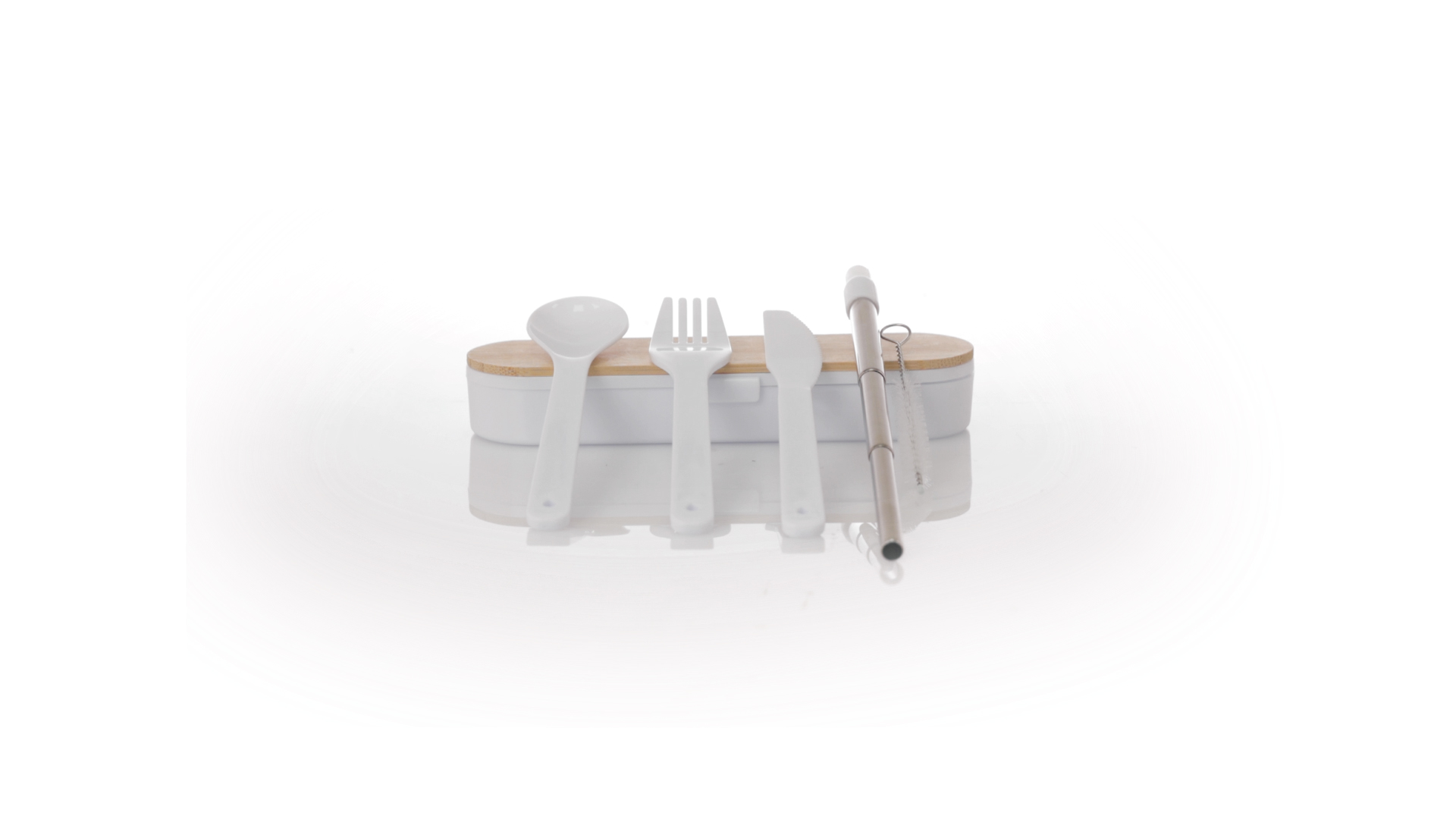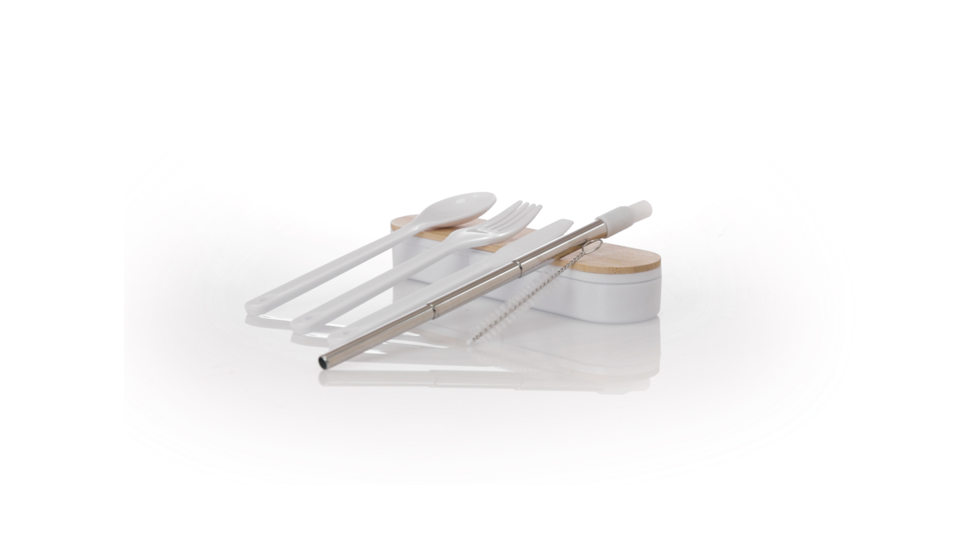 Besteckset aus PP und BPA-frei, mit passender Präsentationsbox und mit Bambusdeckel. Dieses Komplettset beinhaltet Löffel, Gabel, Messer und Faltstrohhalm mit Reiniger. Zertifiziert in Lebensmittelqualität, garantiert Sicherheit, wenn Lebensmittel mit dem zur Herstellung des Produkts verwendeten Material in Kontakt kommen. Präsentiert in einer einzelnen recycelten Tasche.