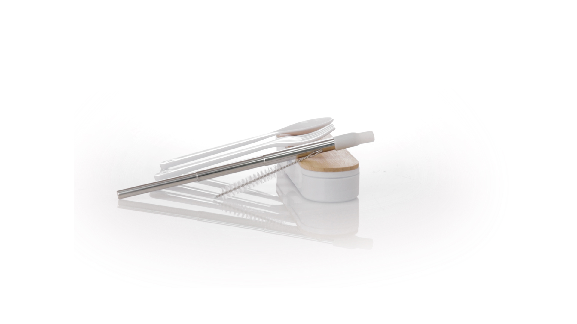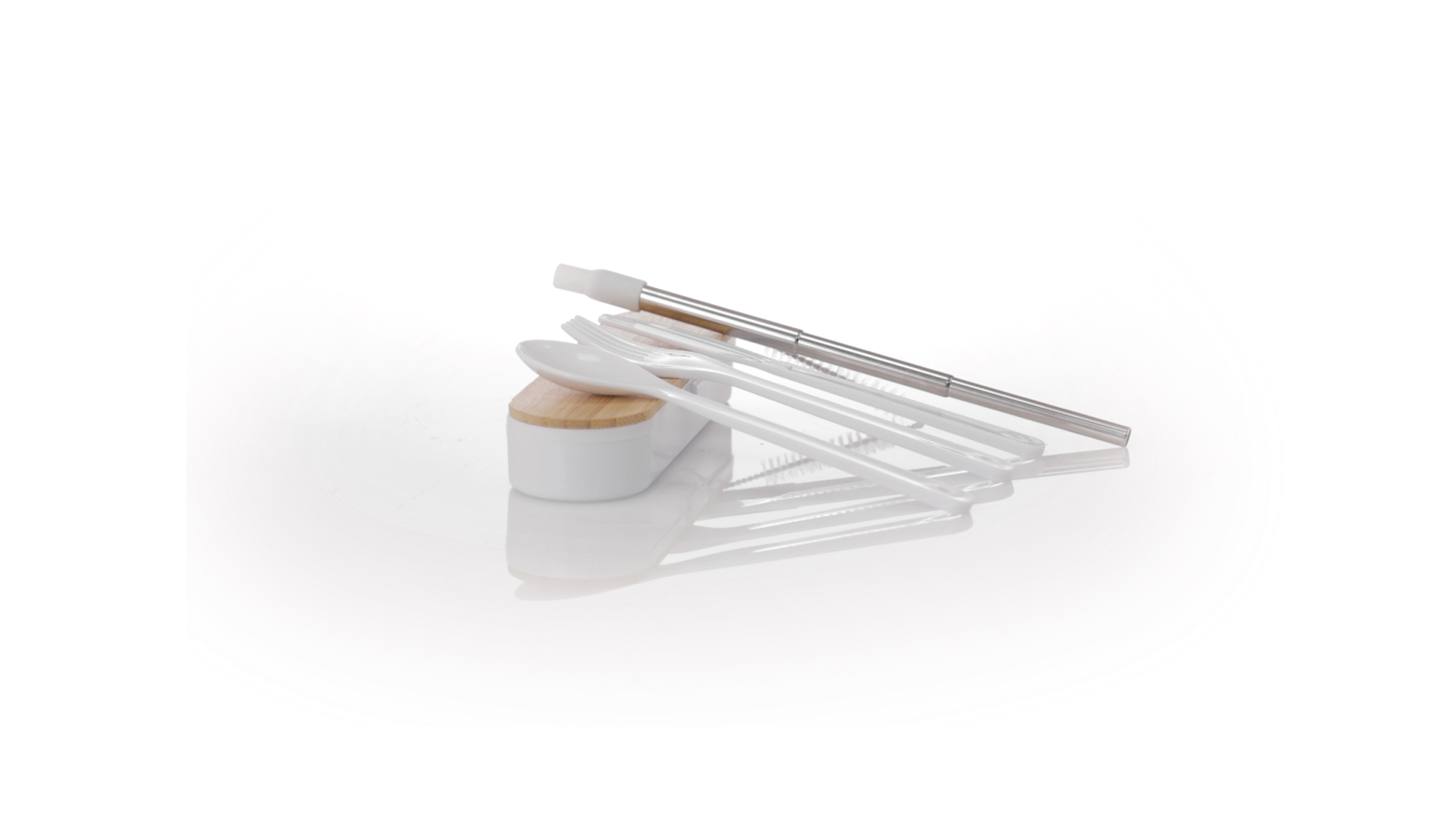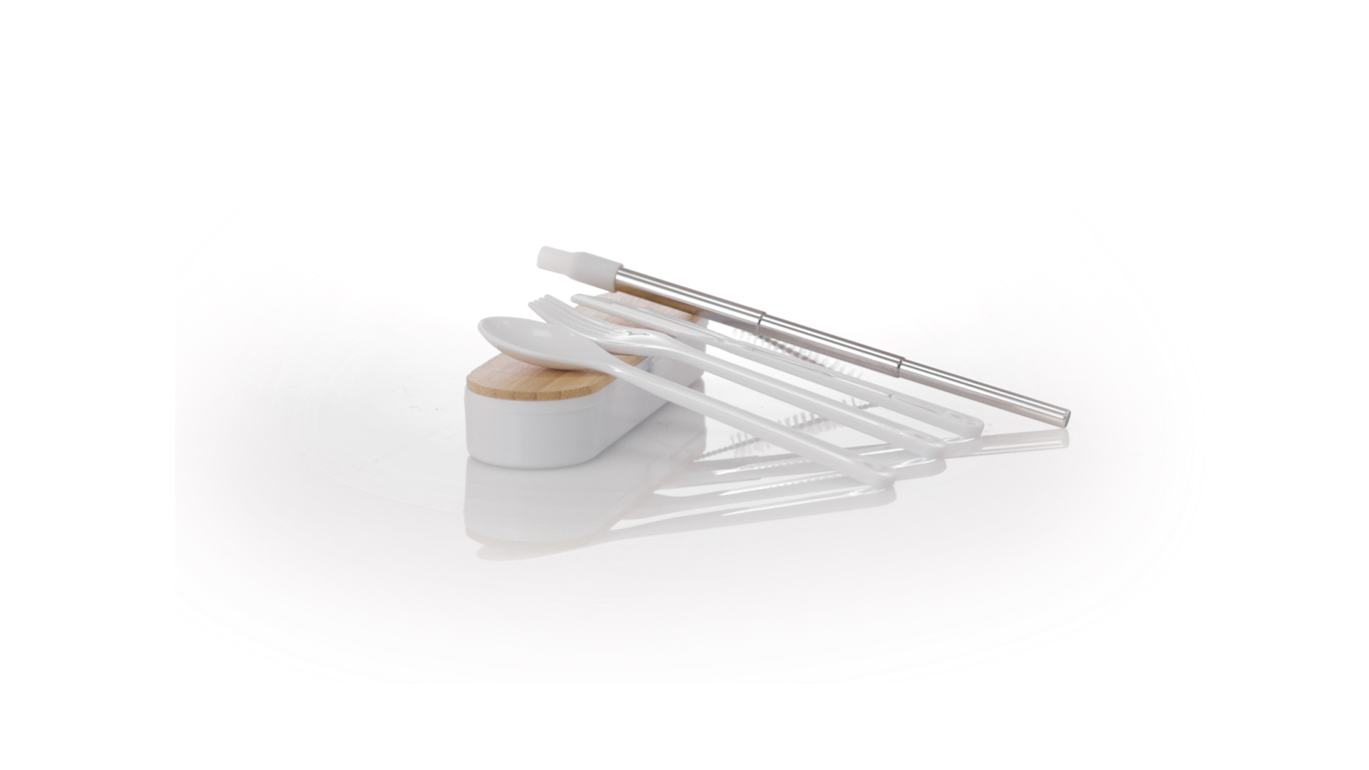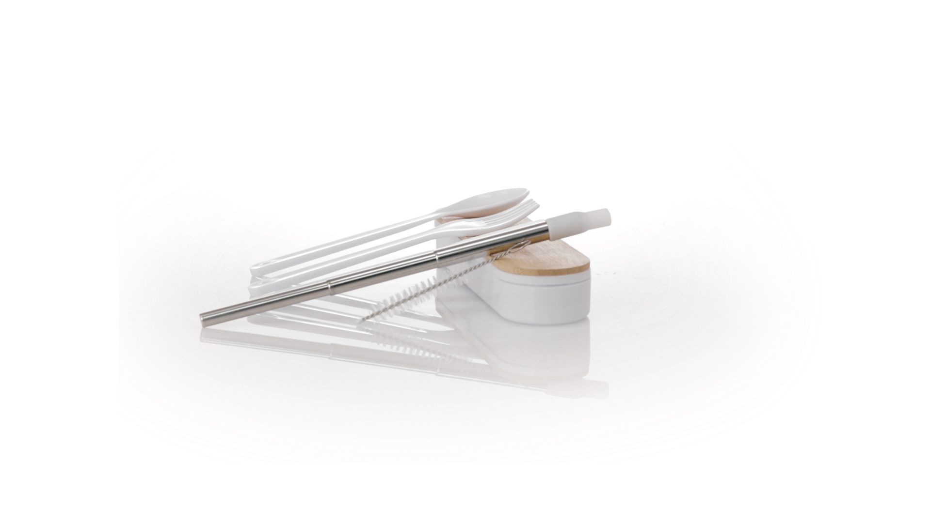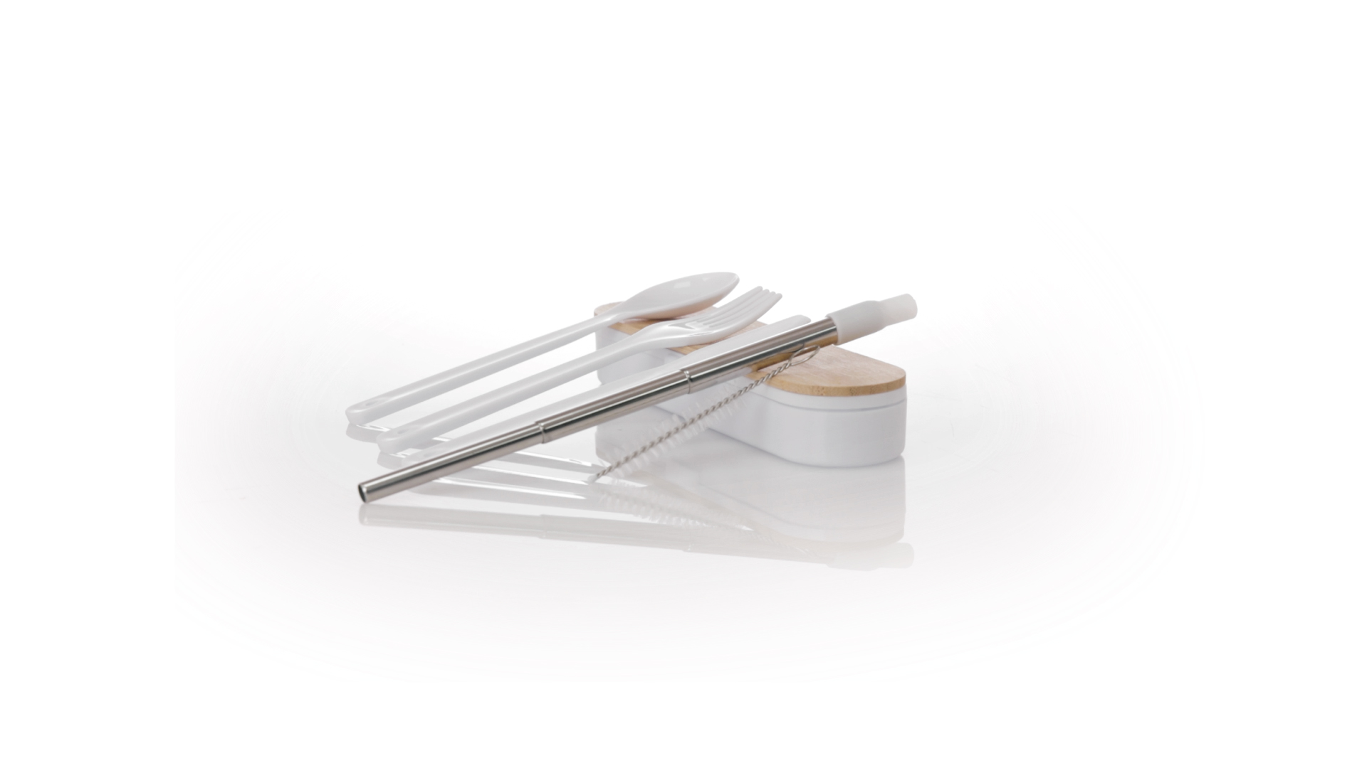 Besteckset aus PP und BPA-frei, mit passender Präsentationsbox und mit Bambusdeckel. Dieses Komplettset beinhaltet Löffel, Gabel, Messer und Faltstrohhalm mit Reiniger. Zertifiziert in Lebensmittelqualität, garantiert Sicherheit, wenn Lebensmittel mit dem zur Herstellung des Produkts verwendeten Material in Kontakt kommen. Präsentiert in einer einzelnen recycelten Tasche.